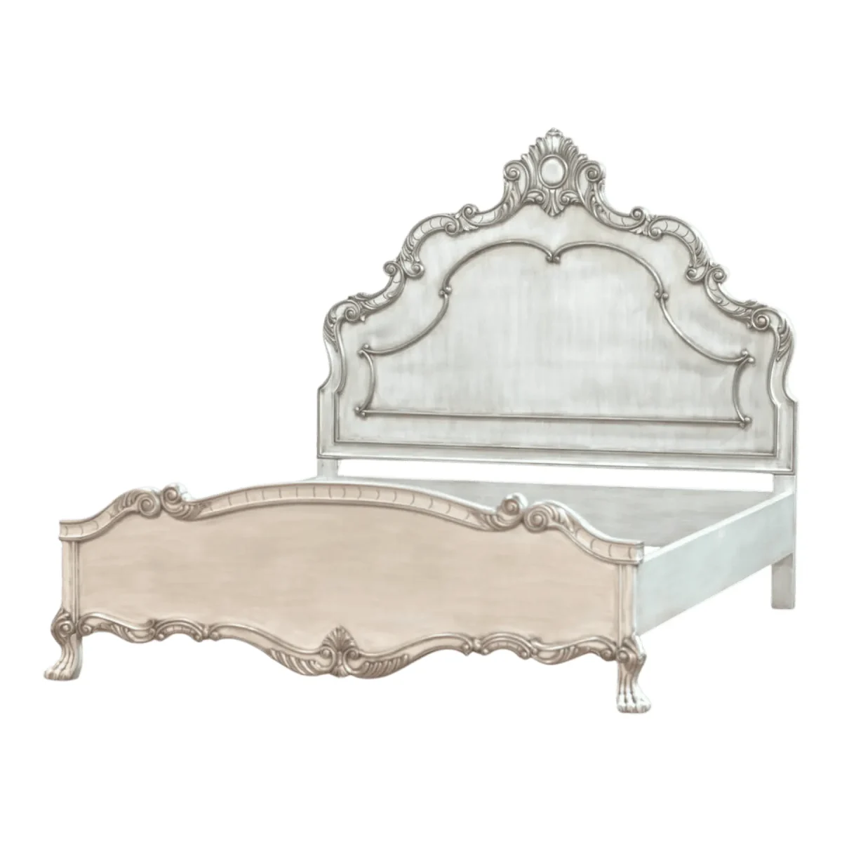 Inspired by French Rococo architecture this bed features a majestic headboard with shell motifs and flowing acanthus leaves designed to create a sense of grandeur and historical weight It serves as a romantic focal point that marries classical European artistry with the durability of kiln-dried tropical hardwoods for a timeless aesthetic