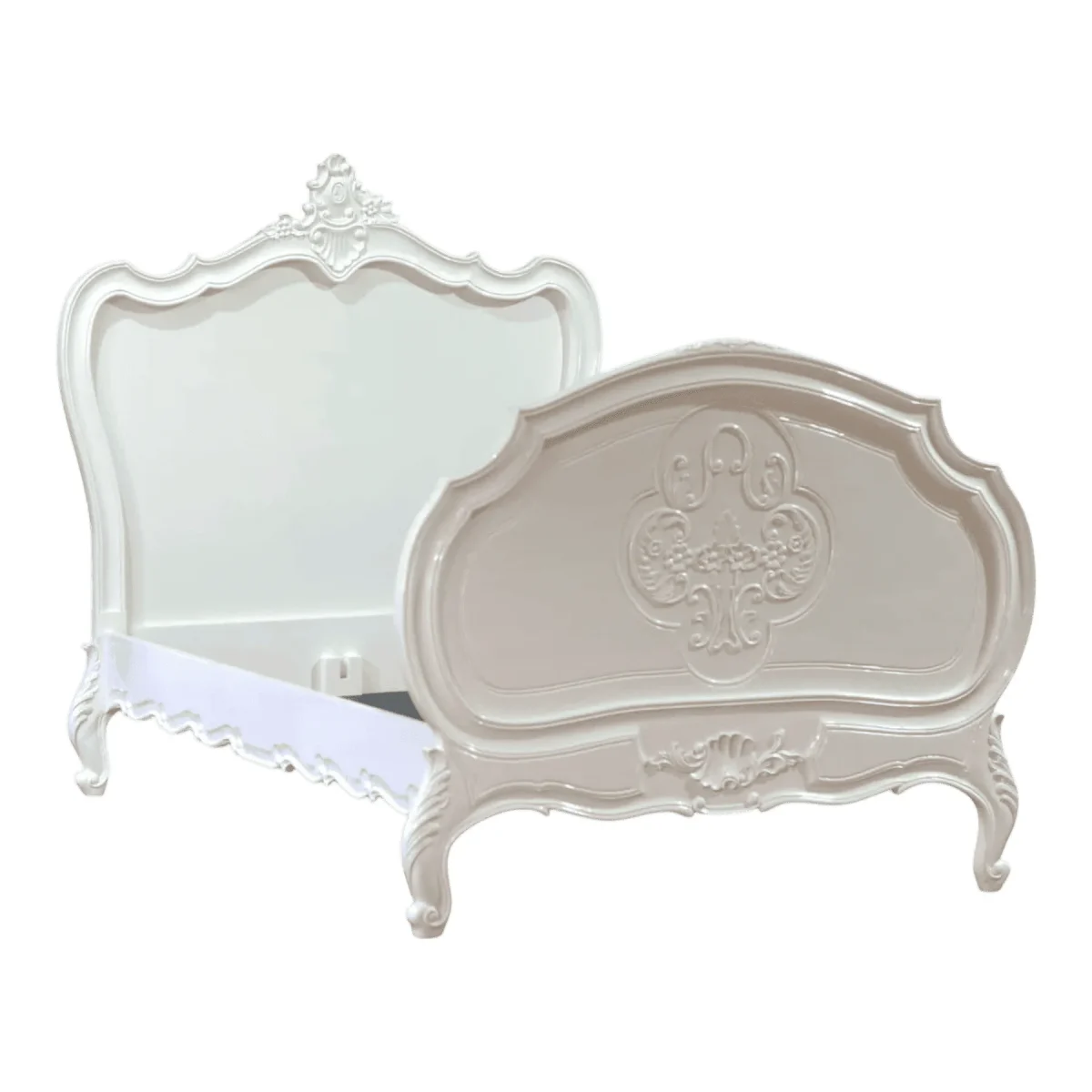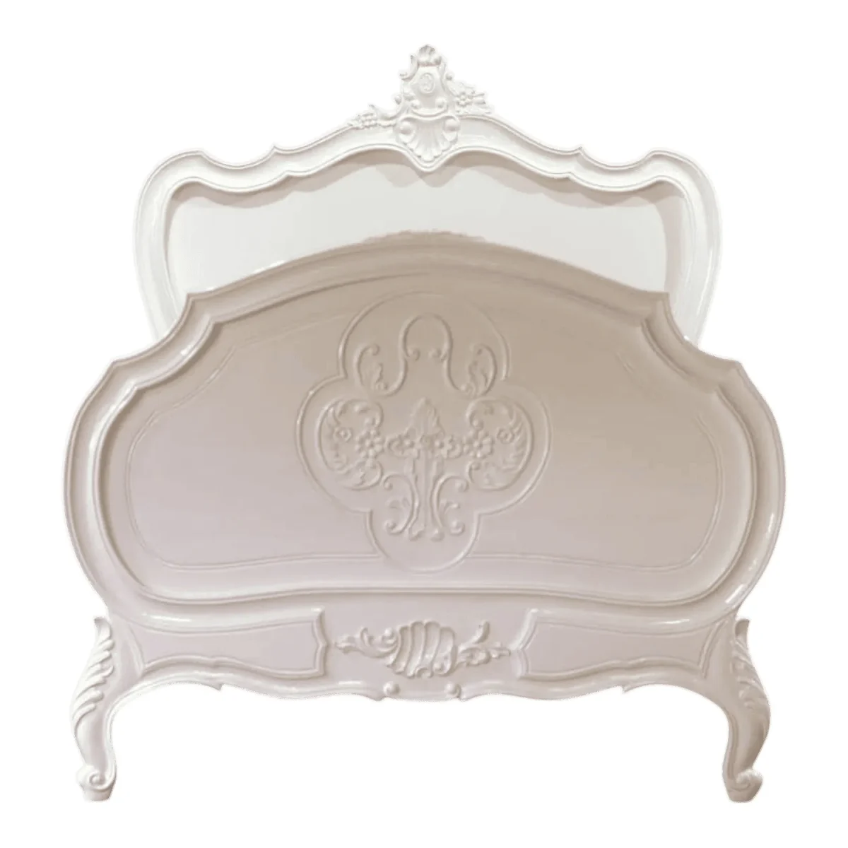 Dream in a world of ethereal beauty with this magnificent hand-carved bed frame finished in a soft luminous cream The sweeping curves of the headboard and footboard feature intricate floral relief carvings that evoke the grace of a Parisian palace suite This bed is designed to be the crown jewel of your sleeping sanctuary providing a romantic backdrop for your finest linens and pillows The elegant cabriole legs and flowing silhouette create a sense of light and airy luxury even with its substantial presence Each element is crafted with meticulous attention to detail from the balanced proportions to the smooth satiny finish that is gentle to the touch This bed is more than just furniture it is an invitation to a lifetime of restful nights and beautiful mornings in a space that reflects your passion for exceptional craftsmanship and refined style
