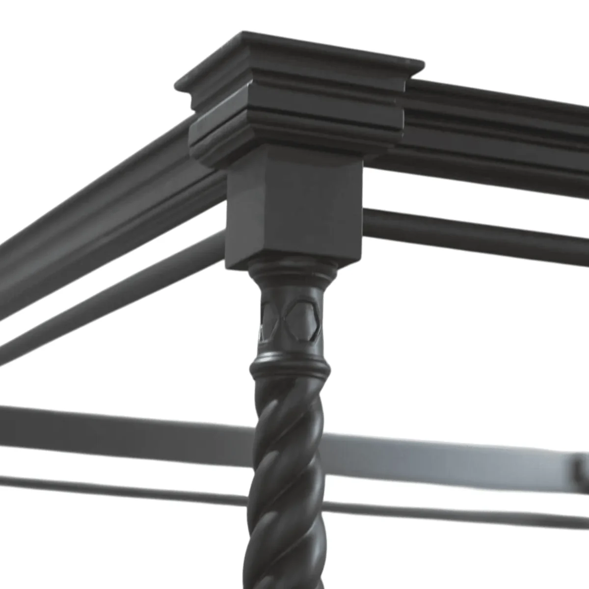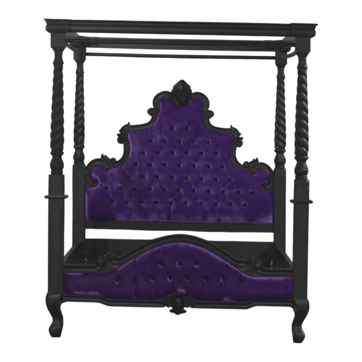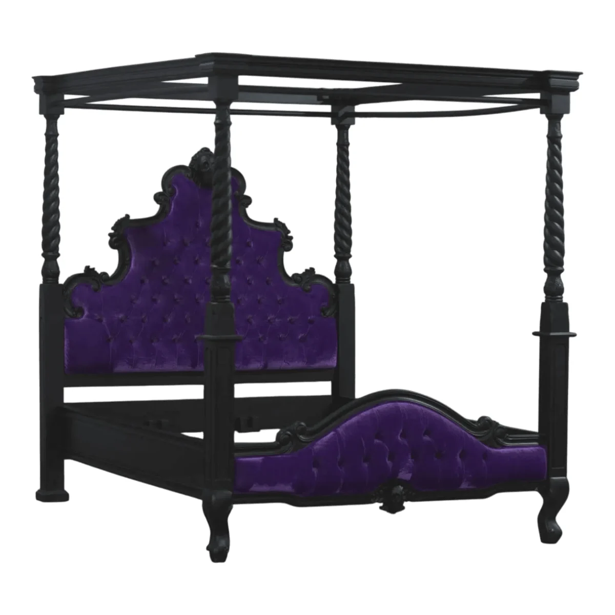 Transform your bedroom into a dramatic gothic retreat with this stunning four-poster canopy bed The frame is constructed from solid mahogany finished in a deep midnight black that emphasizes the twisted rope carvings of the pillars The headboard and footboard are upholstered in a vibrant royal purple velvet featuring deep diamond tufting that adds both comfort and a splash of regal color Above the structure supports a clean rectangular canopy frame allowing for the addition of sheer drapes or heavy silks to customize your level of privacy This bed is a statement of power and mystery designed for those who want their private quarters to feel like a fortified sanctuary of luxury and rest Its sturdy build and striking color palette make it the ultimate centerpiece for a master suite