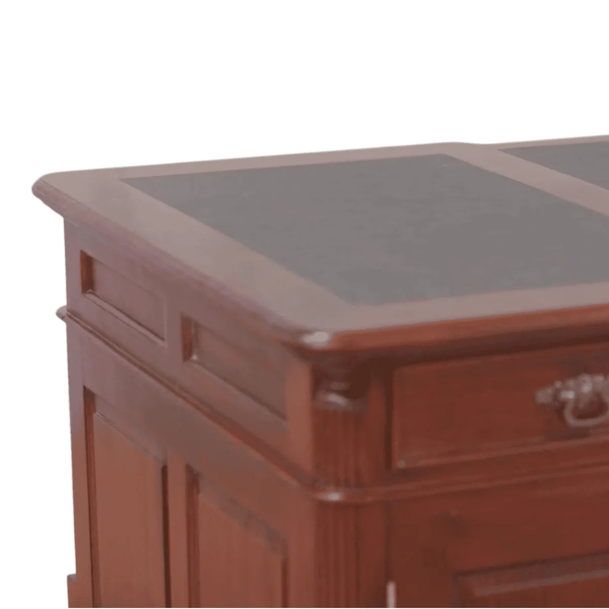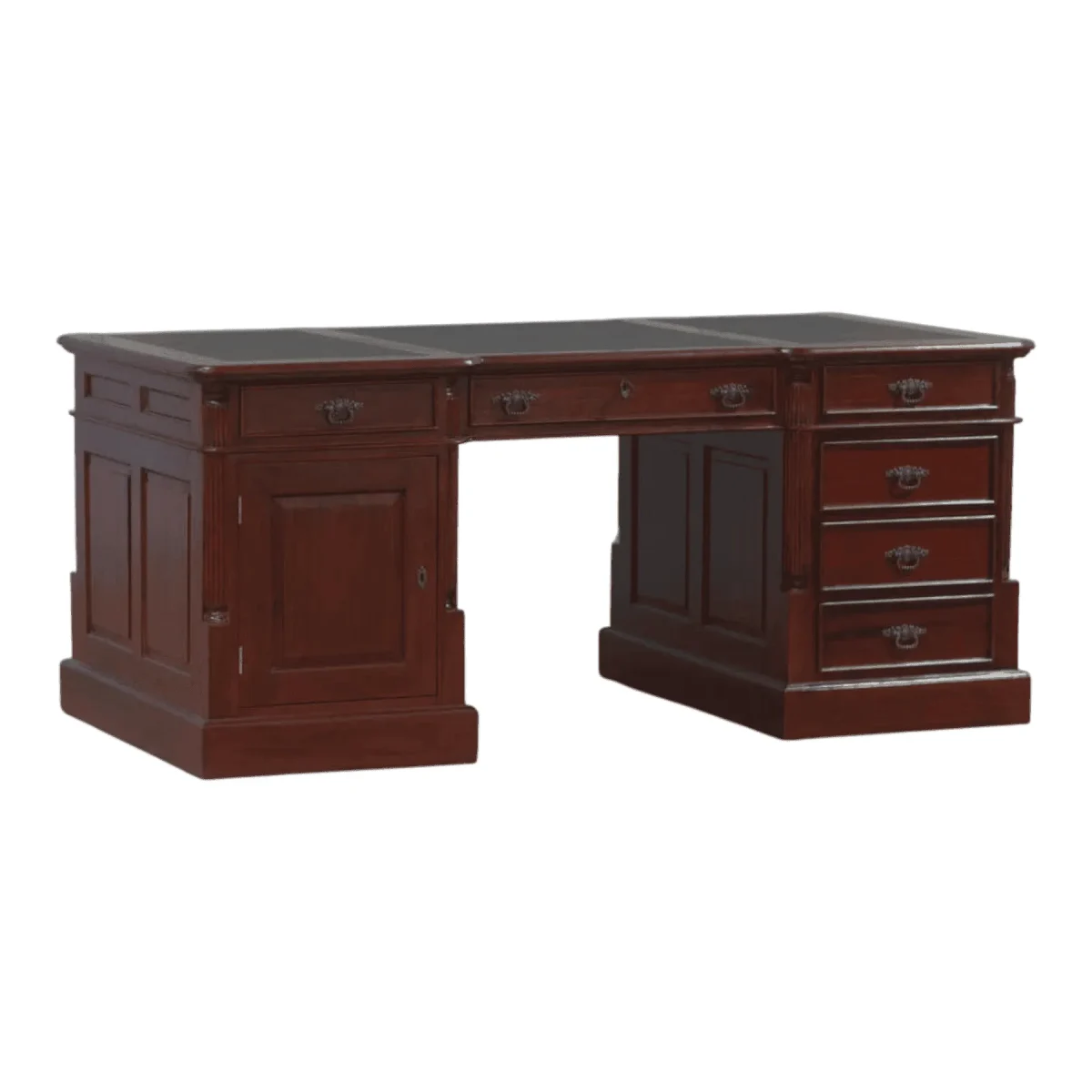 This massive pedestal desk is the ultimate symbol of traditional professional success featuring a deep mahogany finish and a expansive leather-inlay top divided into three logical work zones The left pedestal hides a large storage cabinet while the right side provides a stack of four drawers for meticulous organization of files and stationery Traditional English styling is evident in the plinth base and the fluted corner columns which give the desk a sense of permanence and architectural weight Imagine the focus and clarity that comes from working at a desk designed for serious thought where the rich wood grain and heavy brass pulls remind you of the quality of your work This desk is an heirloom piece built to host decades of decisions and creative breakthroughs providing a stable and impressive foundation for your home or executive office environment