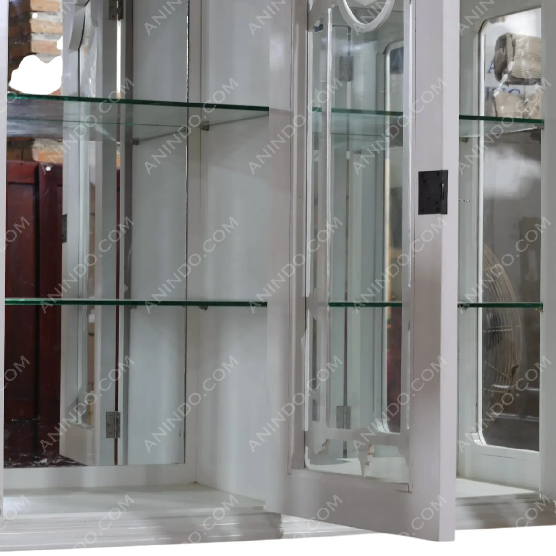 Primary Frame: Solid Mahogany Wood | Joinery: Traditional Cabinetry | Finish: Matte/Satin White Paint | Accents: Silver Leaf / Gilt, Glass Shelves, Mirrored Back Panel.
