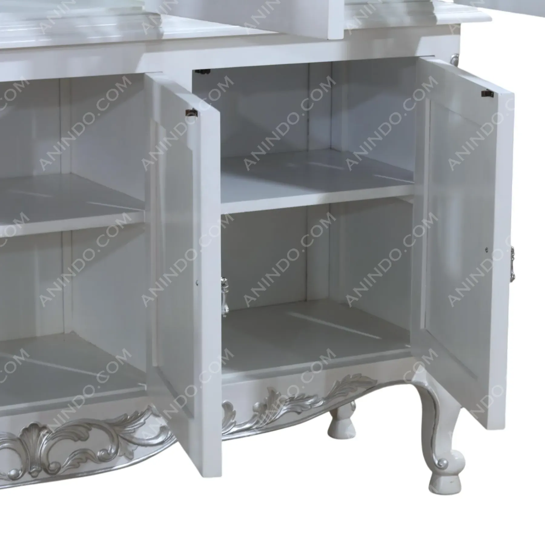This piece softens the traditional opulence of the Rococo style with a light, airy color palette. The white and silver combination feels contemporary and less formal than dark woods, while the elaborate C-scrolls, cabriole legs, and ornate carvings maintain a sense of regal elegance.