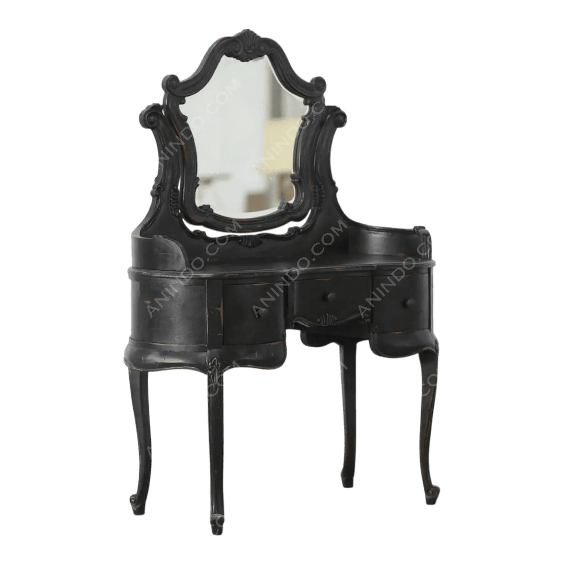 Embrace dramatic, gothic elegance with the Chevalier Noir Vanity This piece commands attention with its deep ebonized finish, artfully distressed to reveal hints of warm terracotta wood beneath Its design is pure French Rococo, featuring serpentine curves, ornate acanthus-leaf carvings, and graceful cabriole legs The bombe-style drawers swell outwards, adding a sense of movement and opulence The intricately framed mirror pivots, crowned with a signature shell-and-scroll cartouche Three drawers offer ample space for grooming essentials, making this as functional as it is beautiful This vanity is an heirloom in the making, bringing a touch of dark romance and sophisticated drama to your personal sanctuary