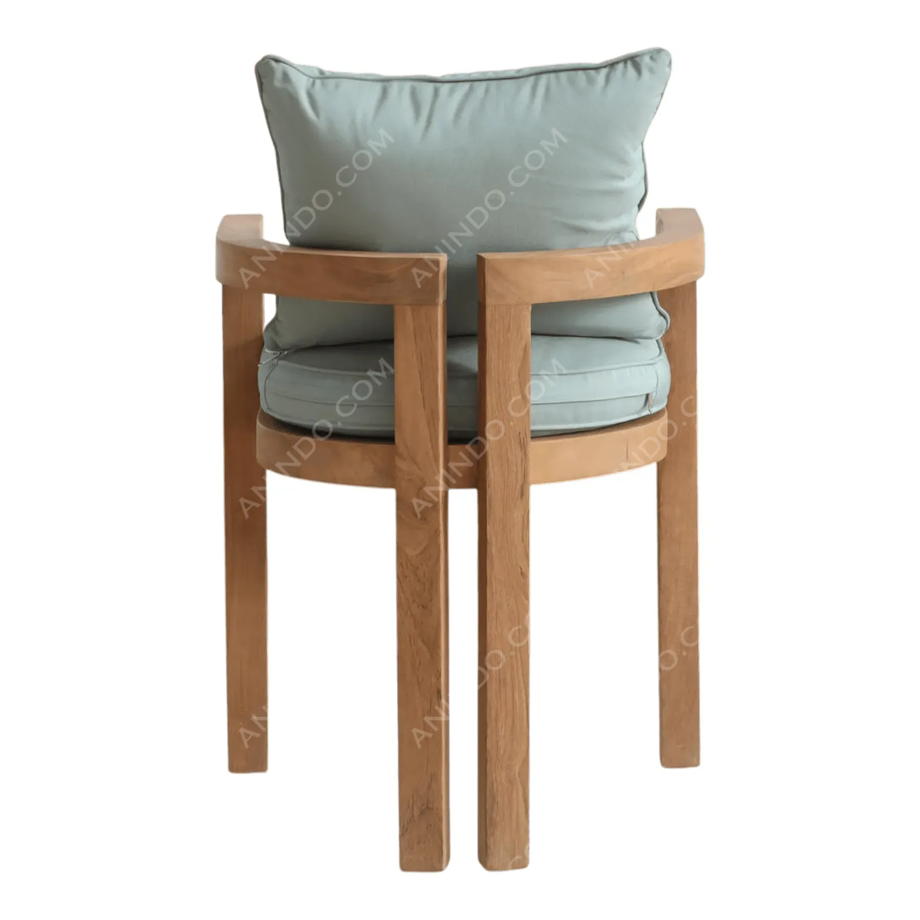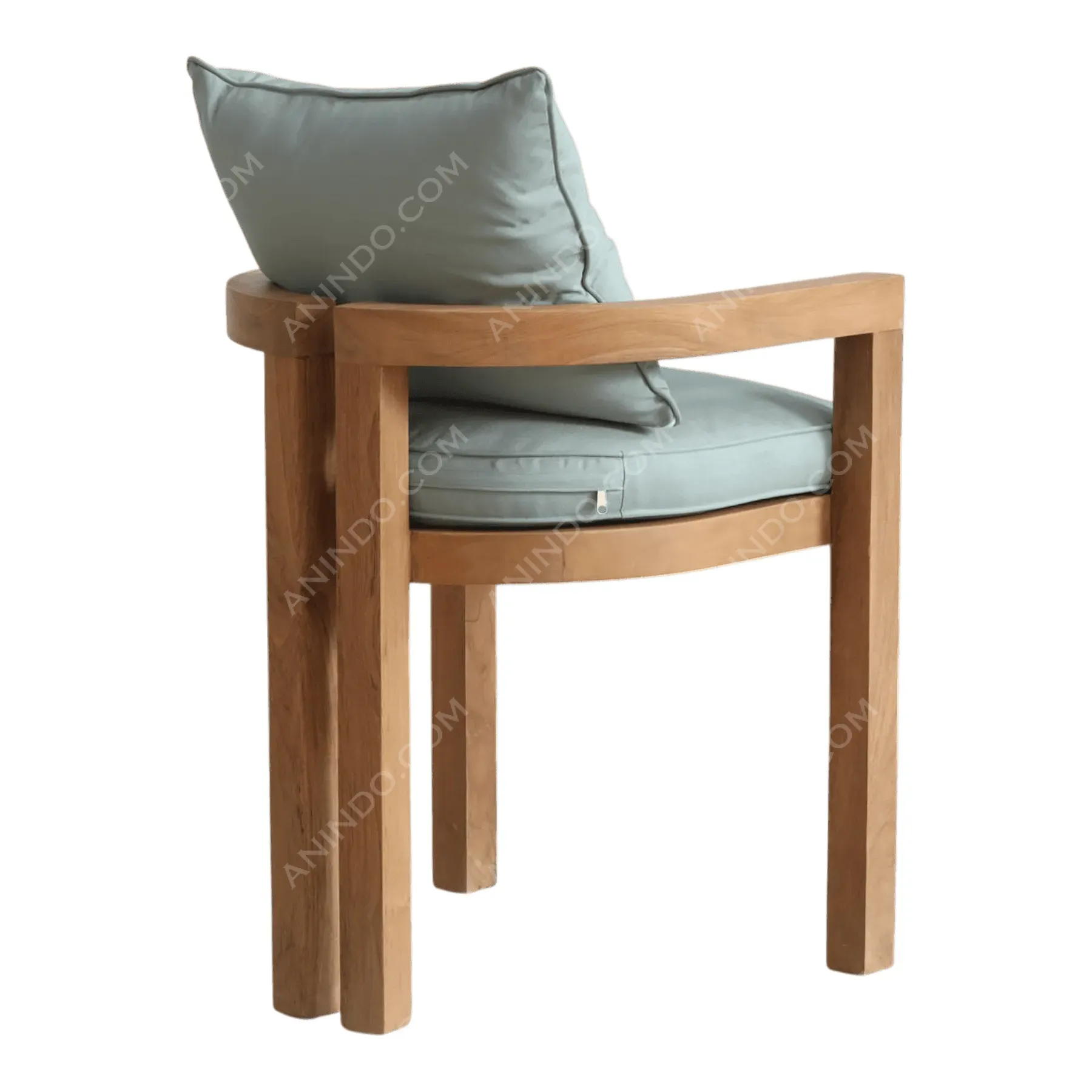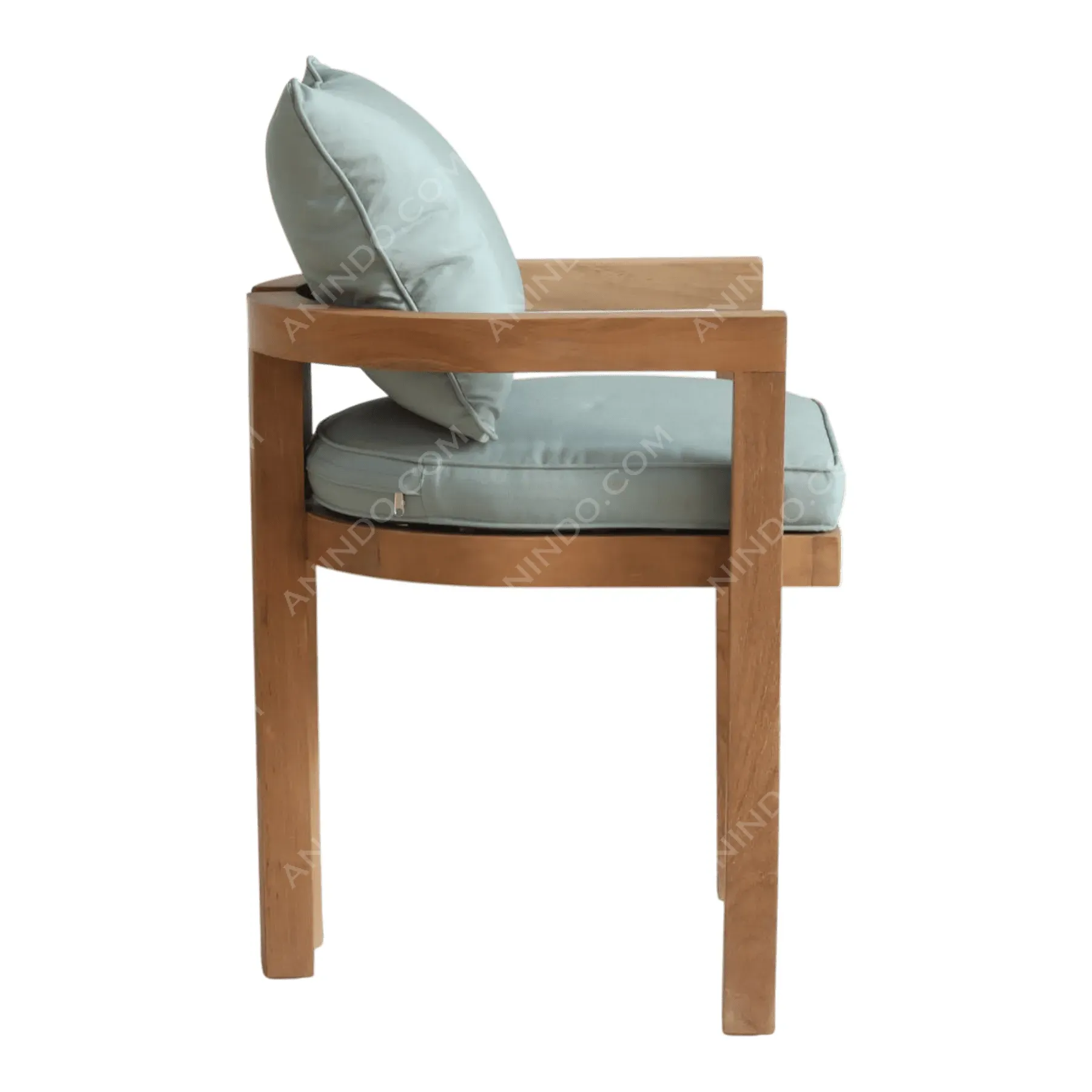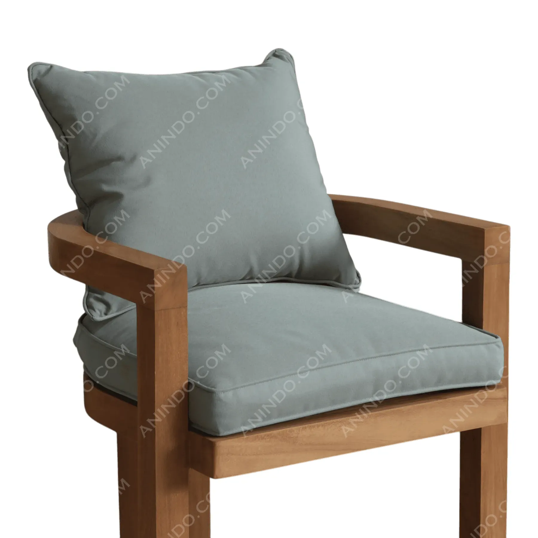 A modern armchair with a simple, solid teak frame Its clean lines and gently rounded arms create a minimalist, Scandinavian-inspired silhouette The chair is topped with plush, deep cushions—a thick seat and a soft back pillow—upholstered in a serene, light grey-blue fabric It’s a perfect blend of natural warmth and cool, contemporary comfort