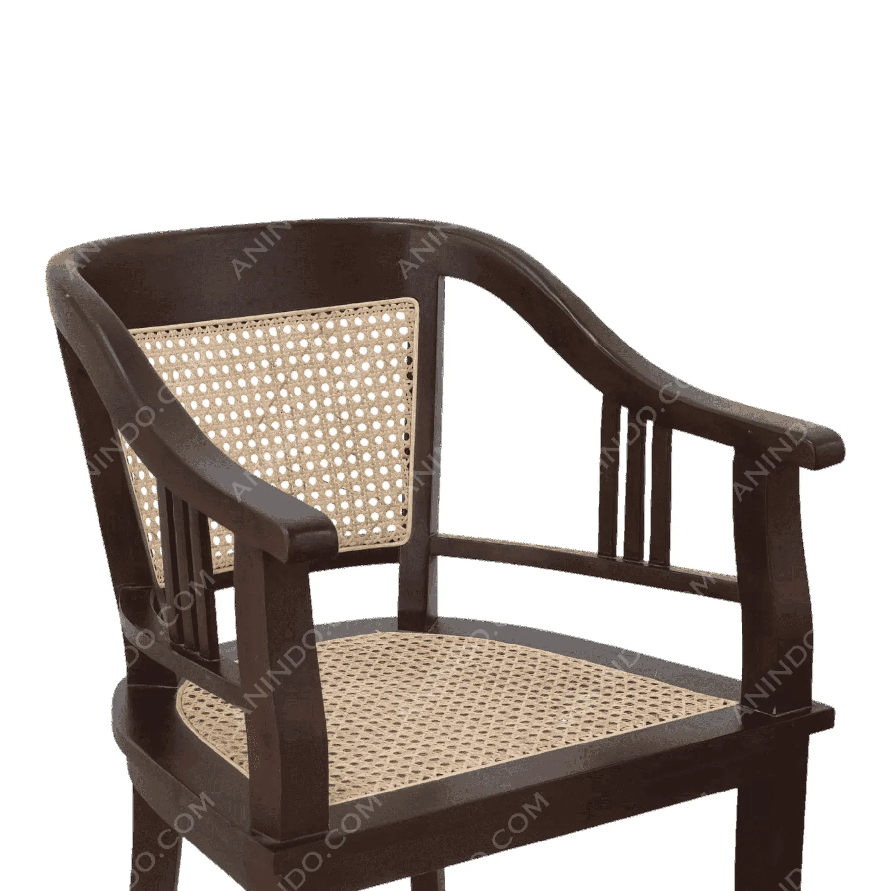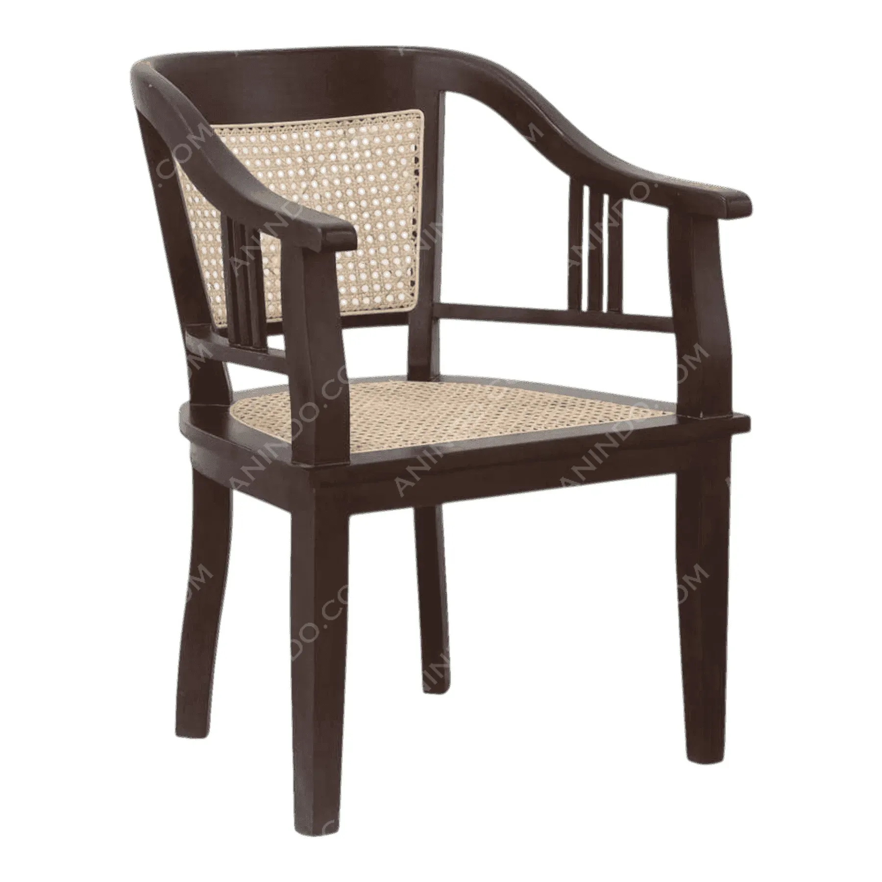 This armchair is a timeless blend of materials and form The solid, dark espresso-finished frame provides a dramatic, sophisticated structure, with gently sloping arms for comfort The true beauty lies in the airy, natural rattan cane that forms the seat and backrest This open weave provides a light, breathable contrast to the dark wood, making it perfect for any climate It’s an elegant, versatile chair, ideal for a sunroom, as a dining head-chair, or a stylish accent in a living room