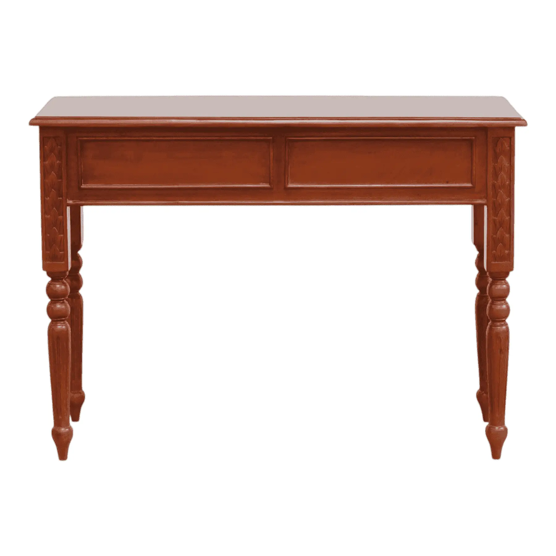 Add rustic, provincial charm to your home with this solid wood console table Its design is defined by four impressively thick, “spool” or “baluster” turned legs, giving it a sturdy, architectural character The apron features two convenient drawers with simple, antique-style loop pulls The top corners of the legs are accented with carved leaf details, adding a subtle touch of craftsmanship Finished in a warm, reddish-brown, it’s a perfect, robust table for an entryway, hallway, or as a sofa table