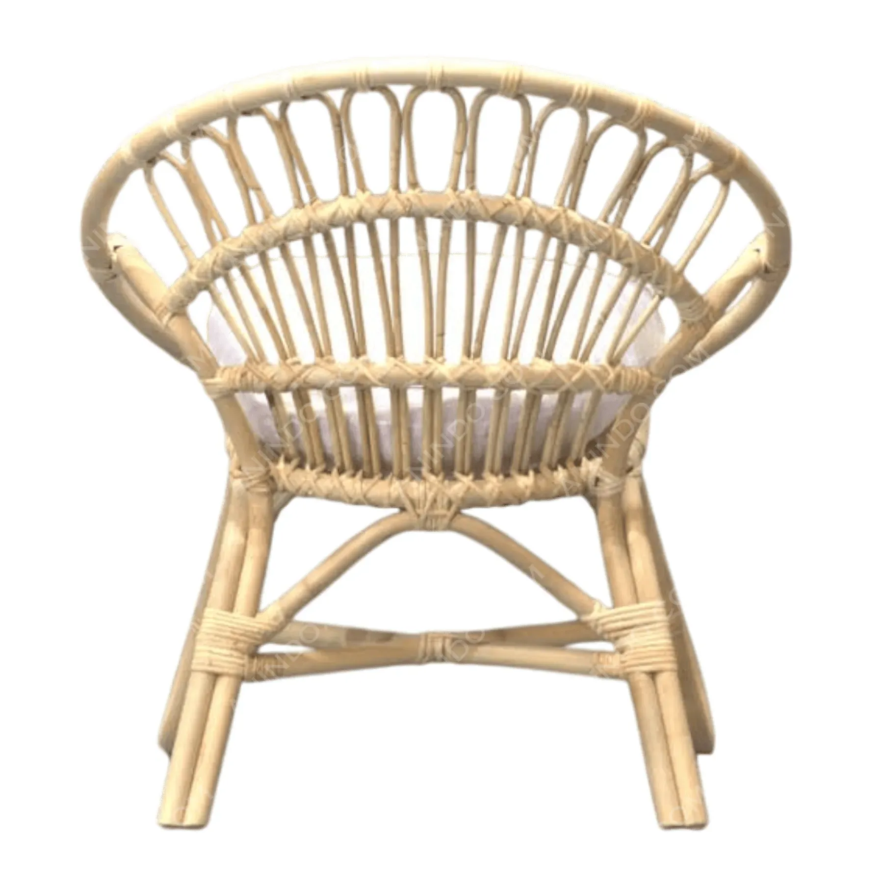 Sink into the cozy embrace of this iconic bowl-style chair A classic symbol of relaxed, bohemian living, its deep, rounded seat cradles you in comfort The entire frame is handcrafted from natural rattan, featuring a lovely looped backrest that adds a touch of airy detail The sturdy, cross-braced base provides stable support This chair comes with a plush white cushion, shown here in its protective wrapping, promising a soft and inviting spot to curl up Ideal for a bedroom corner, reading nook, or a casual living area, it’s a timeless piece that exudes comfort