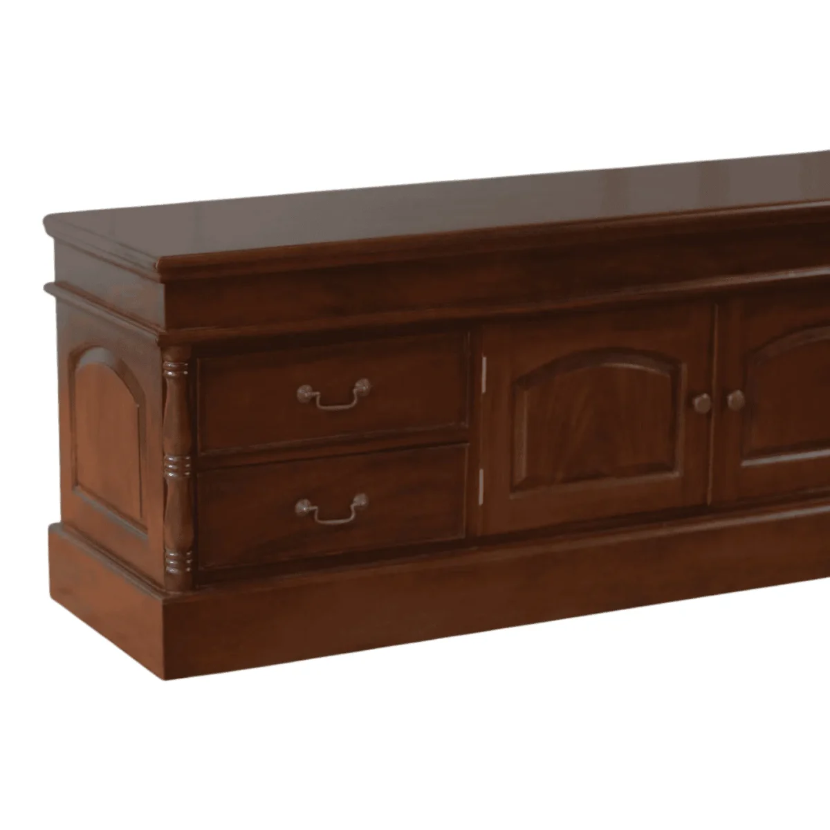 Elevate your entertainment space with this expansive media console that marries traditional Jepara craftsmanship with modern utility Featuring a balanced symmetrical design the unit boasts four deep side drawers for organized storage and two central arched panel doors that reveal spacious interior shelving The rich deep mahogany finish highlights the natural beauty of the wood grain while the ornate pilasters and subtle molding provide an air of timeless sophistication Designed to support large format displays or serve as a low-profile buffet in a formal dining room this piece acts as a foundational anchor for any interior Crafted from select heartwood and finished with a hand-rubbed protective seal it promises durability and aesthetic grace for generations to come Experience the perfect blend of architectural detail and practical living with this masterfully constructed heirloom unit