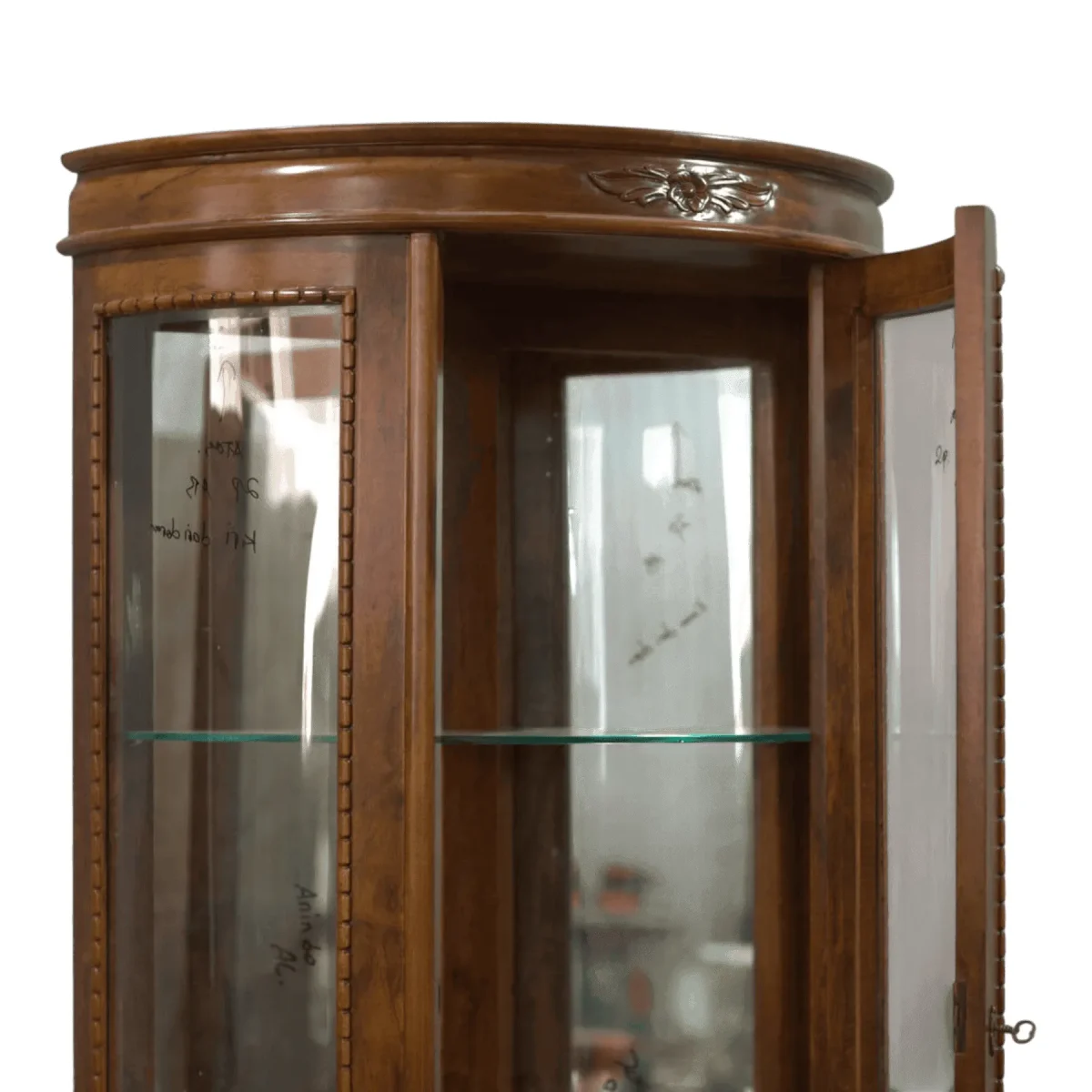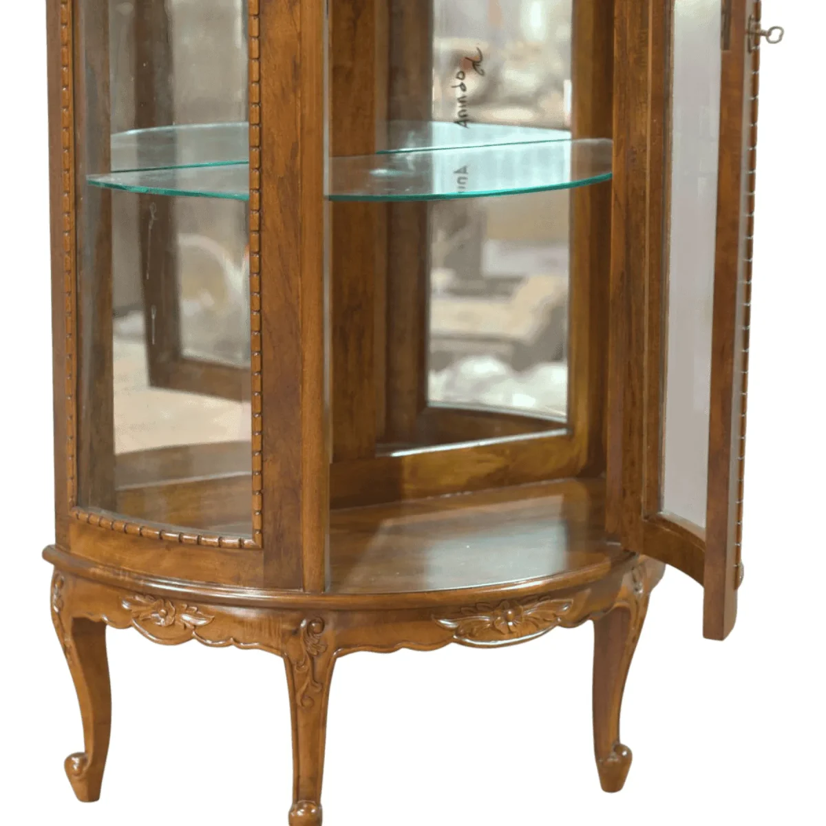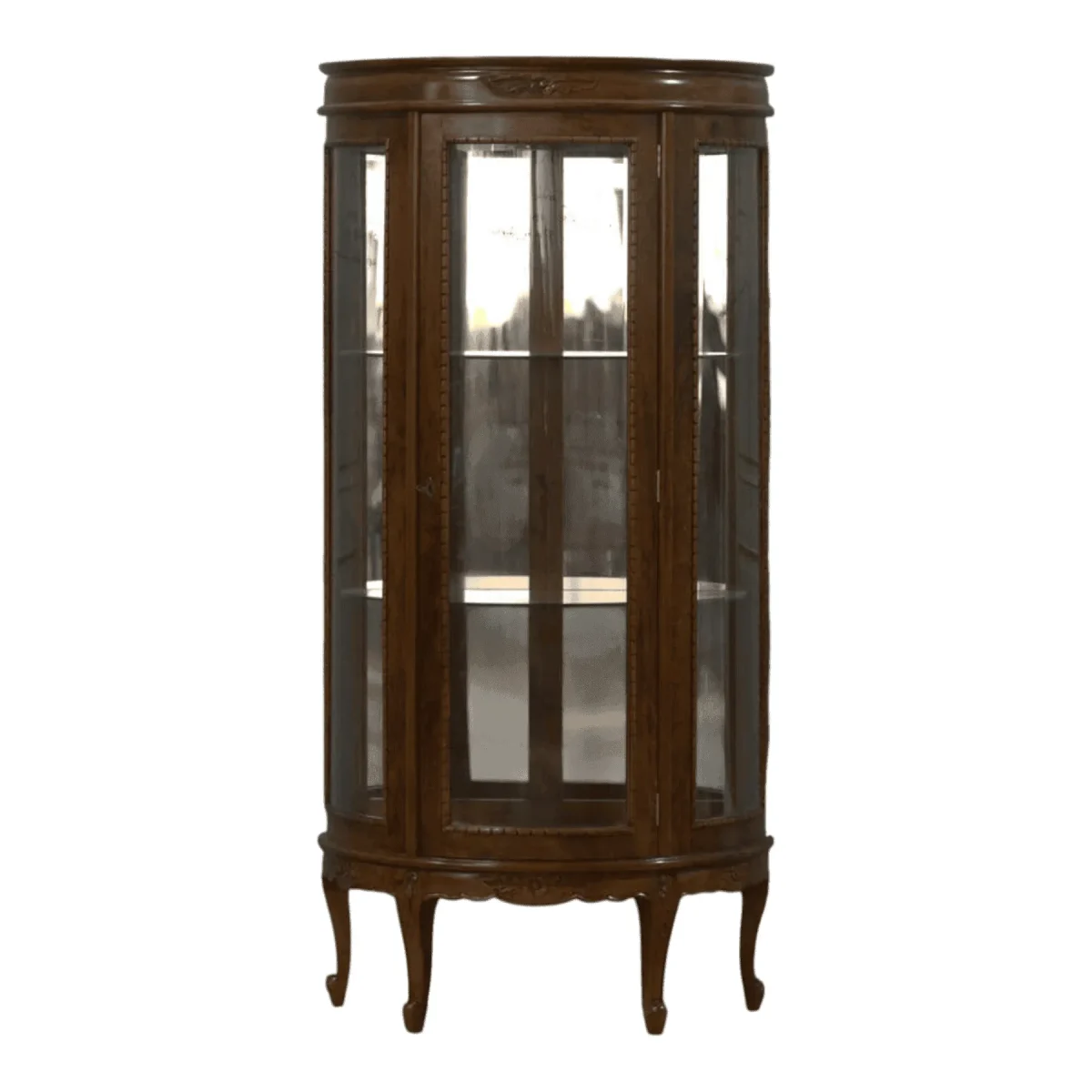 Protect and display your most cherished memories and artifacts within this exquisite rounded glass curio cabinet that offers a 180-degree view of its contents The elegant mahogany frame features three tall glass panels and interior glass shelves that allow light to permeate every level ensuring your collection is visible from all angles A subtle hand-carved crest adorns the top crown while the slender cabriole legs lift the cabinet to eye level creating a graceful presence in any corner of the home The locking door mechanism provides security for valuable items while the high-quality wood grain adds a layer of natural warmth to the transparent display This cabinet is the perfect marriage of security and visibility allowing you to share your story through the objects you love most within a frame of timeless artisan quality