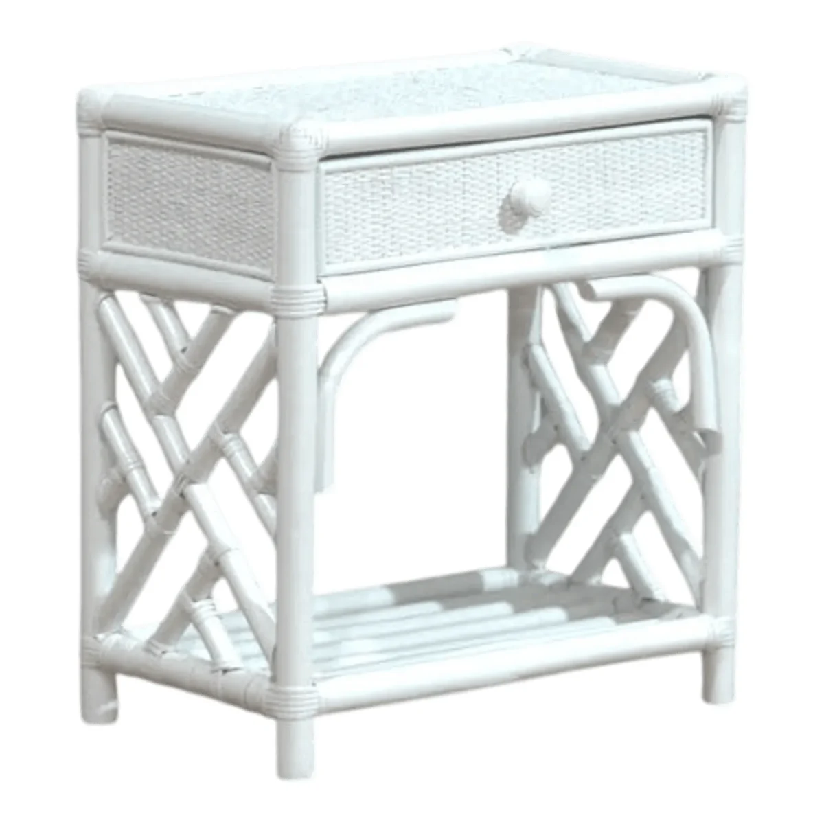 Imagine waking up to a space that feels like a permanent coastal retreat where every detail whispers serenity and grace This exquisite nightstand serves as a silent guardian of your evening rituals offering a delicate drawer for your most cherished belongings and a lower shelf for your nightly reads The intricate lattice work on the sides captures the essence of tropical breezes and sun-drenched verandas while the crisp white finish illuminates your bedroom with a sense of pure unadulterated calm It is more than just a piece of furniture it is a vessel for peace and a testament to the beauty of hand-crafted textures that invite you to slow down and breathe Crafted to endure both trends and time this piece anchors your sanctuary in a world of hectic schedules and digital noise providing a tactile connection to artisanal heritage and soft morning light