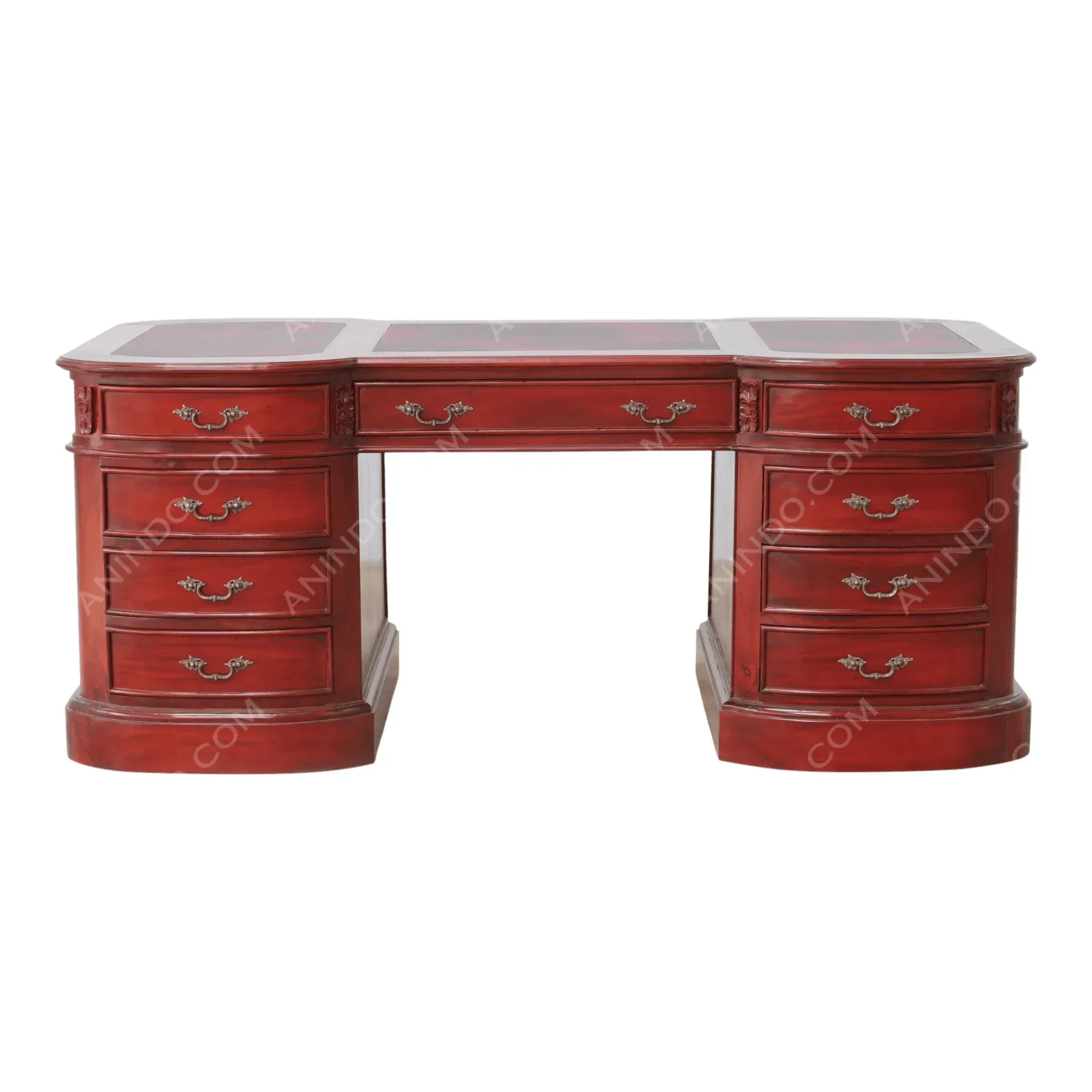 A substantial and authoritative piece, this executive desk is built for the serious professional. It features a classic double pedestal structure, with each side housing three deep storage drawers, balanced by a wide central kneehole. The top and apron are finished with traditional molding and subtle detailing, suggesting classic, enduring quality. Crafted from a rich, warm-toned Mahogany, the desk commands attention and offers vast workspace and organization. This is the centerpiece of a traditional home office or study, designed to be both highly functional and deeply impressive.