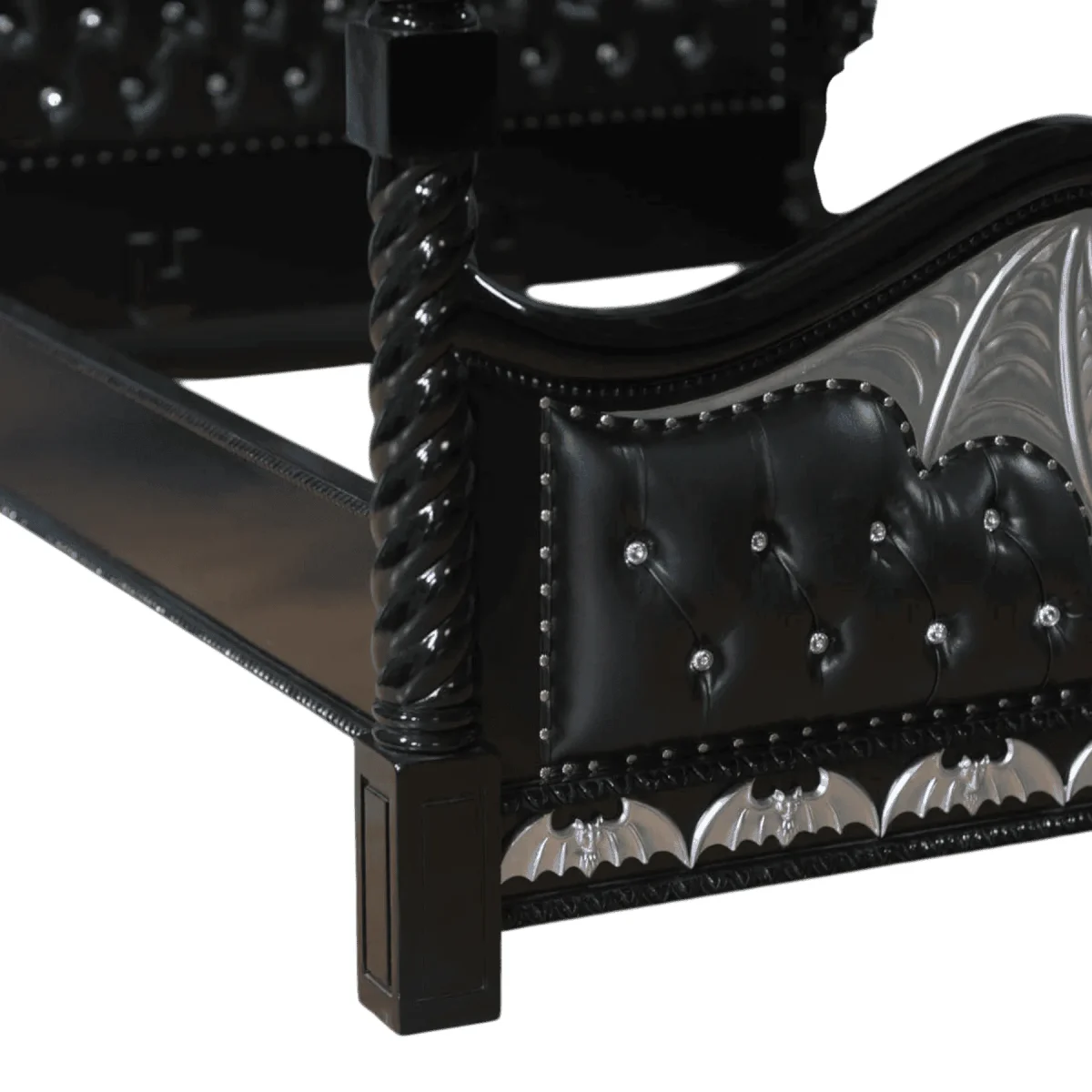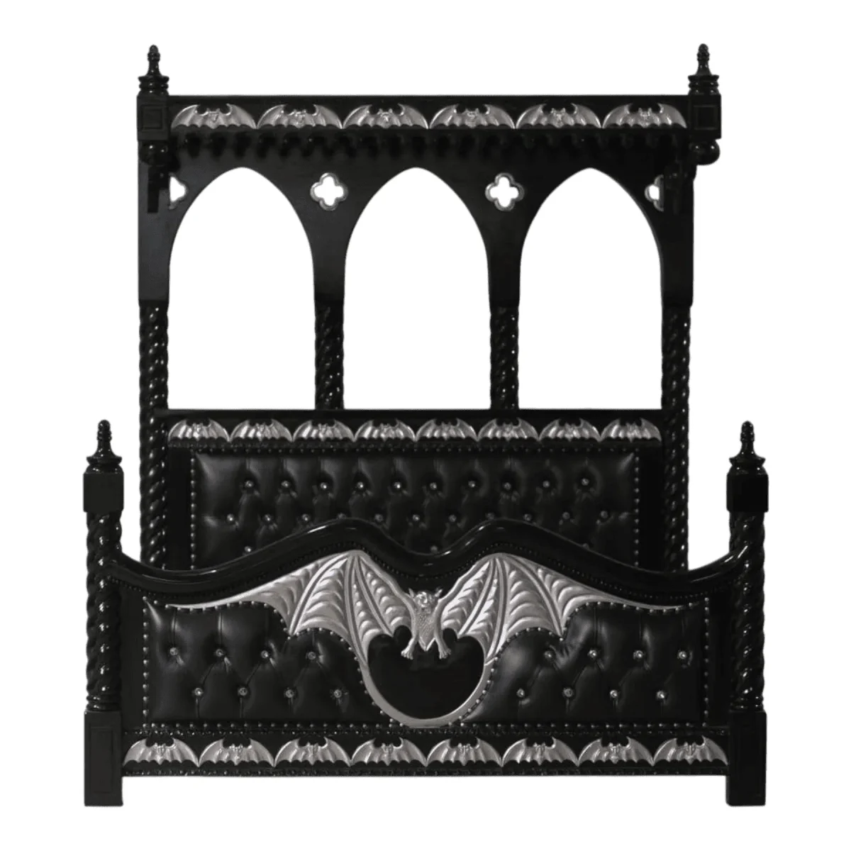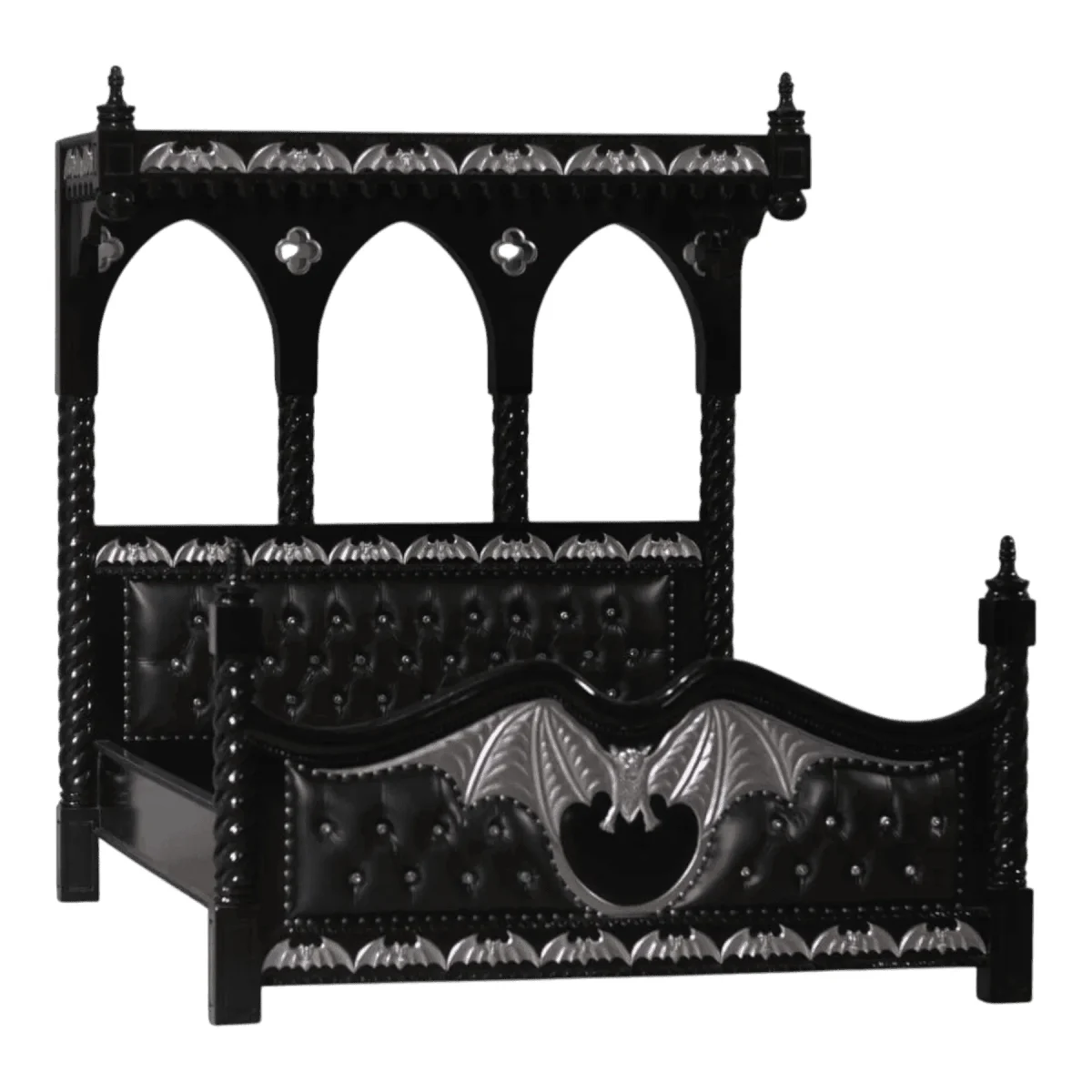 Transform your bedroom into a gothic sanctuary with this striking canopy bed that captures the mysterious beauty of the night The towering frame is constructed from solid wood and finished in a deep midnight lacquer featuring spiraling twisted posts and gothic pointed arches The headboard and footboard are upholstered in plush black leather with deep diamond tufting and crystal-style accents providing a soft contrast to the rigid architectural lines Central to the design are the hand-carved silver bat wing motifs that dominate the footboard and canopy trim creating a theatrical and romantic focal point Each silver accent is painstakingly applied to catch the moonlight creating a shimmering effect against the dark background This bed is a definitive choice for the modern gothic enthusiast looking to marry dramatic fantasy with the highest standards of master bedroom luxury