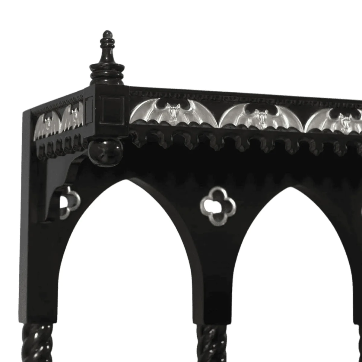 Midnight Black base with brilliant Metallic Silver highlights on the bat motifs and trim carvings