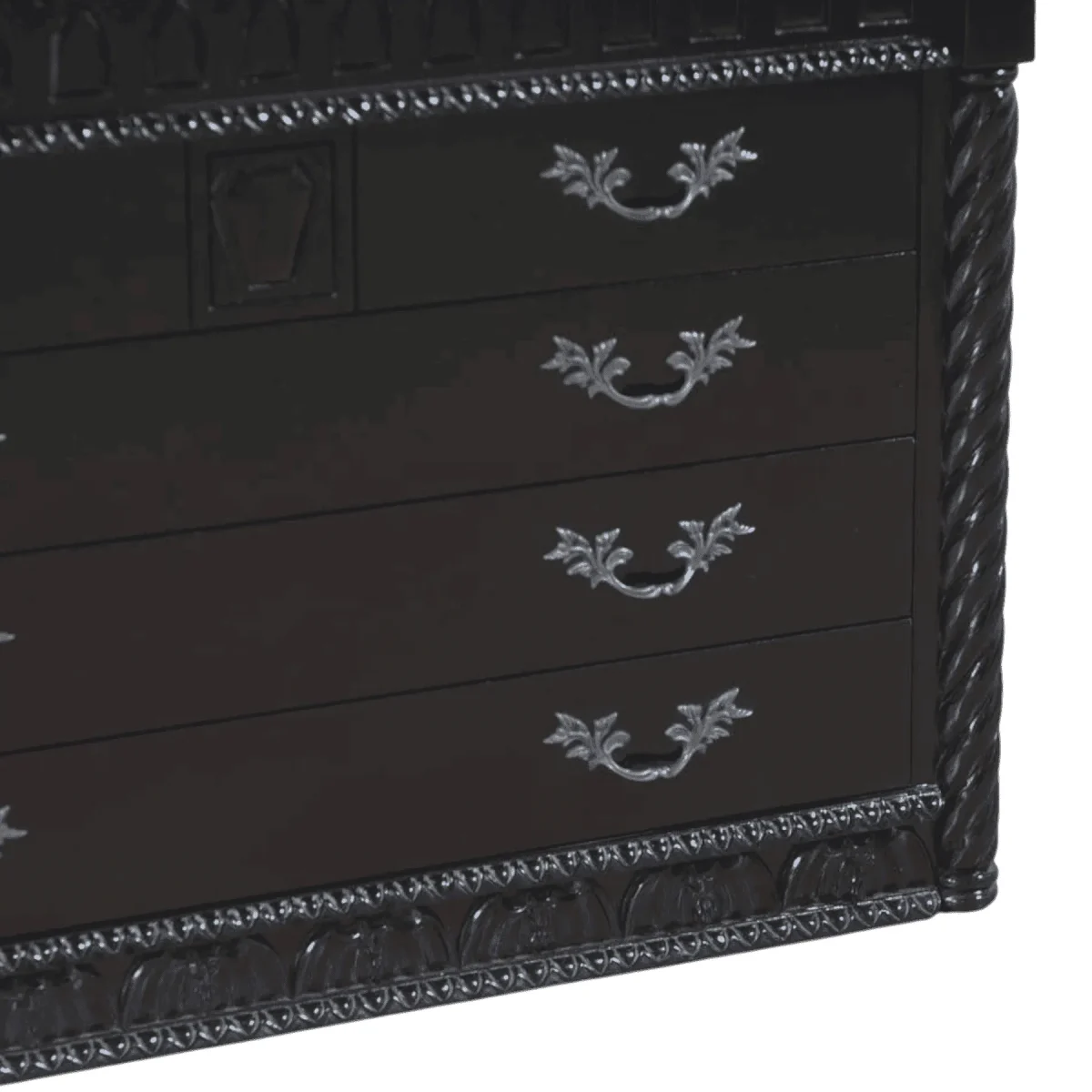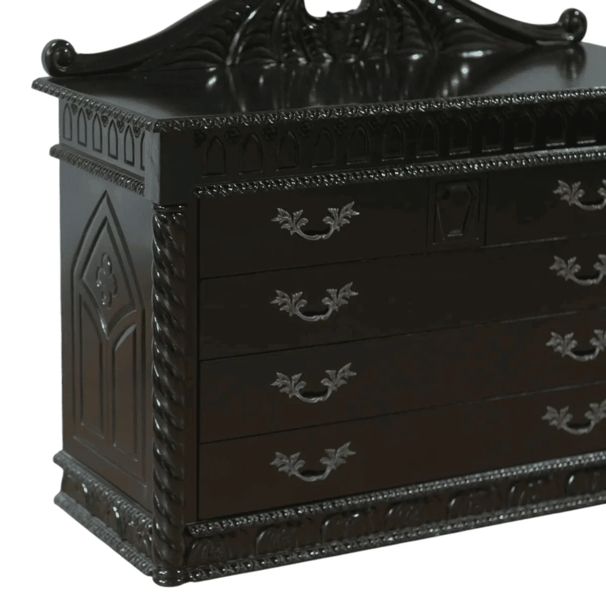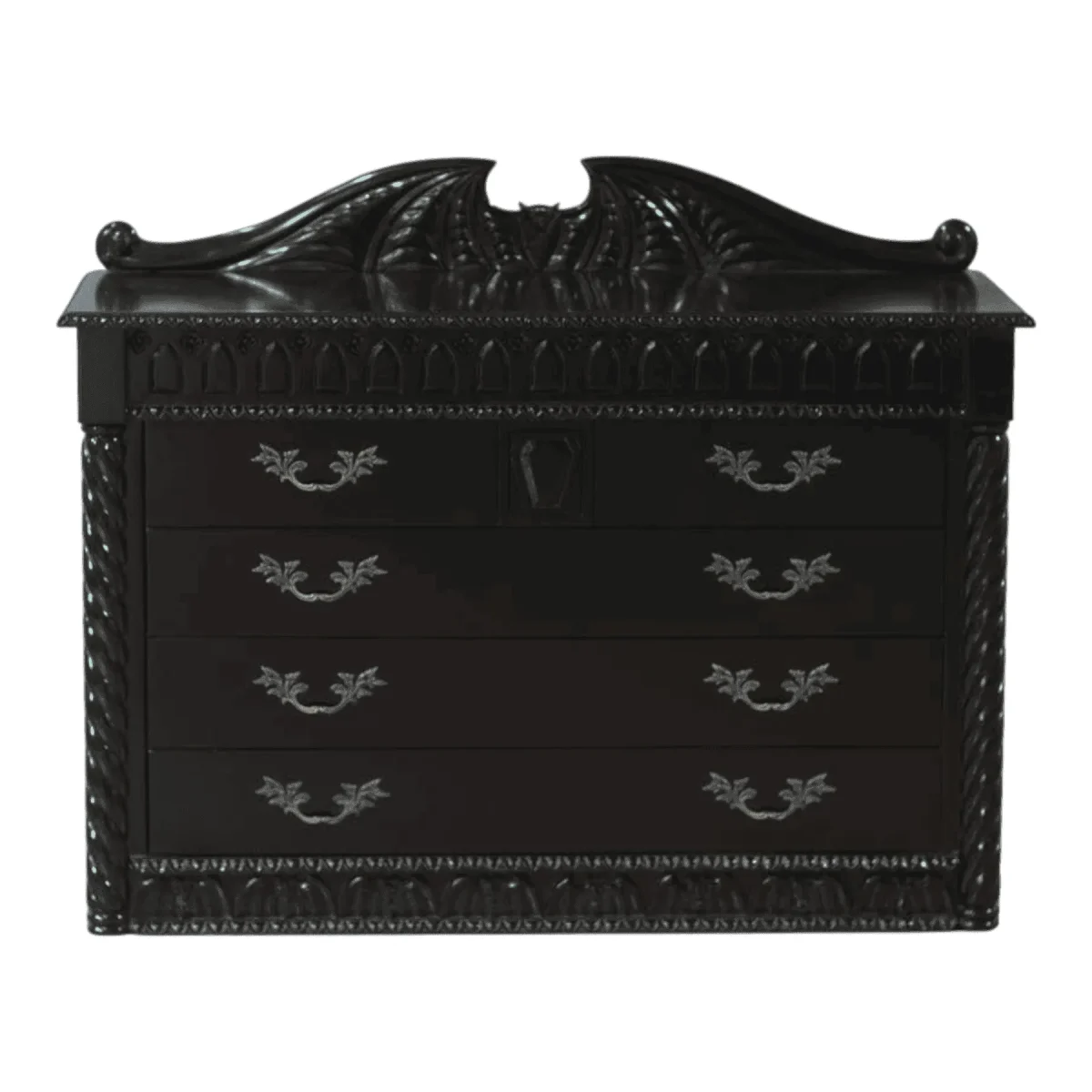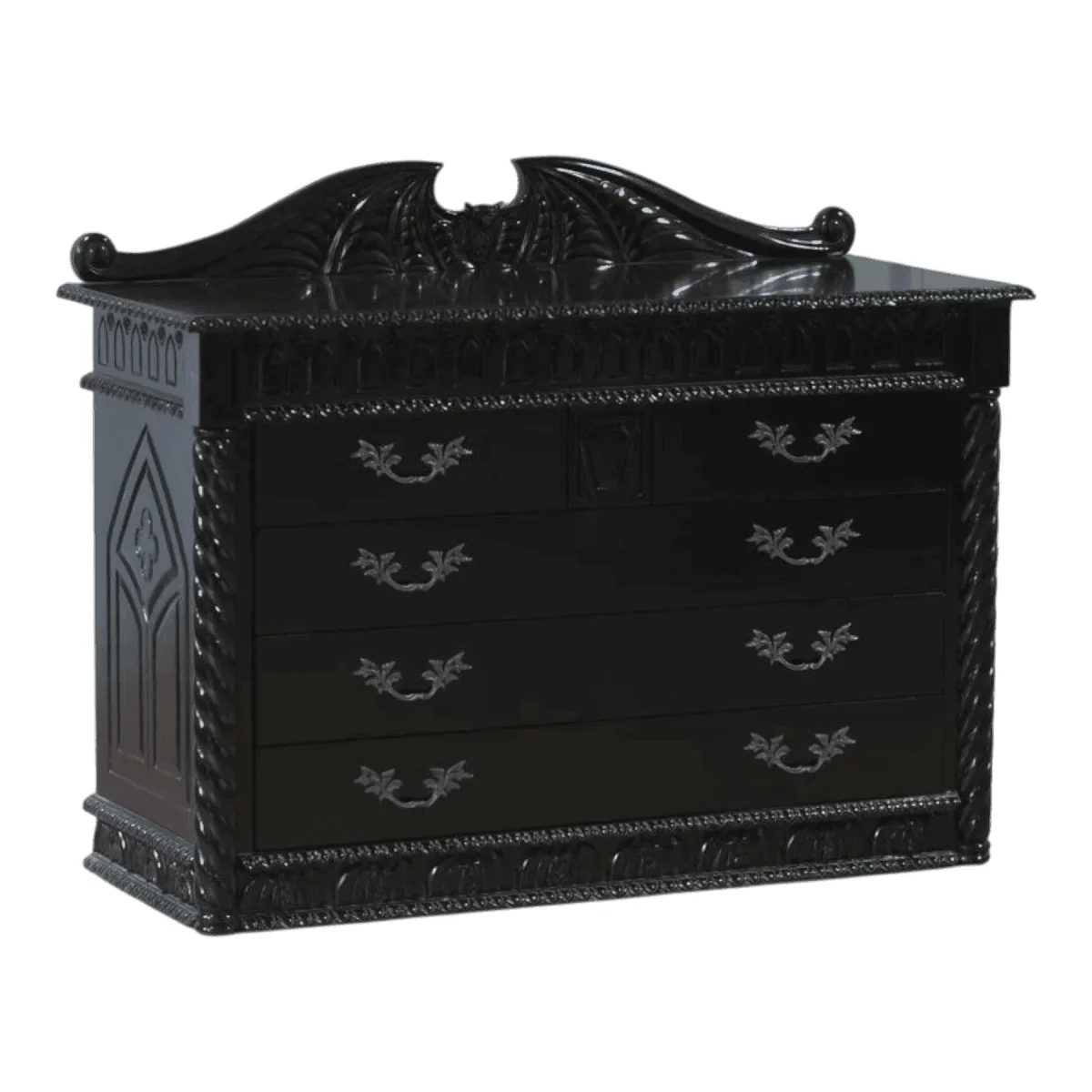 Command attention with this expansive chest of drawers featuring a magnificent bat-wing crest and ornate silver hardware that glimmers against its obsidian surface The structural integrity is enhanced by twisted rope columns and pointed arch carvings that evoke the grandeur of a gothic cathedral With four spacious drawers it provides ample organization without sacrificing its breathtaking aesthetic presence This dresser is a testament to the art of dark décor offering a perfect balance of utility and high-fashion drama for the discerning collector It serves as a monumental piece that defines the character of a room through its striking silhouette and rich textural depth making it an essential addition for those who desire a lifestyle surrounded by legendary craftsmanship