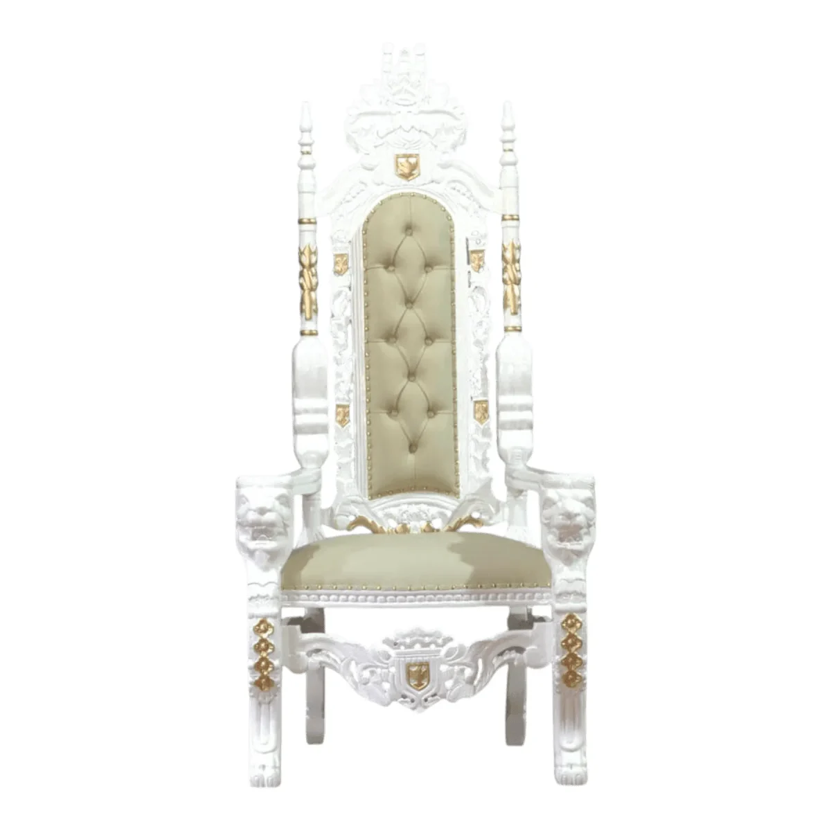 Step into a realm of fantasy and power with this towering throne chair that serves as the ultimate symbol of status and artistic flair finished in a crisp white lacquer with gold highlights the frame features spectacular hand-carved details including majestic lion heads on the armrests and a crown-like crest at the very top the tall narrow backrest is upholstered in a neutral cream-colored fabric with deep tufting providing a soft contrast to the rigid architectural lines of the frame every inch of this chair is designed to impress from the ornate carvings on the legs to the golden crests along the back supports making it an ideal choice for special events photo studios or grand residential spaces where making a statement is the primary goal this throne offers a unique blend of mythological inspiration and high-end furniture design ensuring that whoever sits within it feels truly extraordinary