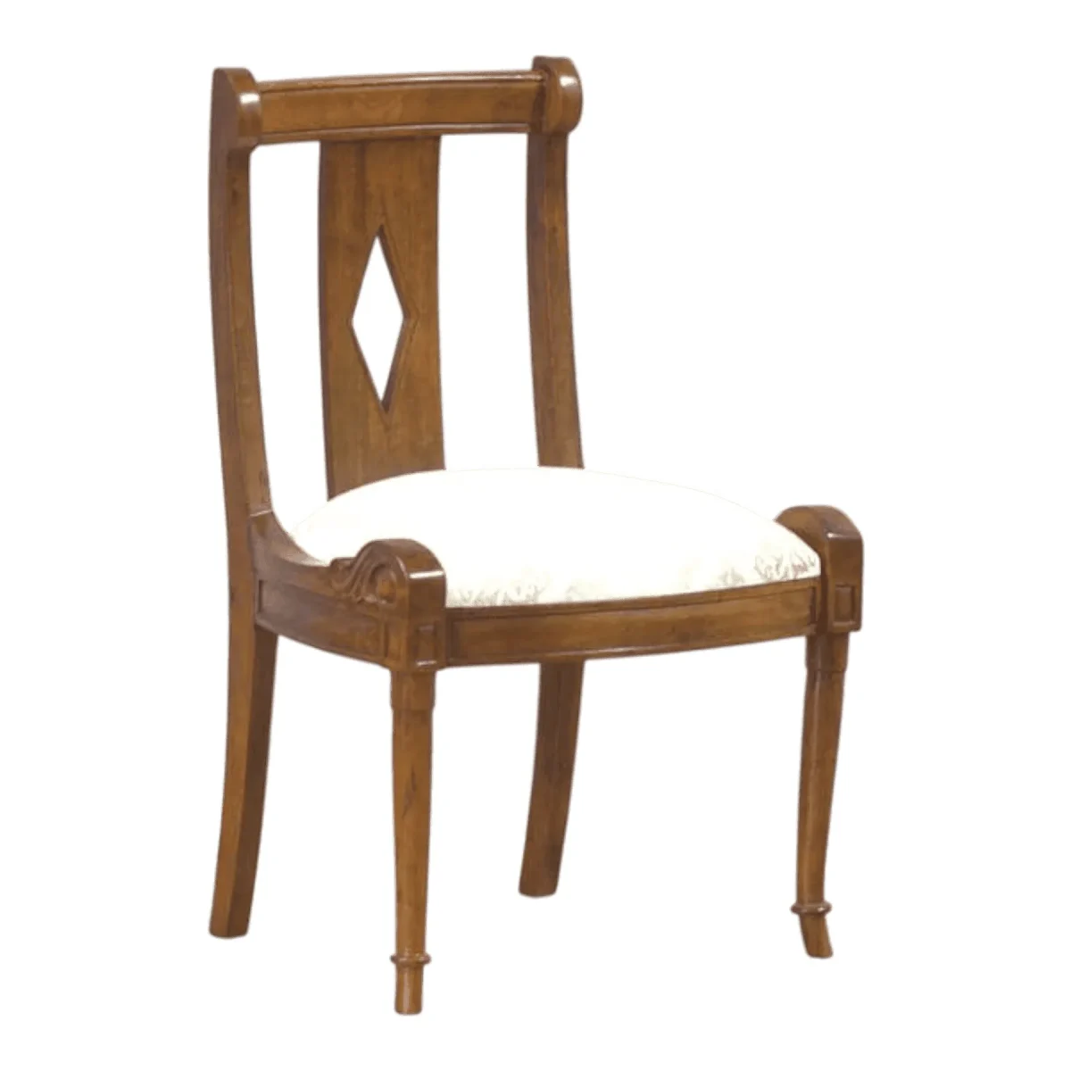 Infuse your living space with the balanced harmony and intellectual grace of the Neoclassic Chair This piece is a masterclass in understated luxury featuring a distinctive diamond cutout in the backrest that offers a geometric twist on traditional woodwork The warm natural wood finish highlights the straight clean lines and subtle curves of the frame making it an ideal choice for a minimalist home that still craves a touch of historical character The plush cream seat provides an inviting contrast to the structured wood ensuring that comfort is never sacrificed for style Whether used as an accent chair in a sunlit corner or as part of a sophisticated dining set this chair brings a sense of calm and order to its surroundings reminding us that true beauty often lies in the simplest of details