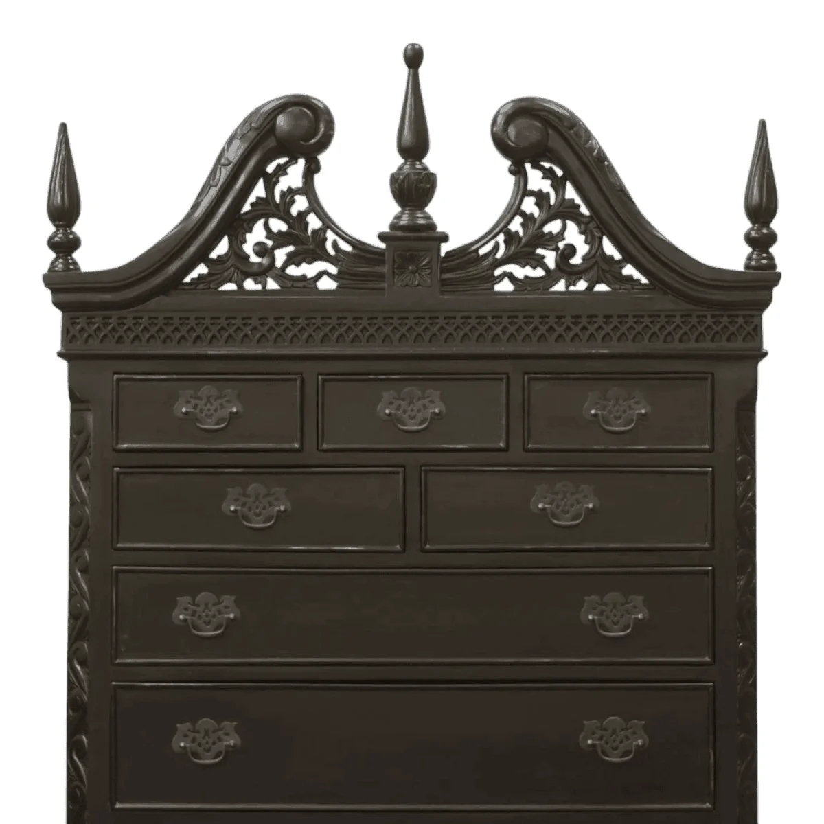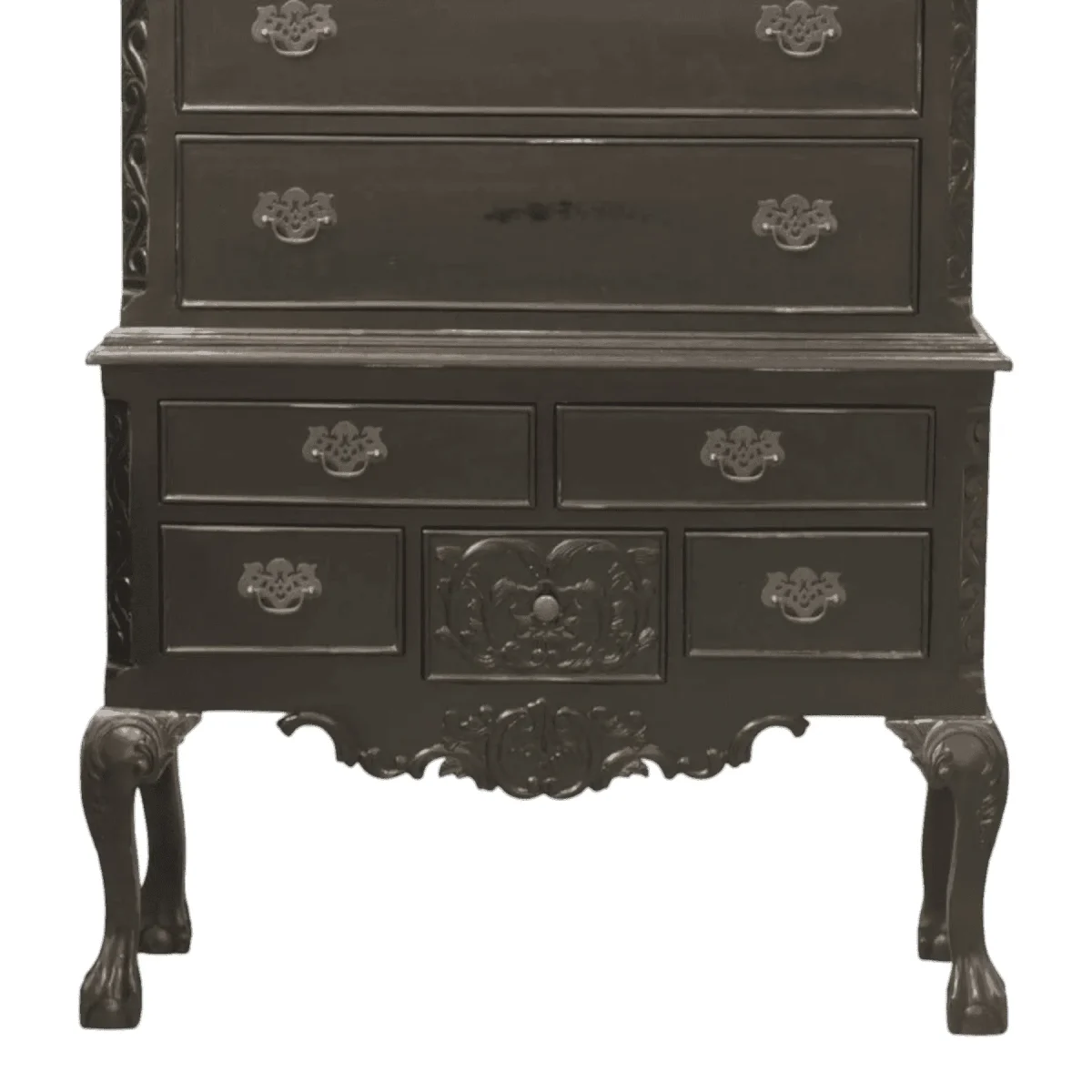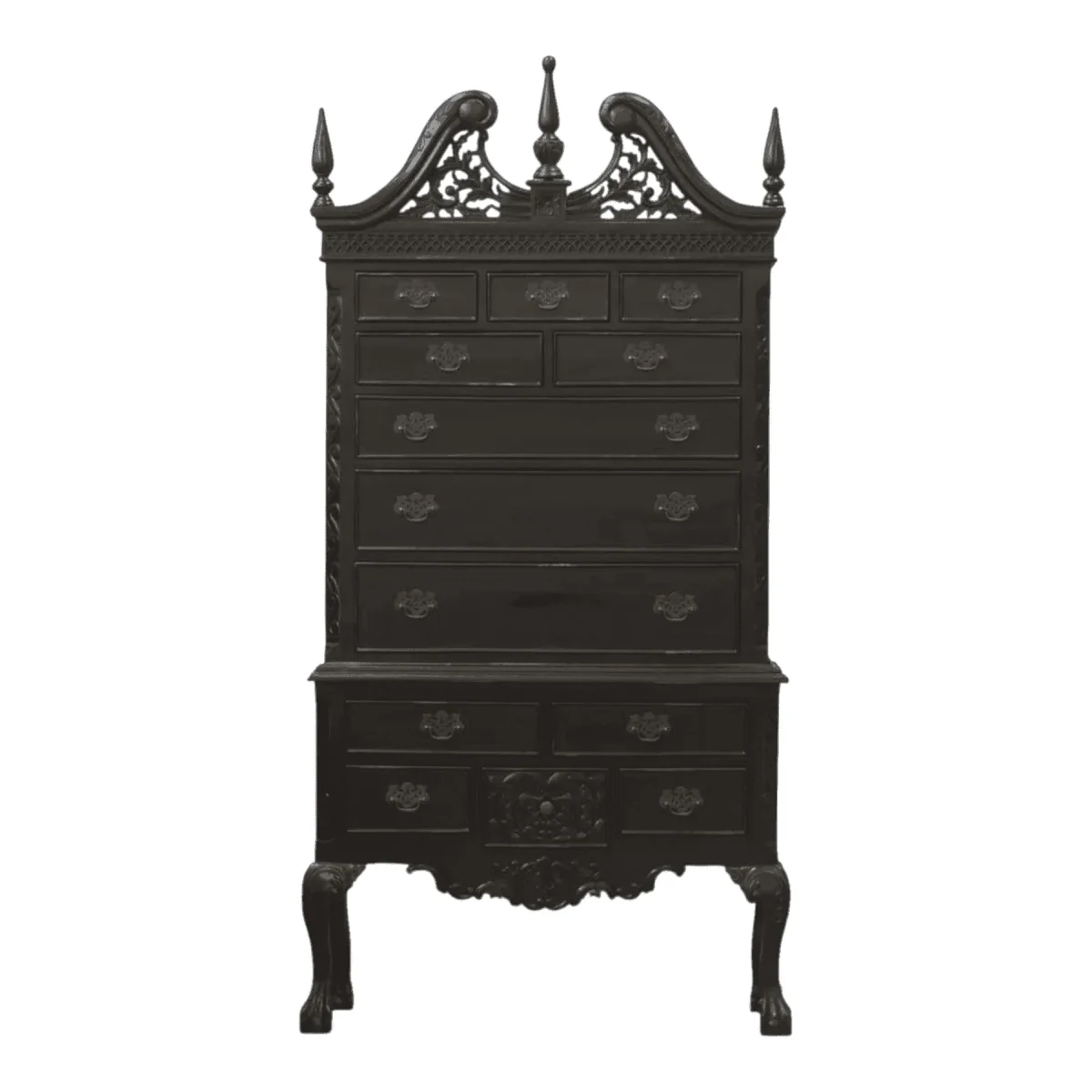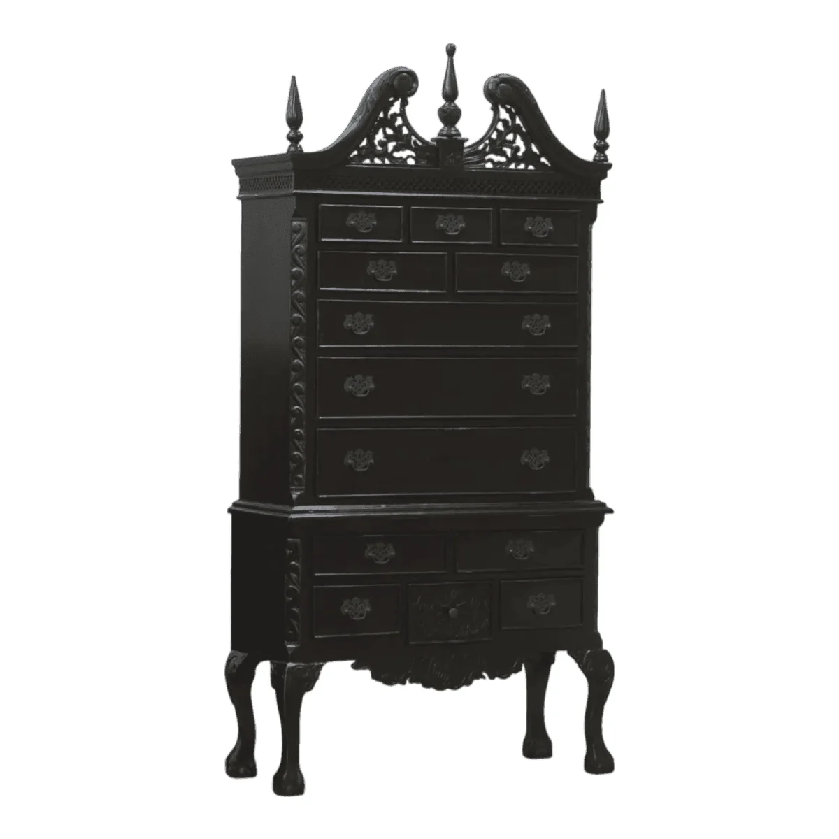 Command vertical space with this imposing highboy chest that marries American colonial form with a dramatic noir finish The structure features a classic broken pediment top with a central finial while the base stands on graceful cabriole legs ending in claw-and-ball feet With eleven drawers of varying sizes including a bottom drawer featuring a carved shell motif this piece offers an abundance of storage wrapped in a sophisticated midnight hue that updates the traditional aesthetic for modern luxury