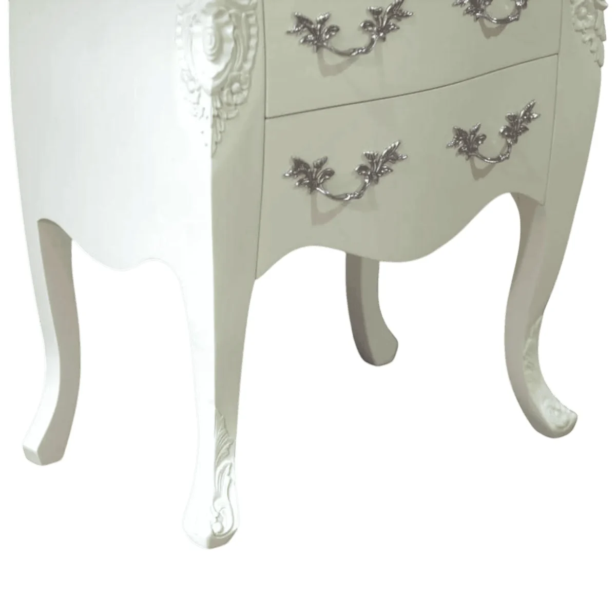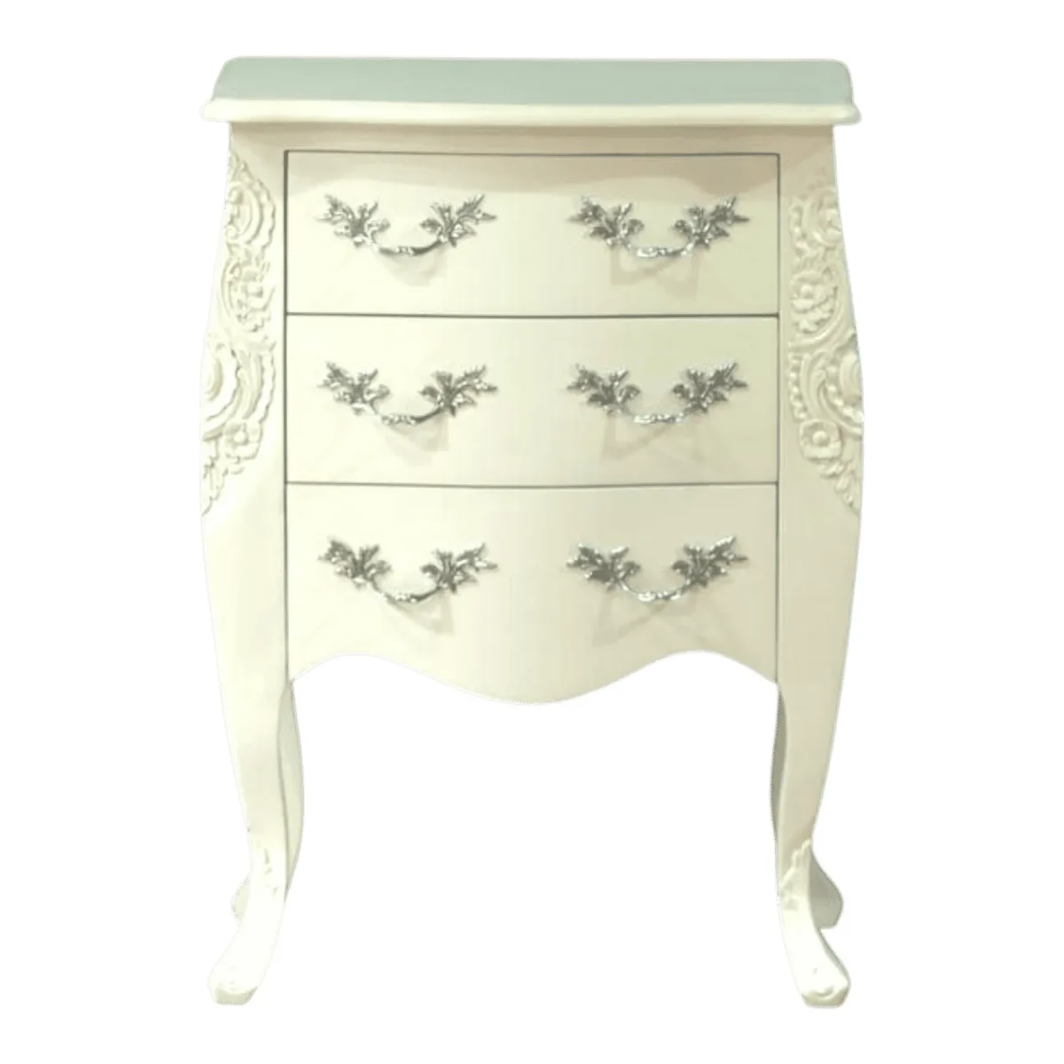Timeless elegance characterizes this cream-finished chest of drawers distinguished by the intricate relief carvings that adorn the side pilasters The gentle serpentine front curves outward to maximize storage space in the three drawers while silver handles add a refined metallic touch The scalloped apron and cabriole legs suggest a French influence making this a versatile piece that complements both traditional and transitional decor styles