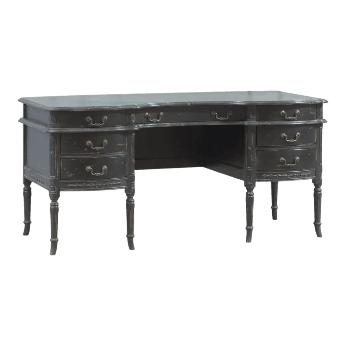 The Parisian Noir Writing Bureau is an exercise in vintage sophistication featuring a beautifully distressed black finish that suggests a storied past Its serpentine front and elegantly tapered fluted legs offer a feminine grace to a traditionally masculine furniture category Five drawers provide ample space for stationery and modern tech accessories while the weathered edges reveal glimpses of the wood beneath adding character and soul to your workspace This desk is ideal for those who seek to blend the romance of a Parisian studio with the functional requirements of a contemporary home office making every task feel like a creative endeavor