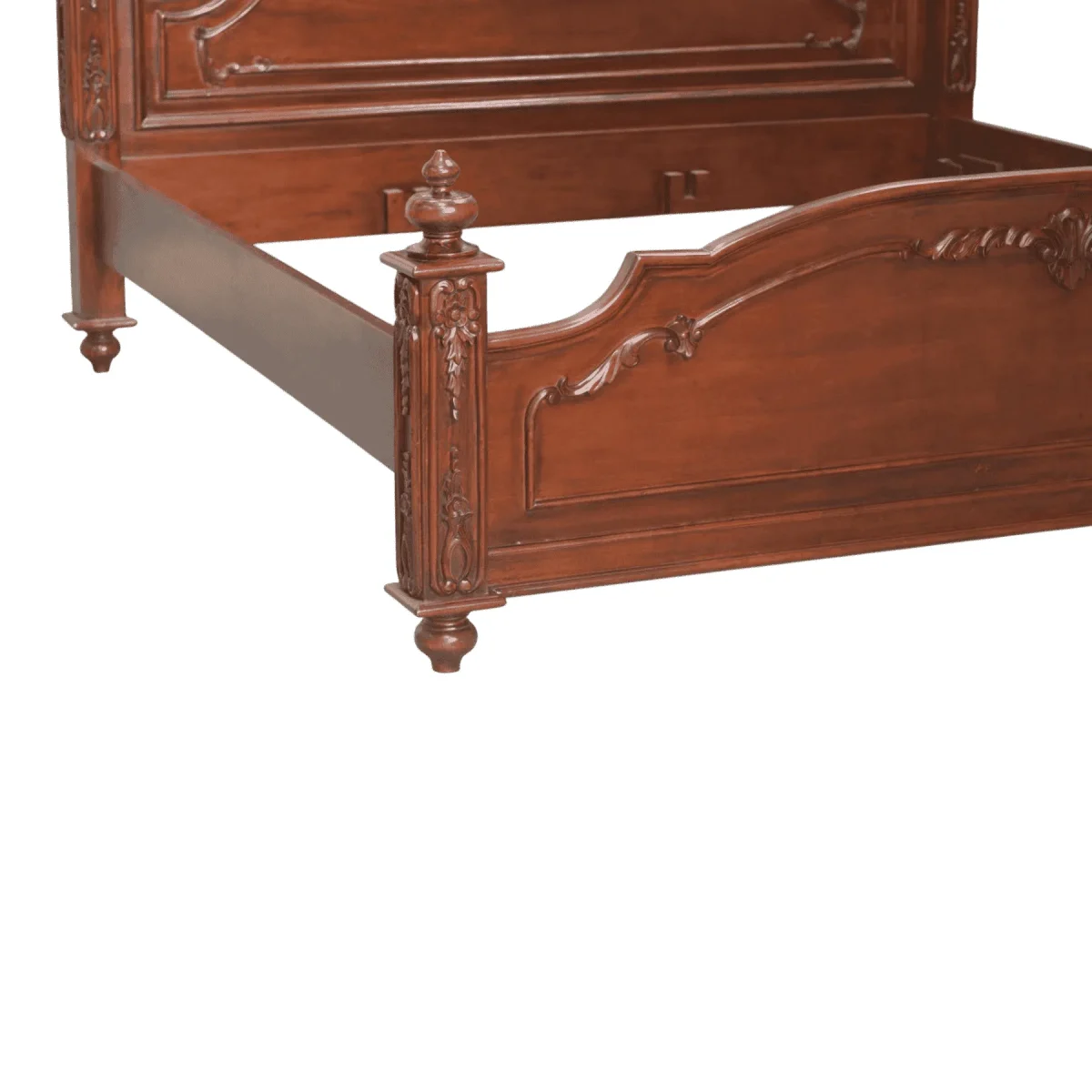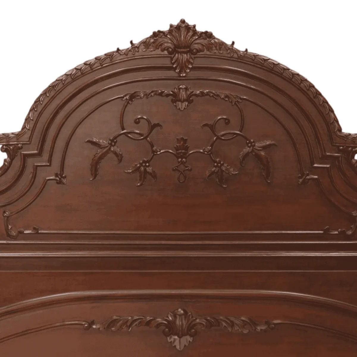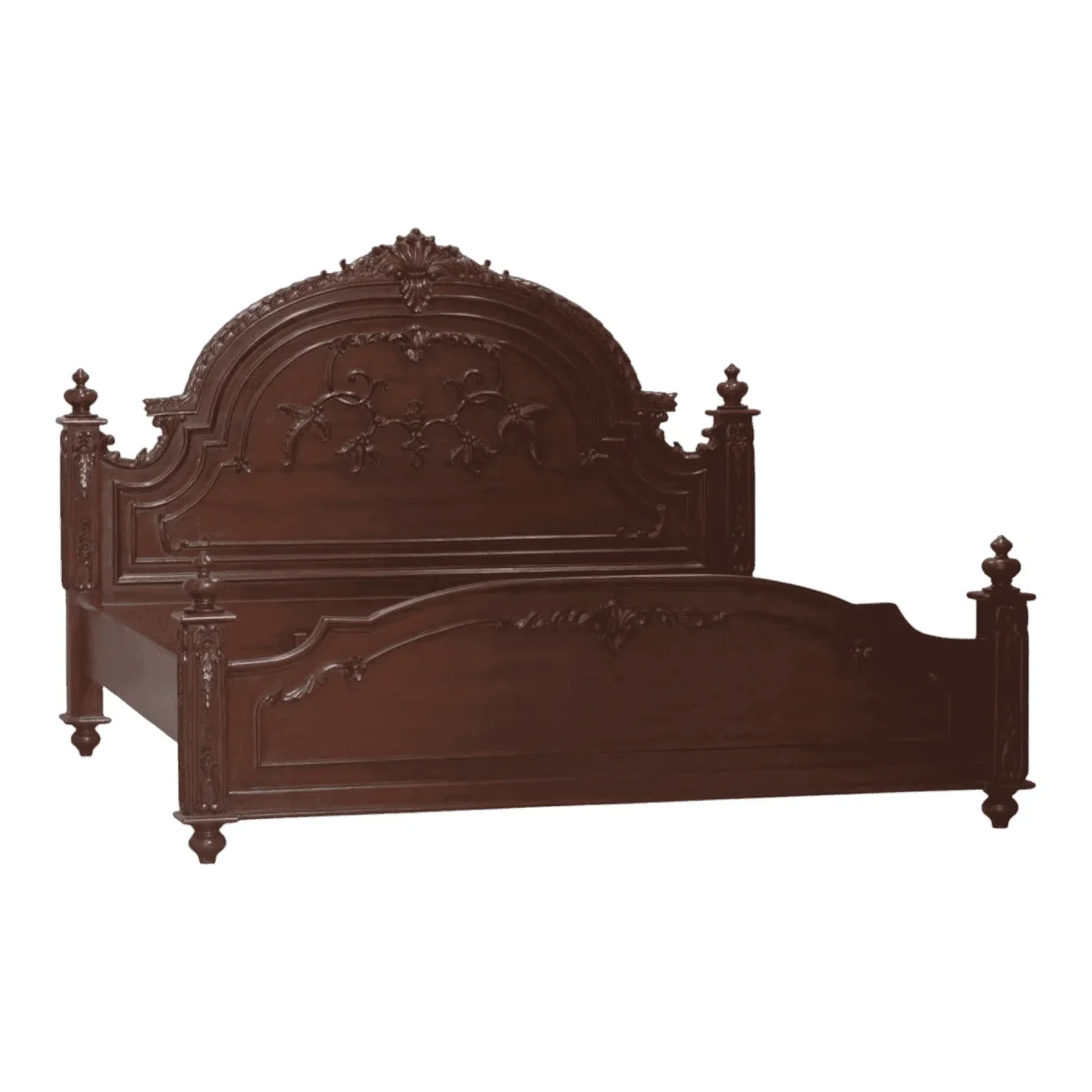 Grandeur defines this impressive bed frame characterized by its sweeping arched headboard and intricate relief carvings The dark chocolate finish adds to the sense of weight and history while the floral motifs in the center panel soften the imposing scale Flanked by sturdy posts topped with finials this bed is designed to be the undisputed anchor of a master suite evoking the romance of a 19th-century country estate