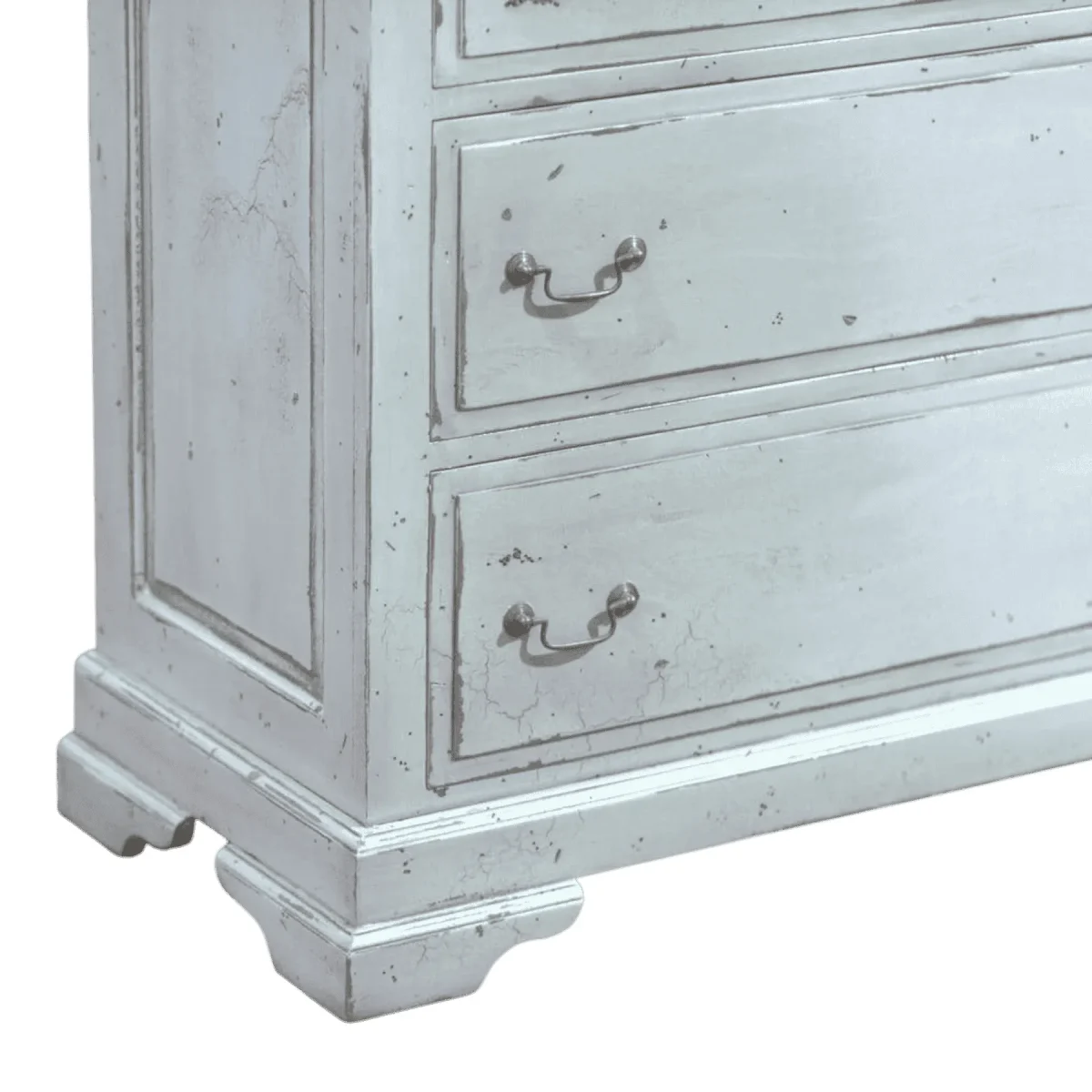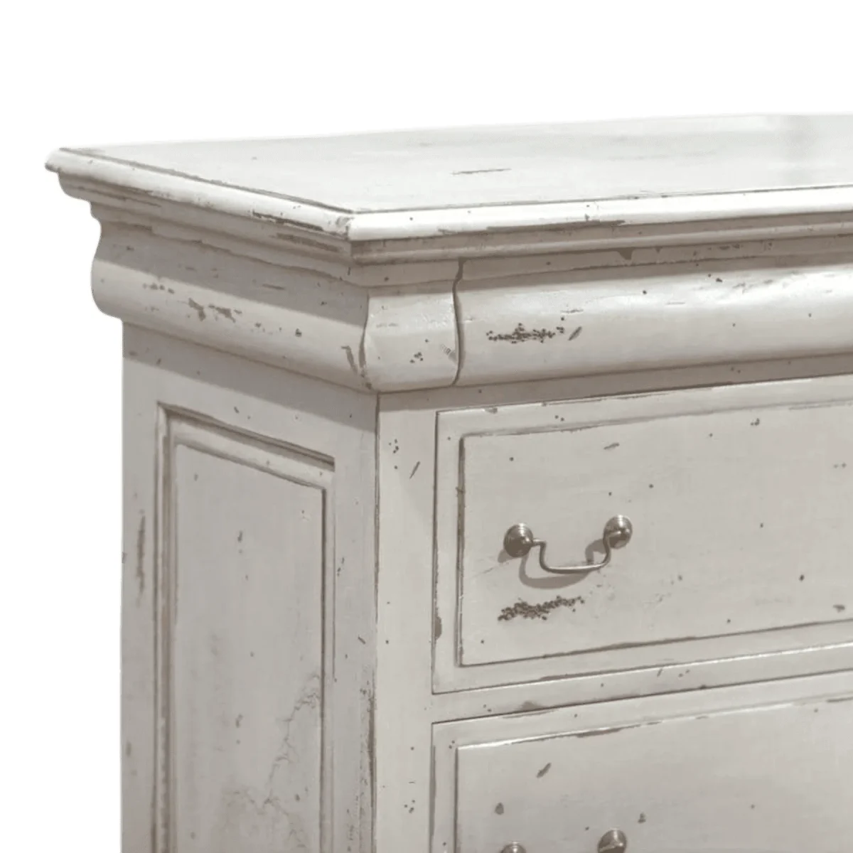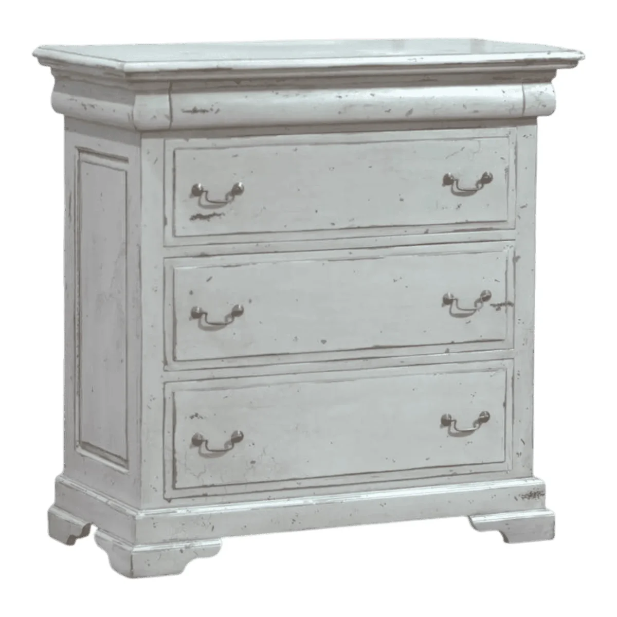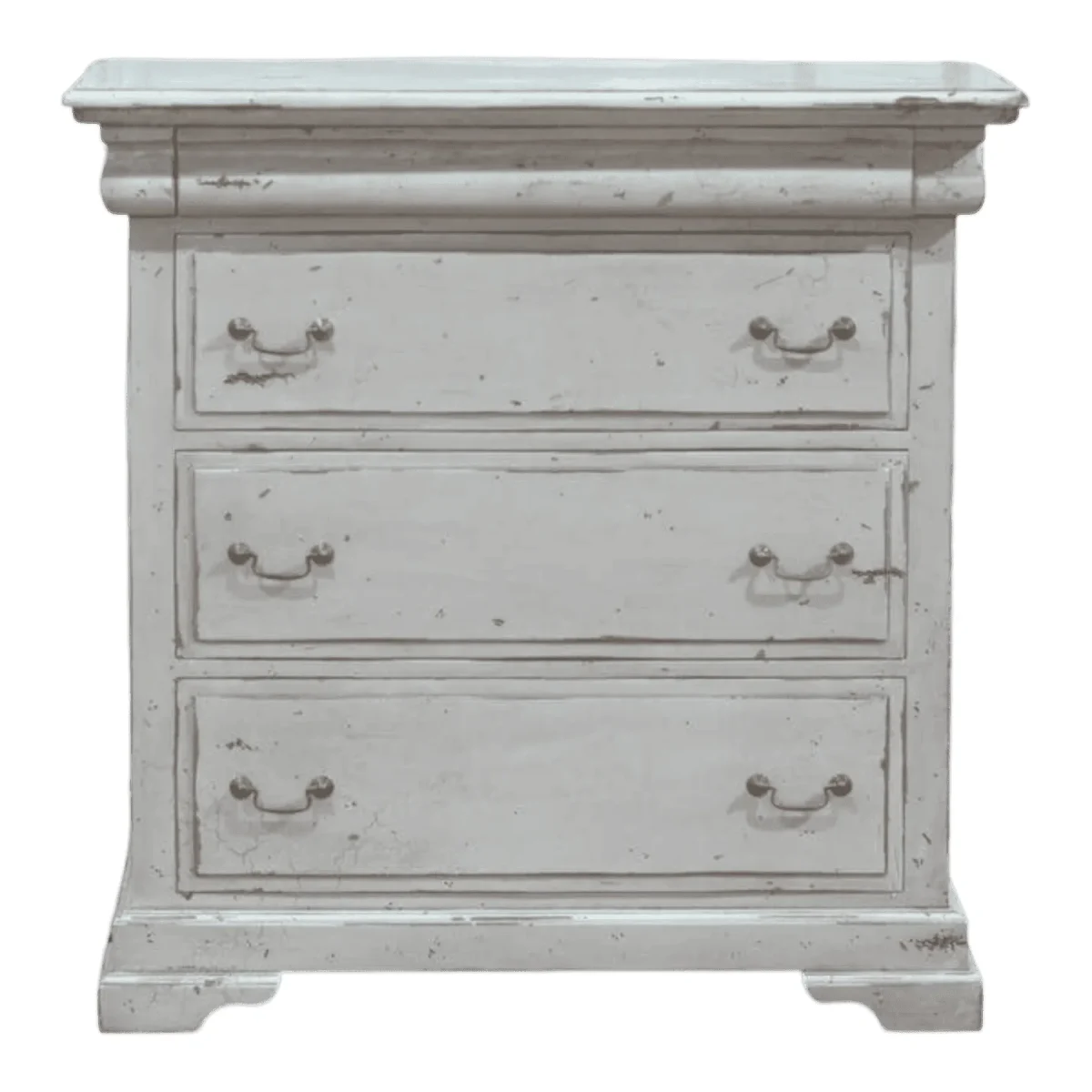 Capture the essence of coastal European estates with this robust yet elegant three-drawer chest The piece is characterized by its substantial molding and a unique weathered grey wash that highlights the natural character of the timber beneath Each drawer is adorned with classic antiqued pull handles offering a smooth operation and ample storage for linens or personal treasures Its sturdy plinth base and subtle distressing make it a versatile addition to either a rustic farmhouse or a refined transitional home This commode serves as a functional anchor providing both organization and an understated architectural presence to your hallway or bedroom suite