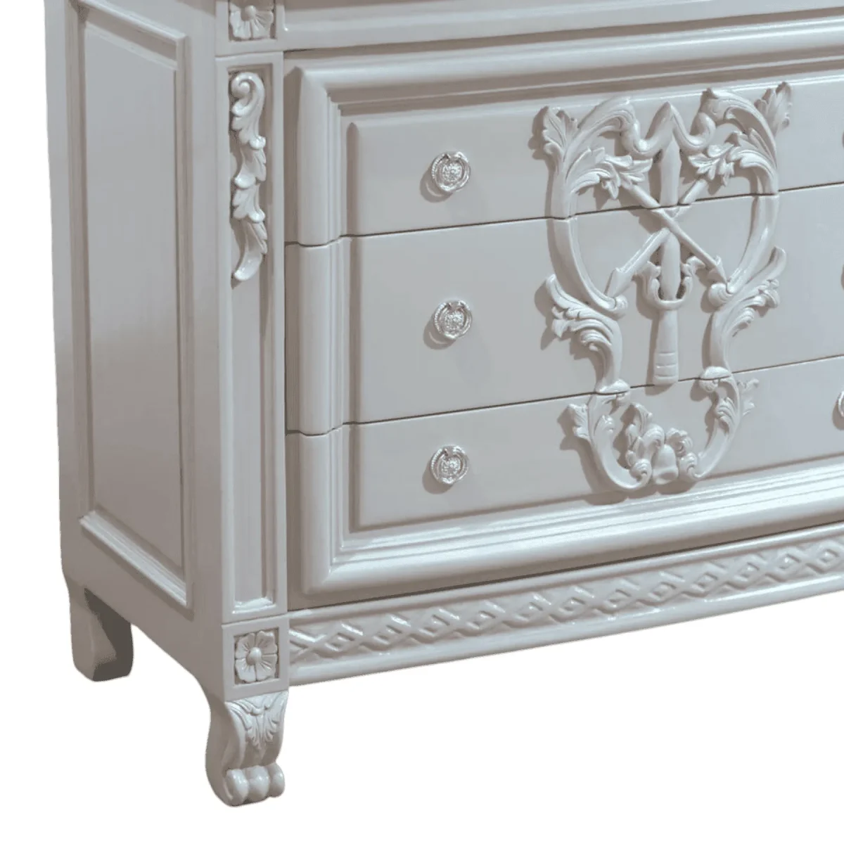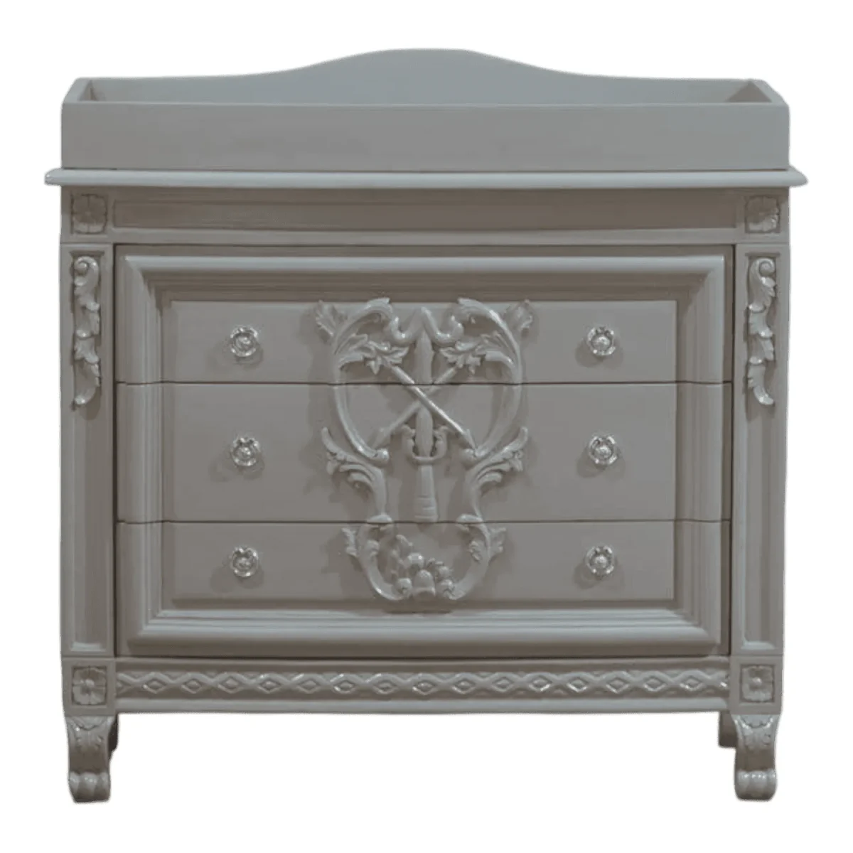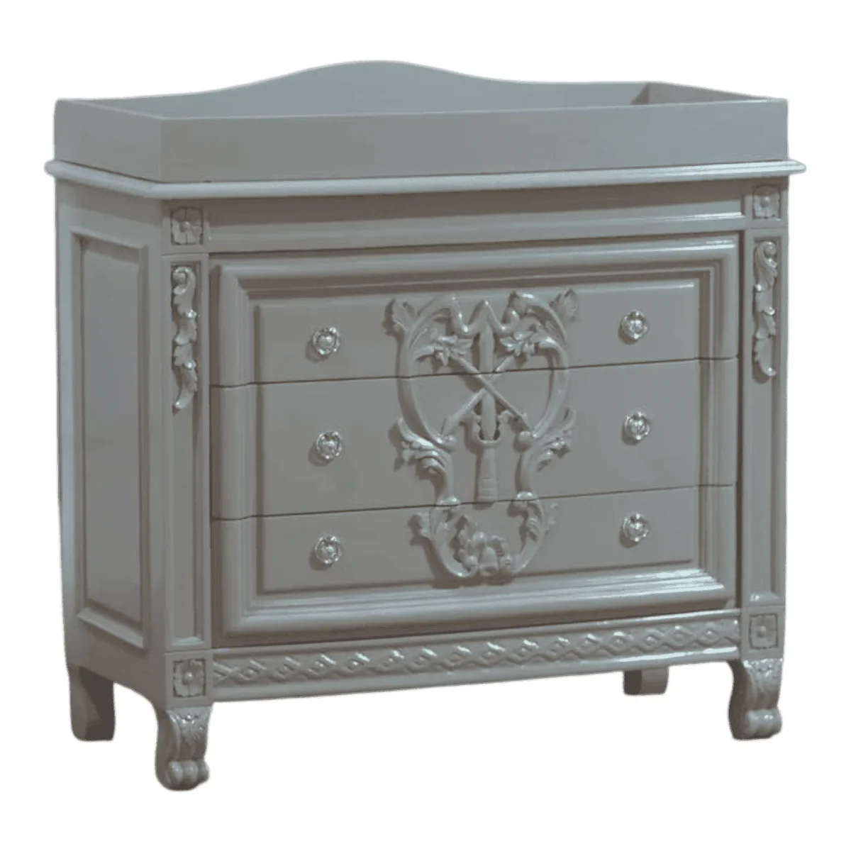 Optimize your storage with style using this grand dresser that features three wide drawers adorned with magnificent central carvings and classic hardware making it a powerhouse of organization and aesthetic appeal The dresser is topped with a protective gallery rail that allows it to function as a changing table or a display surface for cherished family photos and heirlooms while the soft grey finish brings a contemporary touch to its traditional baroque-inspired form The fluted pilasters and ornate base molding provide a sense of architectural strength and beauty ensuring that this piece stands out as a primary furniture item in your bedroom or nursery Crafted from seasoned mahogany wood it offers the durability needed for daily use while its artistic details provide a constant source of visual delight and a touch of old-world luxury