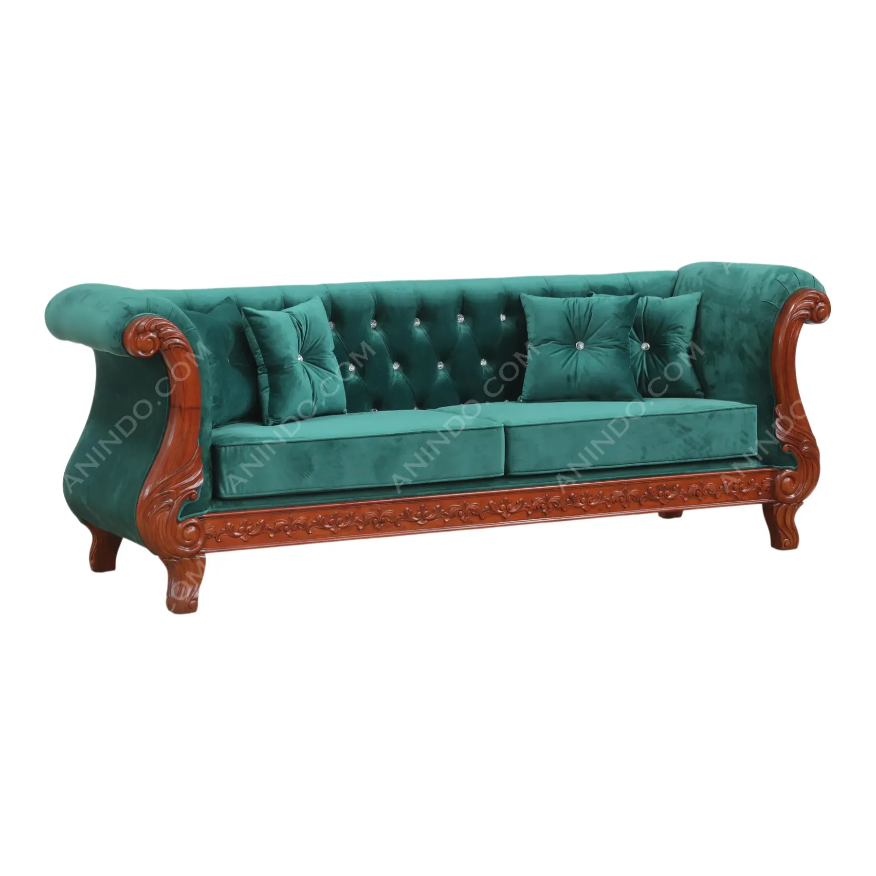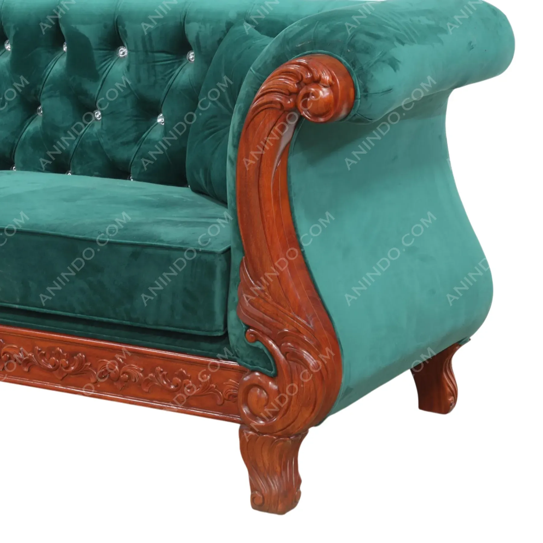 Experience unapologetic glamour. This stunning sofa is a dramatic blend of Victorian opulence and modern luxury. It features a deeply button-tufted backrest, accented with sparkling crystal buttons, all wrapped in a rich, emerald-green velvet. This plush jewel-toned body is set against an exposed, hand-carved teak wood frame with flowing, scrolled arms and intricate legs. This is a show-stopping centerpiece for a truly glamorous living space.