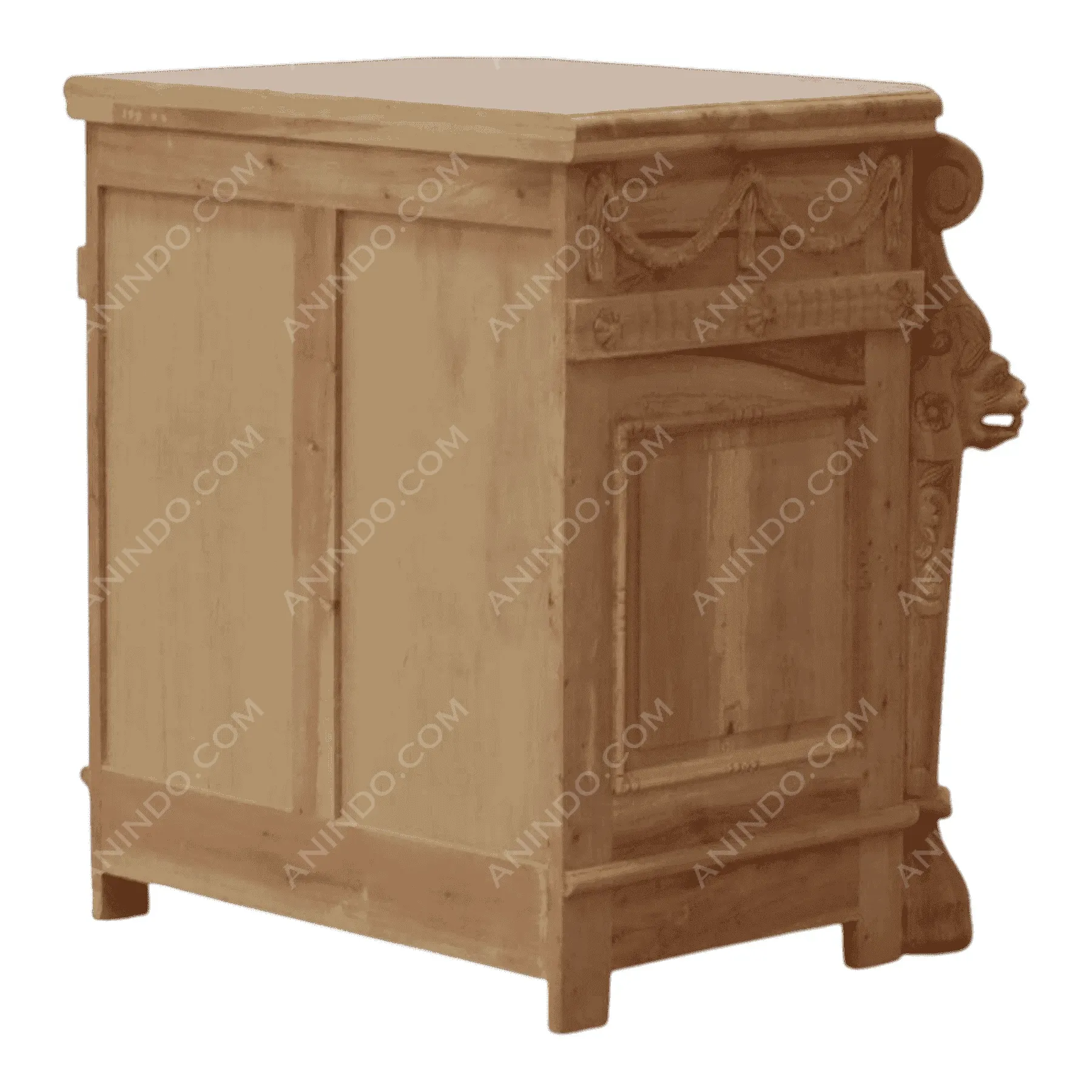 A truly formidable and artistic cabinet that commands any space This piece is a tour-de-force of carving presented in a natural unfinished wood tone The upper section features a drawer with festoon carvings flanked by two massive scrolled pilasters terminating in regal lion heads The lower cabinet door features a central carved wreath This is a powerful statement piece rooted in classical Empire design