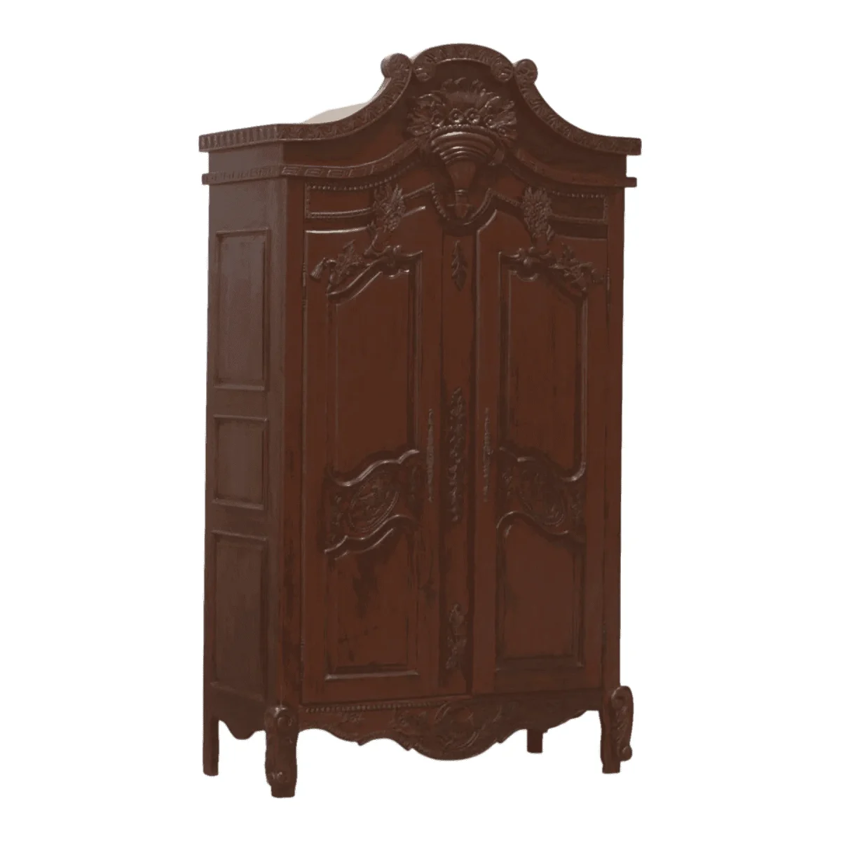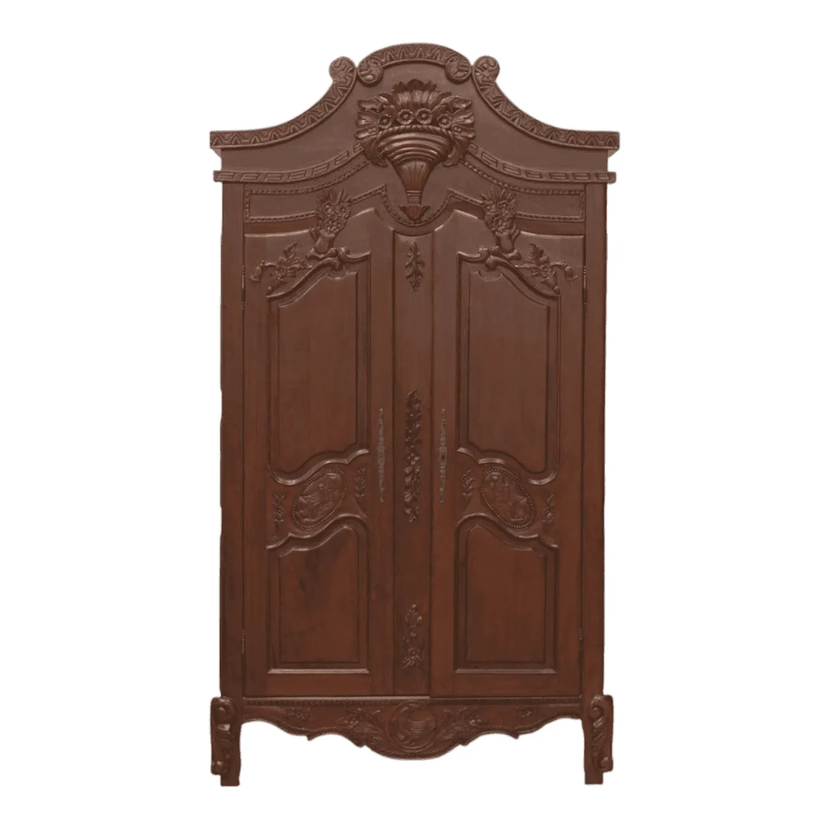 Anchor your bedroom with the earthy warmth of this solid wood armoire a piece that celebrates the natural beauty of timber grain Carved with a central urn motif and draped floral garlands the design is identical to royal court furniture but rendered in a humble rustic finish The deep brown tones invite a sense of calm and stability offering substantial storage behind two paneled doors that have been crafted to last for generations