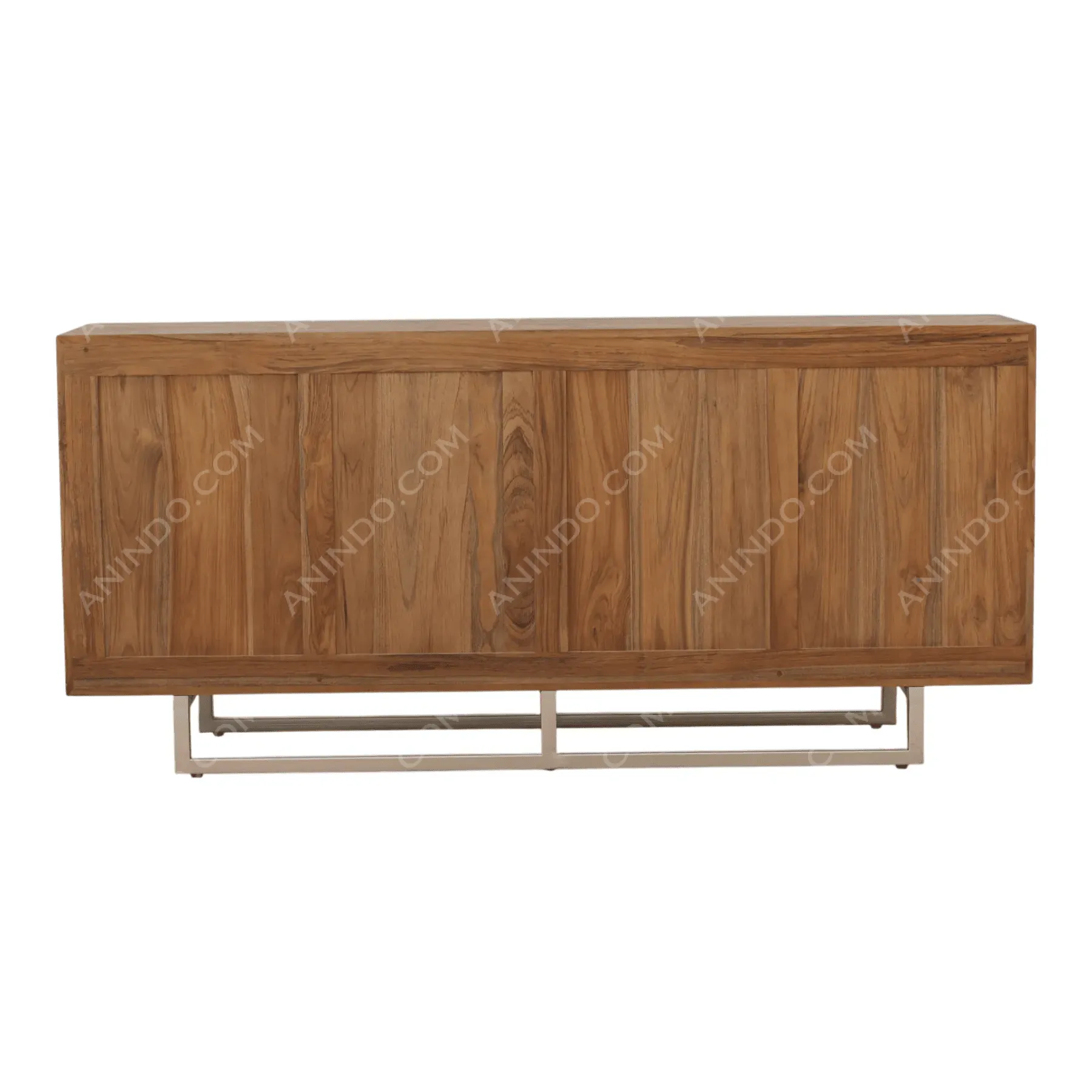This sideboard is a stunning piece of functional art, elevating storage to a sculptural statement The entire four-door cabinet is wrapped in a continuous pattern of geometric, faceted wood pieces, meticulously arranged to play with light and shadow The varied grain of the teak wood is highlighted by these angular cuts, creating a rich, dynamic surface The cabinet “floats” on two sleek, H-shaped metal legs in a light-brushed finish, adding a modern, industrial counterpoint