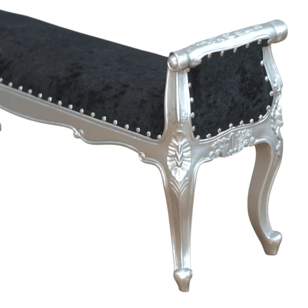 Infuse your entryway or dressing room with the dramatic flair of a boutique hotel suite using this exquisite upholstered bench The shimmering silver leaf finish on the frame provides a stunning contrast to the plush midnight black velvet creating a visual anchor that demands attention Artisan-applied studding accents the silhouette highlighting the graceful curves of the rolled arms and slender legs Whether used as a functional seat for preparation or a purely decorative accent in a grand hallway this piece embodies the spirit of glamorous living The soft texture of the upholstery invites you to pause and enjoy a moment of indulgence before starting your day or settling in for the evening