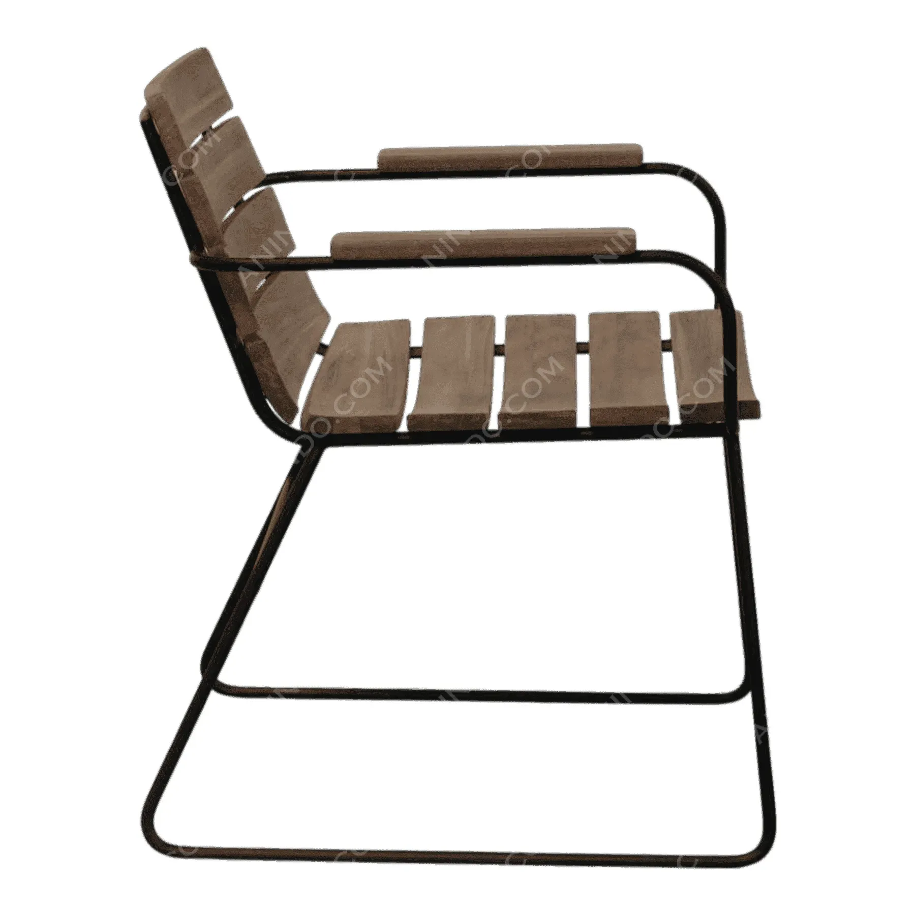 This chair blends industrial and natural elements Its black metal frame provides a sleek, modern foundation while the curved wooden slats on the seat and back offer ergonomic comfort The wood-capped armrests add a warm finishing touch, making it perfect for a contemporary patio or cafe setting