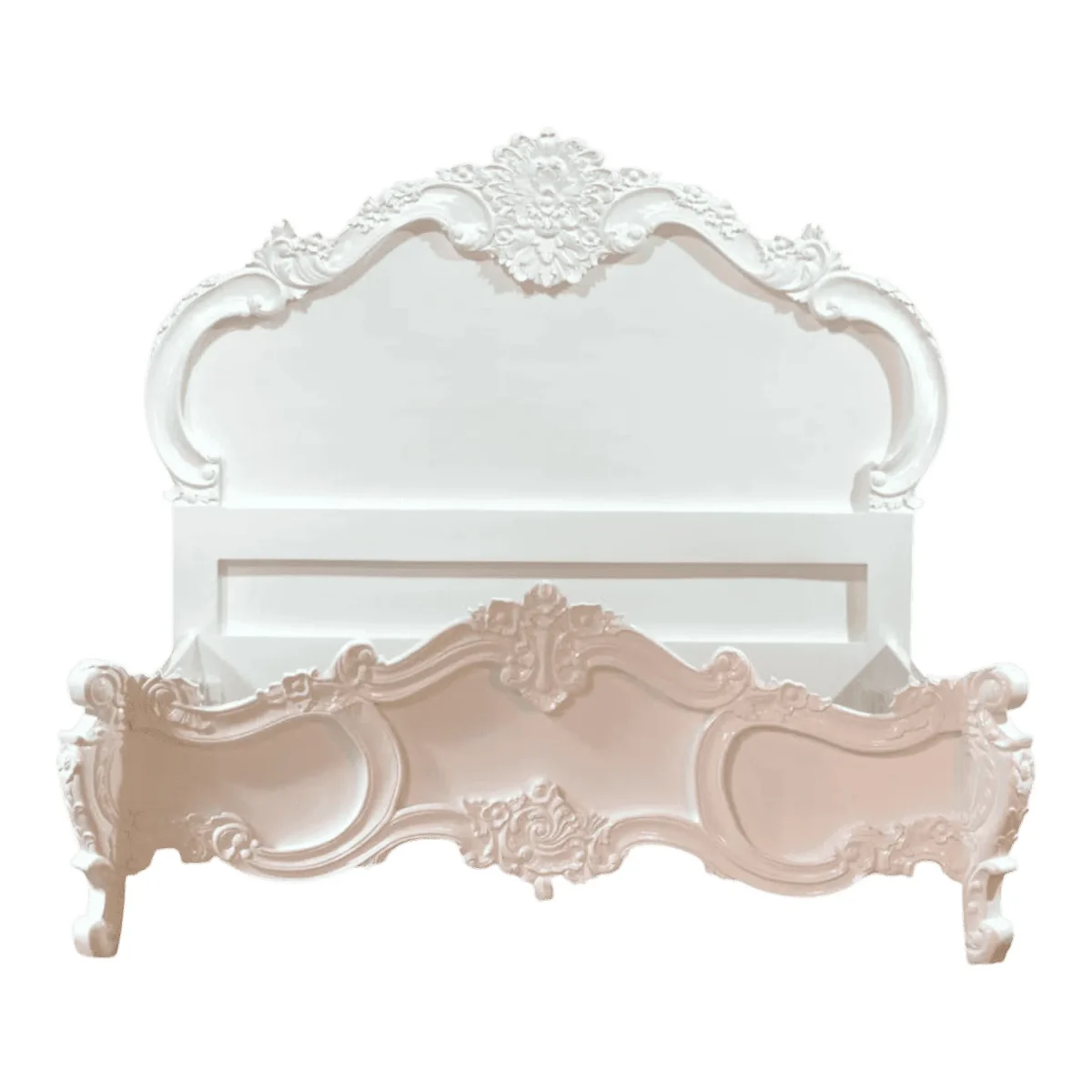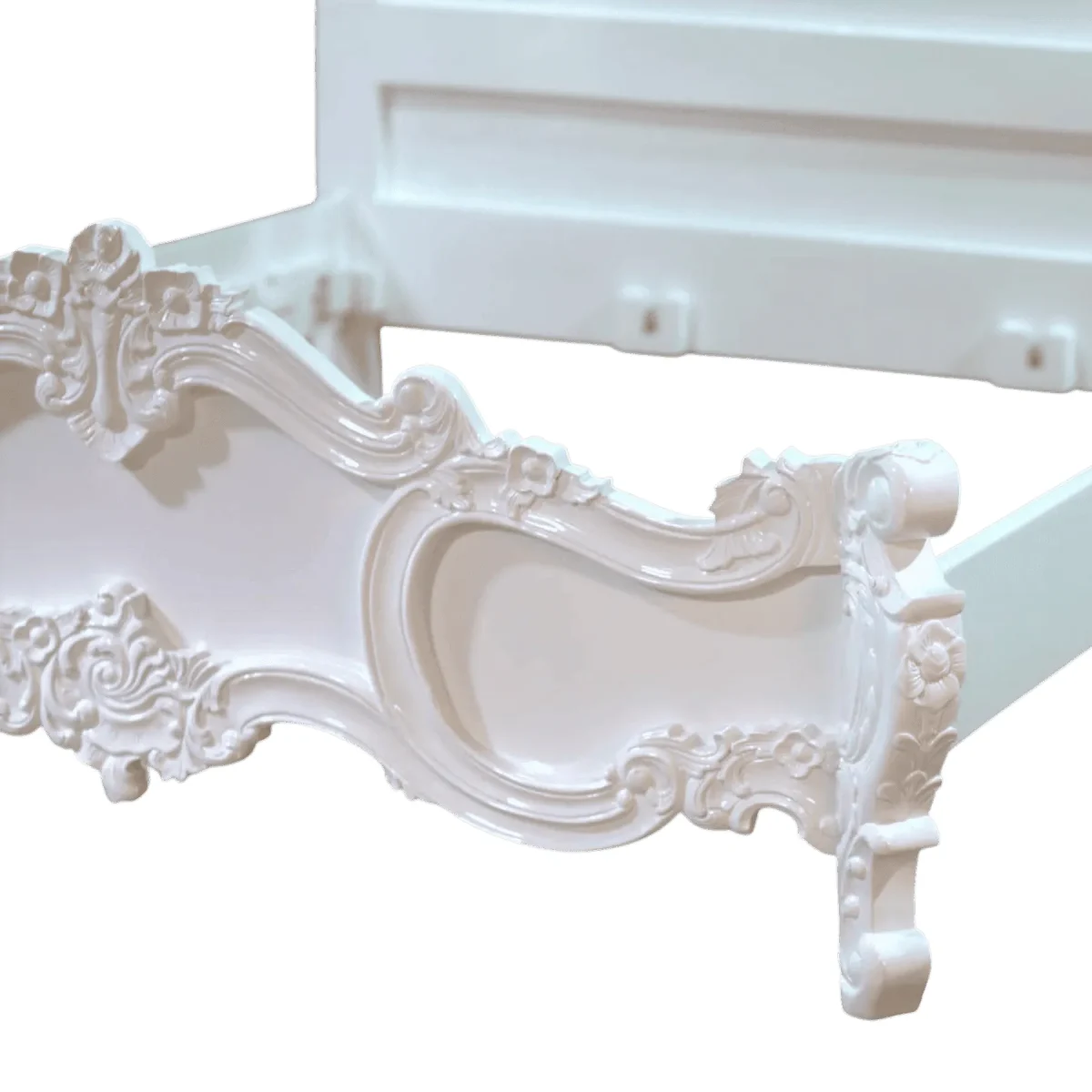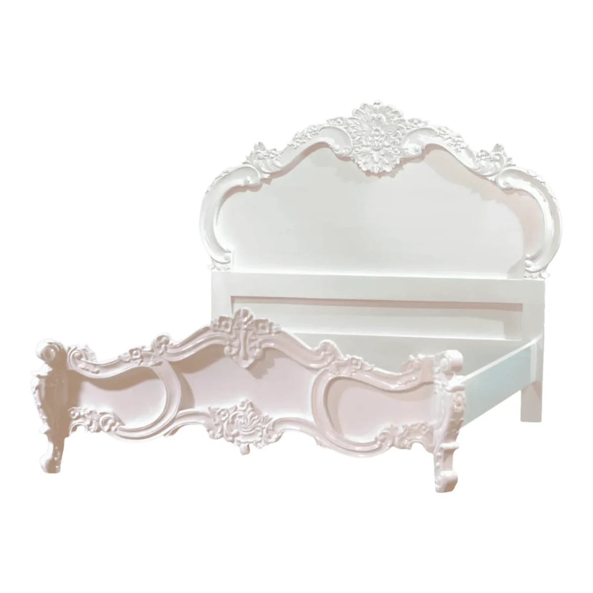 Experience the ultimate in romantic design with a bed frame that captures the essence of a spring garden in full bloom The sweeping curves of the headboard and footboard are adorned with hand-carved floral bouquets and scrolled edges creating a soft feminine silhouette that transforms any bedroom into a peaceful sanctuary Finished in a luminous white lacquer this piece reflects ambient light to brighten your space while maintaining a sense of traditional depth and character The open design of the footboard adds a touch of lightness ensuring the bed does not overwhelm smaller rooms while still making a bold style statement Crafted from premium hardwoods to ensure a squeak-free and stable sleep environment this bed is as durable as it is beautiful It is the perfect choice for those seeking a vintage-inspired aesthetic that feels fresh clean and timelessly sophisticated for a lifetime of comfort