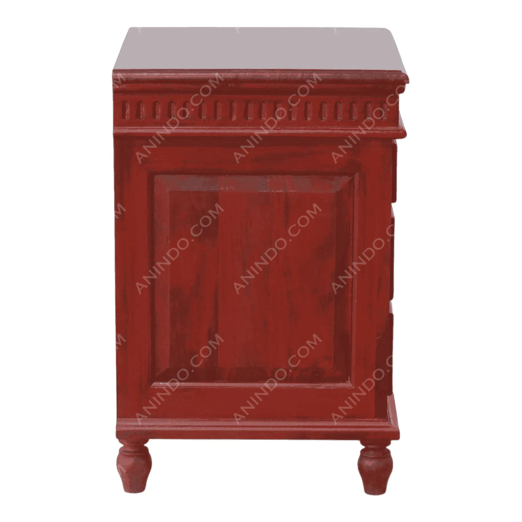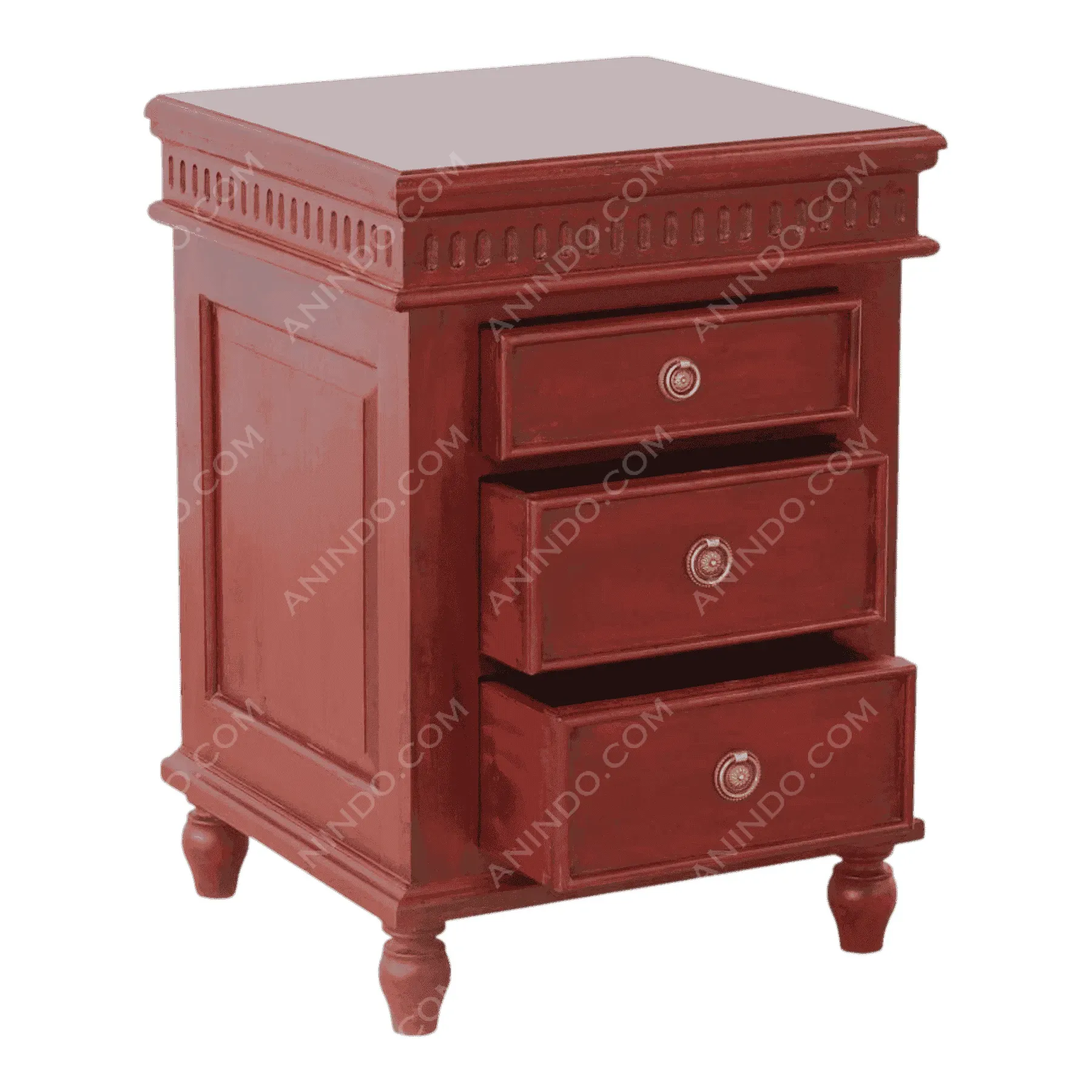 A sturdy and classic bedside table that combines timeless design with practical storage Crafted from wood with a warm reddish-brown finish it features three stacked drawers each with an inset panel and a decorative metal pull A distinctive dentil molding detail beneath the top adds a touch of architectural character Supported by simple turned bun feet this nightstand is a robust and handsome addition to any traditional bedroom