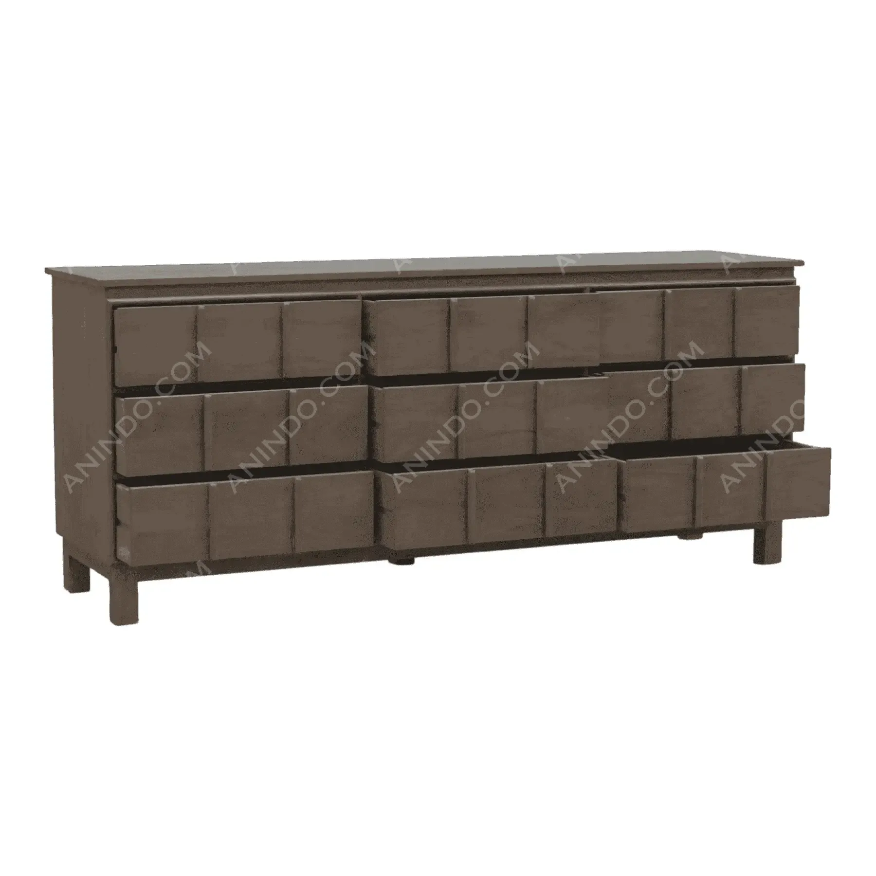 This sideboard is a unique and captivating piece of storage furniture It features a long rectangular body finished in a muted grey-brown stain The entire front is adorned with a raised grid-like pattern creating a highly textural and rhythmic facade This design cleverly conceals the doors and drawers giving it a monolithic appearance It’s a perfect statement piece for a modern or transitional dining room