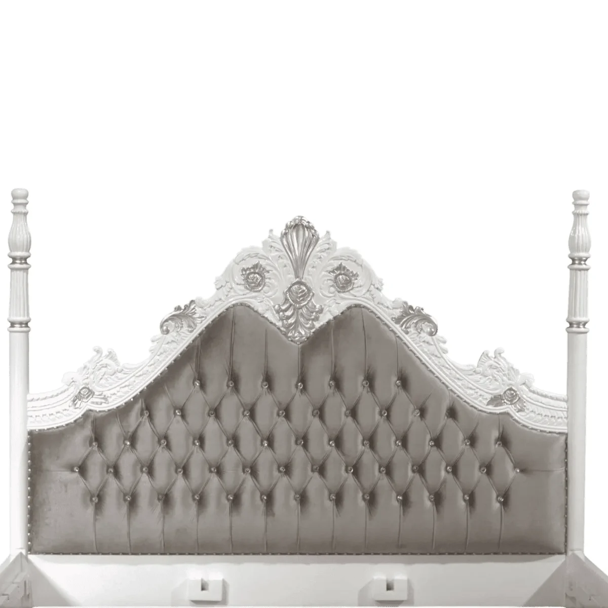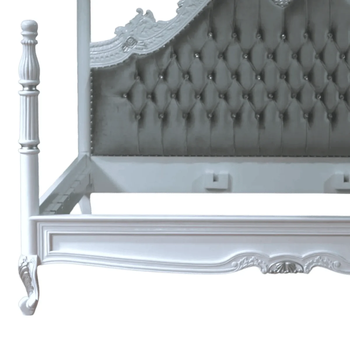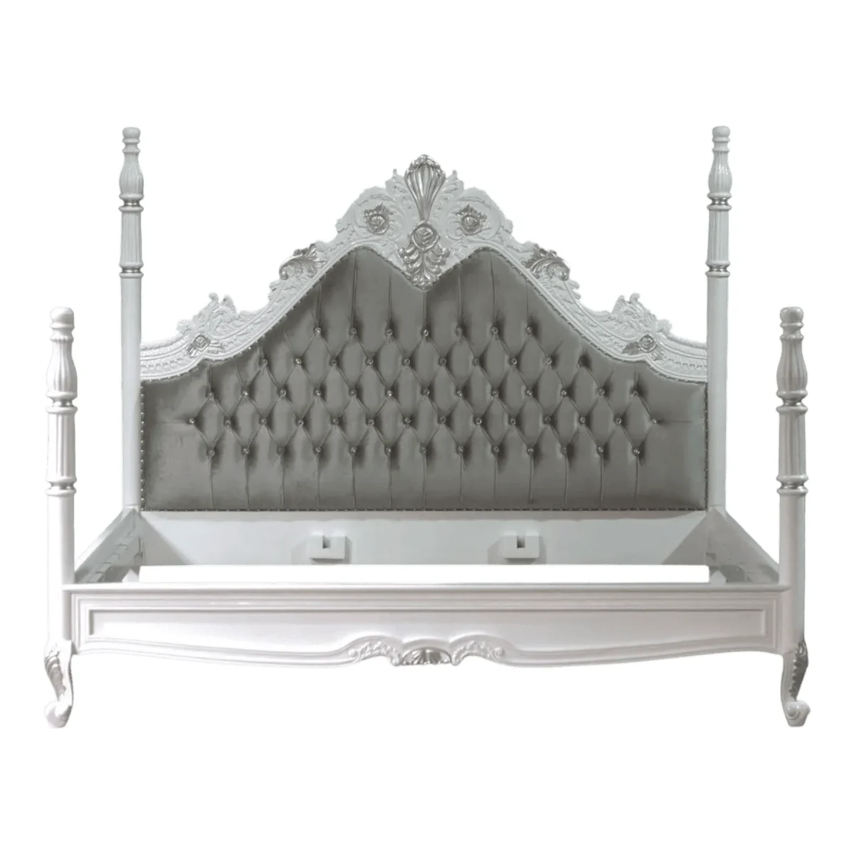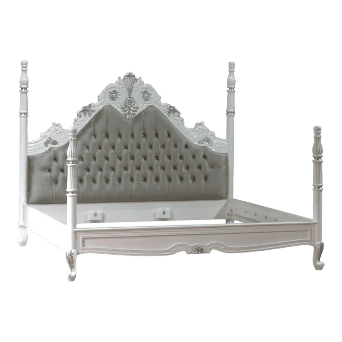 Create a whimsical and luxurious atmosphere with this ornate four-poster bed finished in a pristine antique white with silver-leaf highlights The towering fluted posts lead the eye upward while the massive arched headboard features plush grey diamond-tufted upholstery that provides a soft backdrop for relaxation Intricate carvings of roses and scrolling vines dance across the frame adding a layer of feminine charm and artistic depth This bed is designed to be the centerpiece of a romantic suite offering a sense of enclosure and grandeur that feels like a fairytale retreat The combination of the cool silver tones and the soft grey fabric creates a soothing palette that promotes restful sleep while maintaining an unmistakable air of high-end custom design that will enchant any guest who enters your private haven of comfort and style