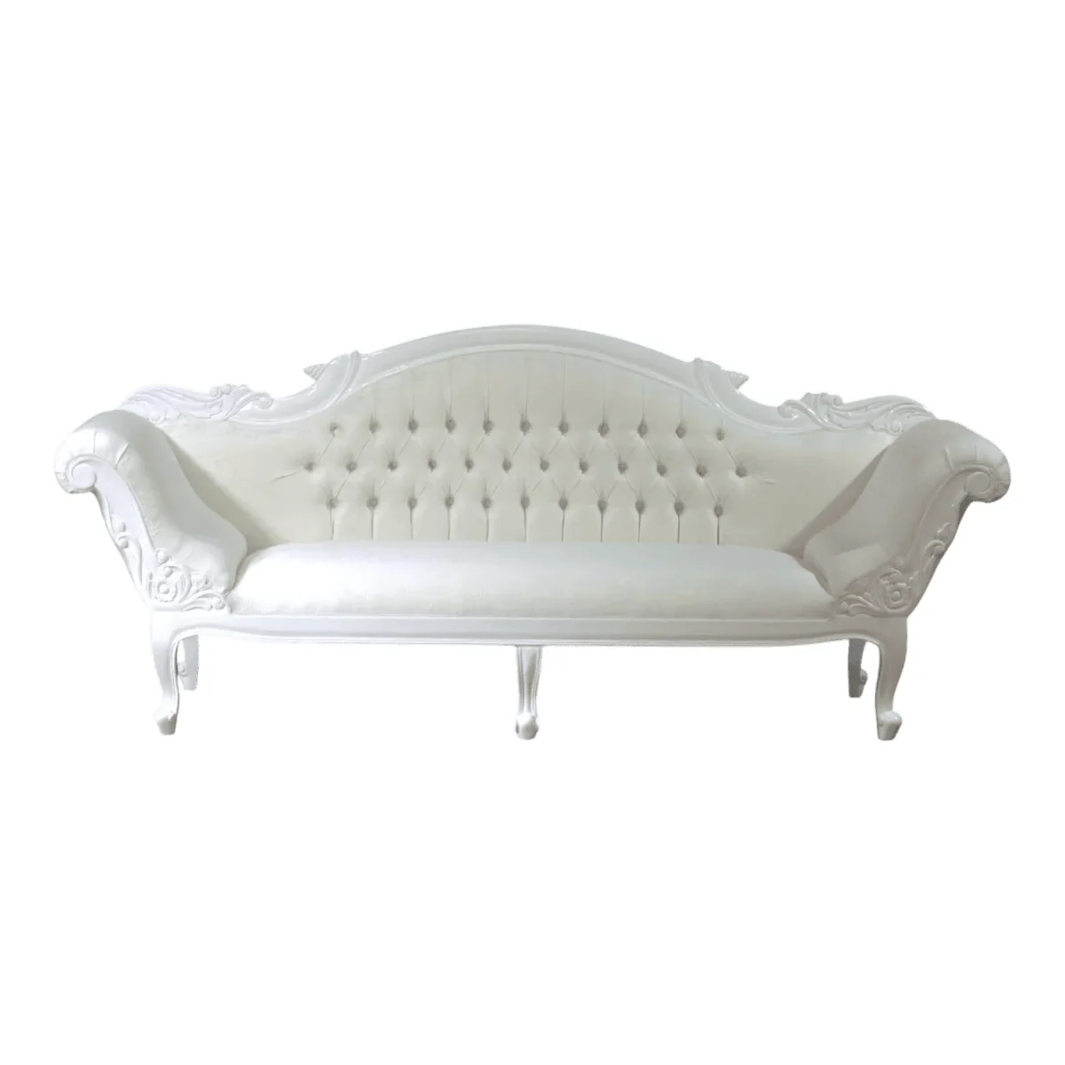 Exuding an aura of timeless grace the Royal Serpentine lounge features a fluid undulating backrest that wraps around into a single elegant scroll arm The frame is meticulously hand-carved with floral motifs and acanthus leaf details finished in a luminous pearl white that complements the shimmering upholstery The deep tufting on the interior back provides a classic tactile experience while the generous seat depth invites relaxation without sacrificing formal poise This lounge is perfectly suited for a master suite or a sophisticated parlor offering a luxurious sanctuary for afternoon repose and high-style lounging