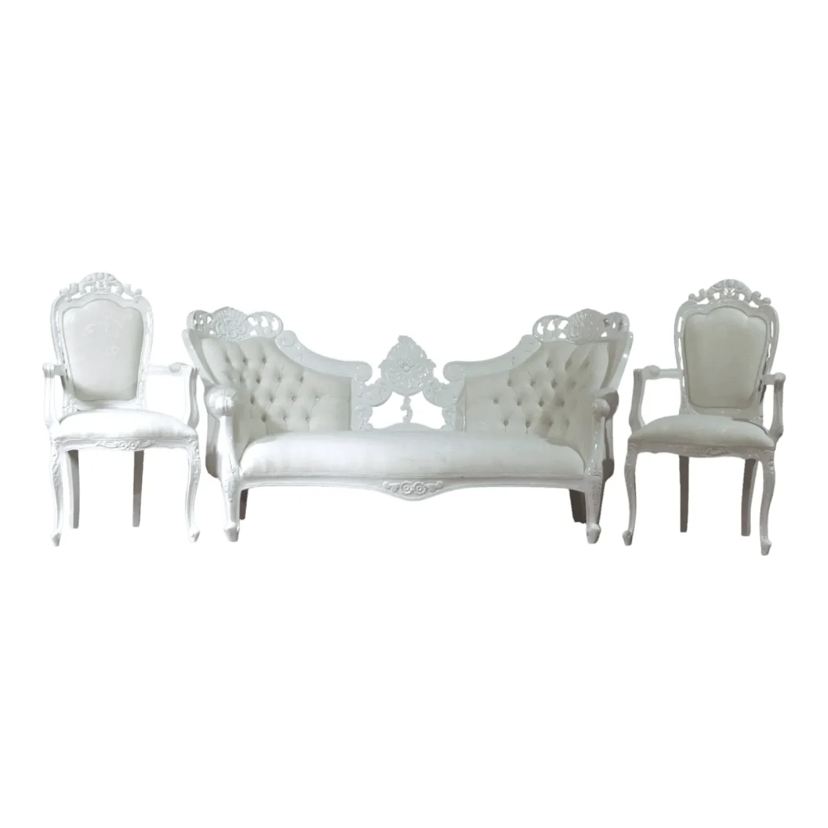 Commanding attention with its dramatic silhouette this hand-carved settee serves as a breathtaking focal point for any grand entryway or formal sitting room The design features a unique double-arched backrest connected by an ornate central medallion all rendered in a pristine high-gloss ivory finish that captures and reflects light Deep diamond tufting across the backrest adds both architectural depth and plush comfort while the subtle damask patterns in the upholstery offer a layer of sophisticated texture This piece is more than seating it is a sculptural celebration of neoclassical elegance designed for those who appreciate the finer details of historical artistry and modern luxury