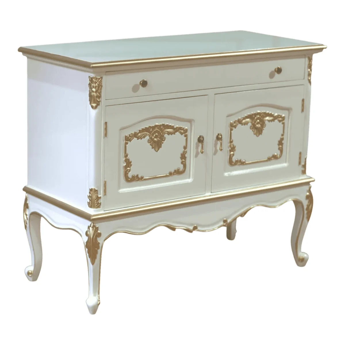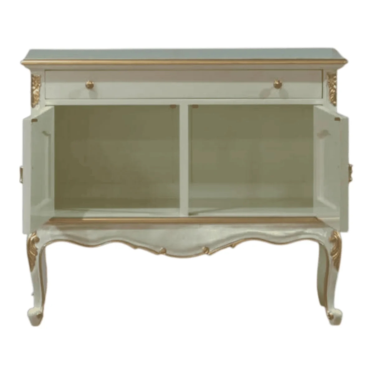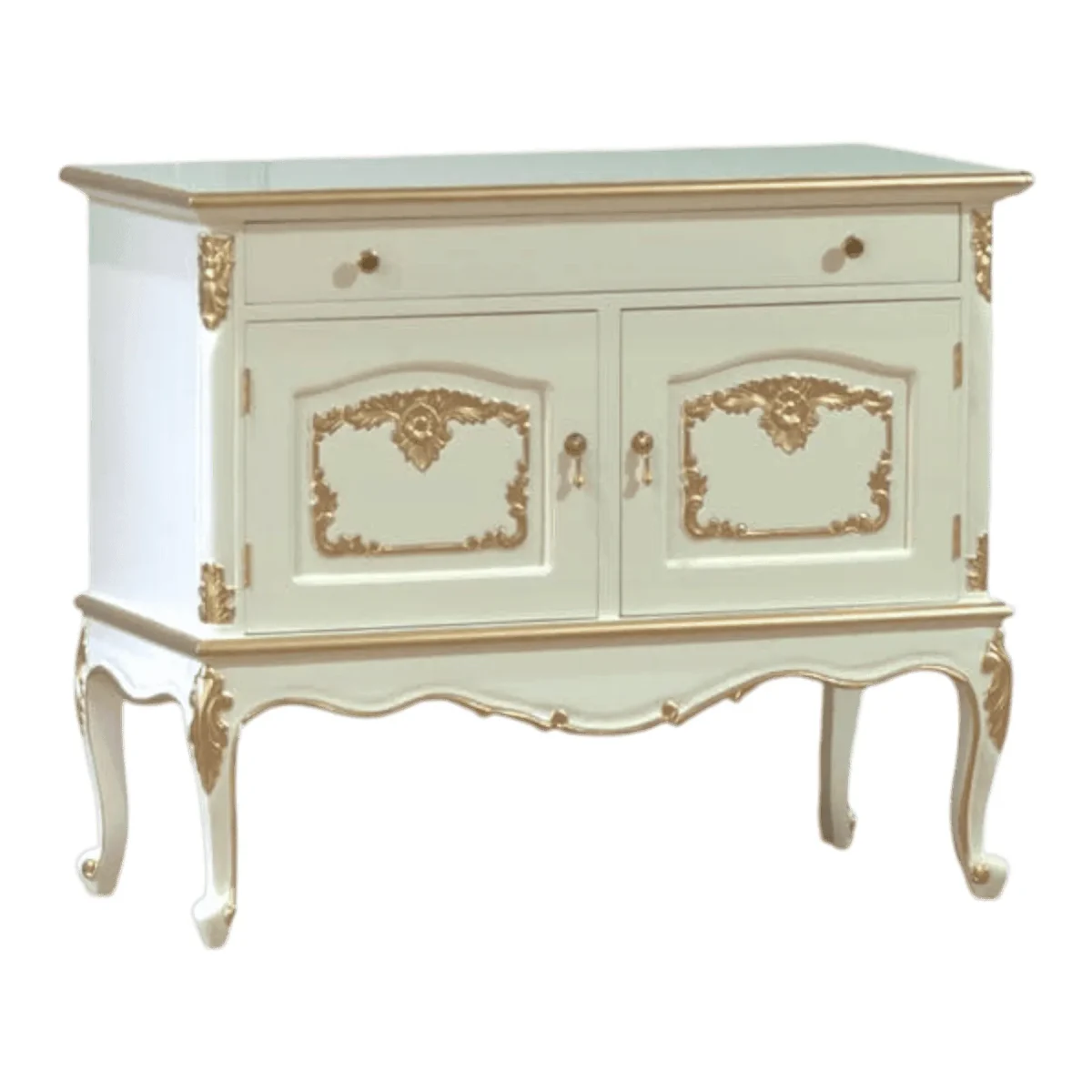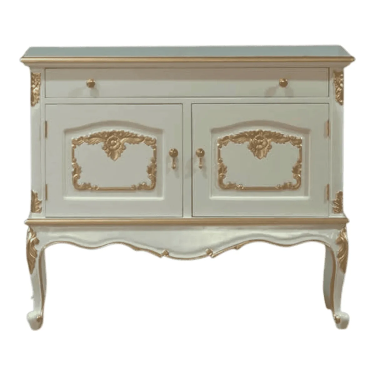 Perfectly proportioned for smaller apartments or cozy entryways this two-door credenza brings a concentrated dose of luxury to any corner of your home – the bright white finish provides a refreshing contemporary feel while the hand-applied gold carvings maintain a connection to classical design traditions – its wide single drawer and dual cabinets offer a surprising amount of storage for daily essentials keeping your space tidy and sophisticated – the elegant curves of the legs and the subtle scalloped apron at the base demonstrate a level of detail usually reserved for much larger statement pieces – use this as a media console a vanity base or a hallway catch-all to elevate the everyday experience of coming home to a space that feels curated and intentionally designed for beauty