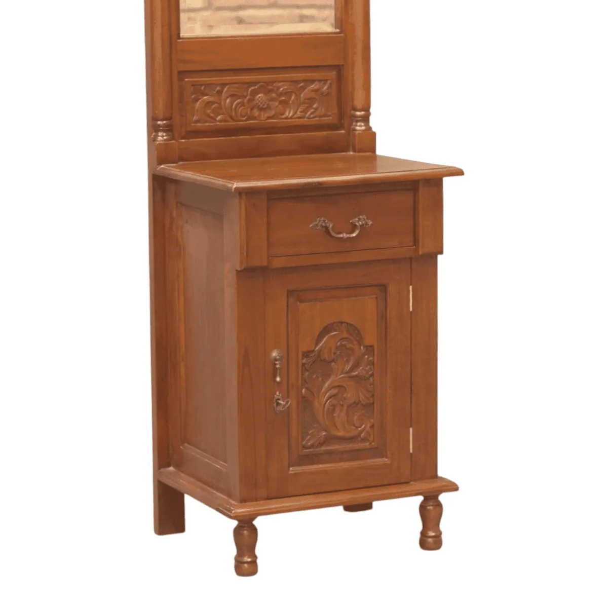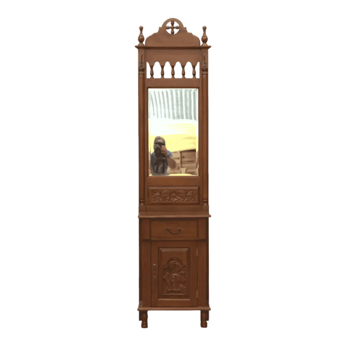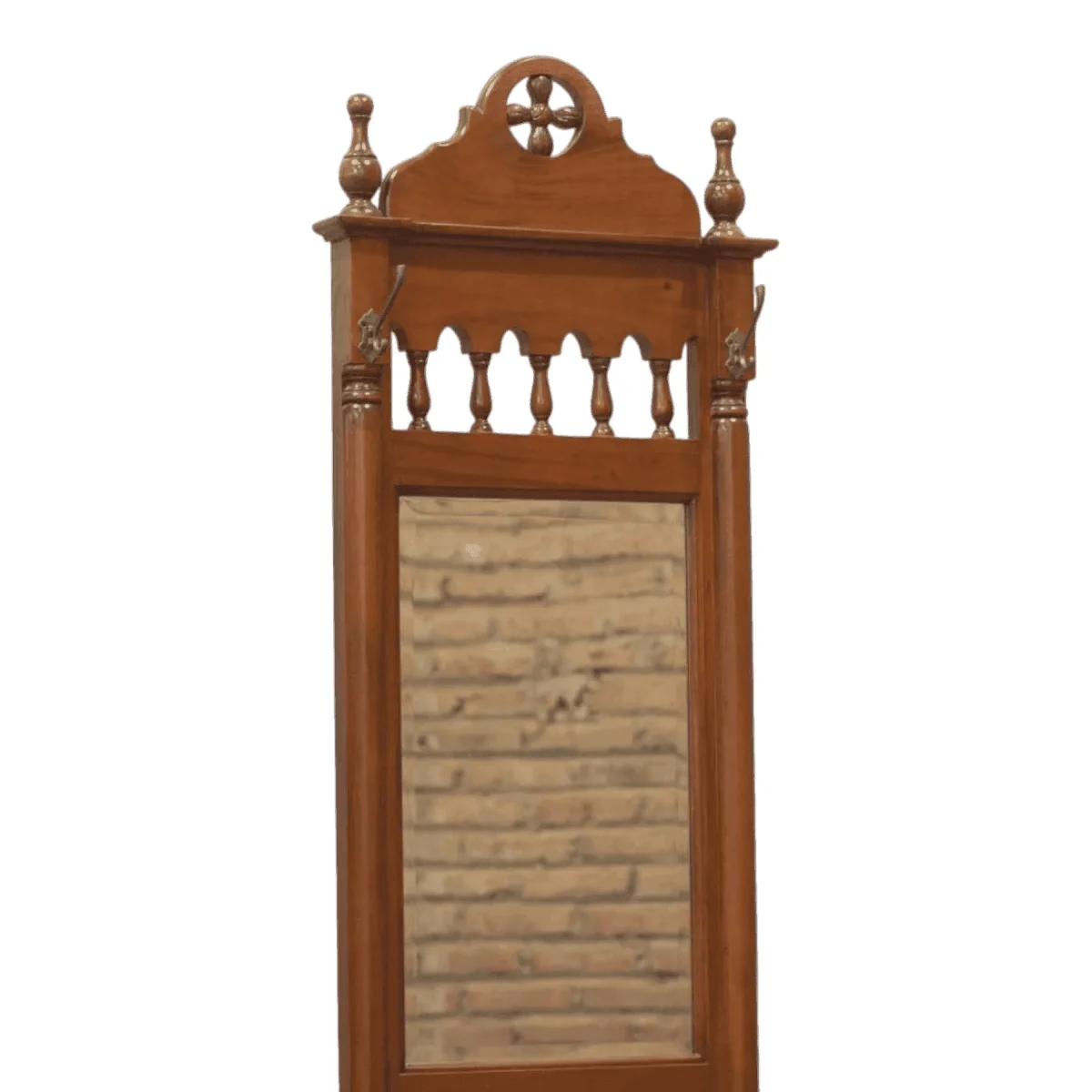 Make a dramatic first impression with this tall hall stand that echoes the architecture of gothic cathedrals The piece features a central mirror flanked by turned columns and topped with a pierced quatrefoil crest offering both reflection and style Practical elements include hooks for coats a central drawer for keys and a lower cupboard decorated with a relief-carved panel providing a compact organizational hub for the entryway
