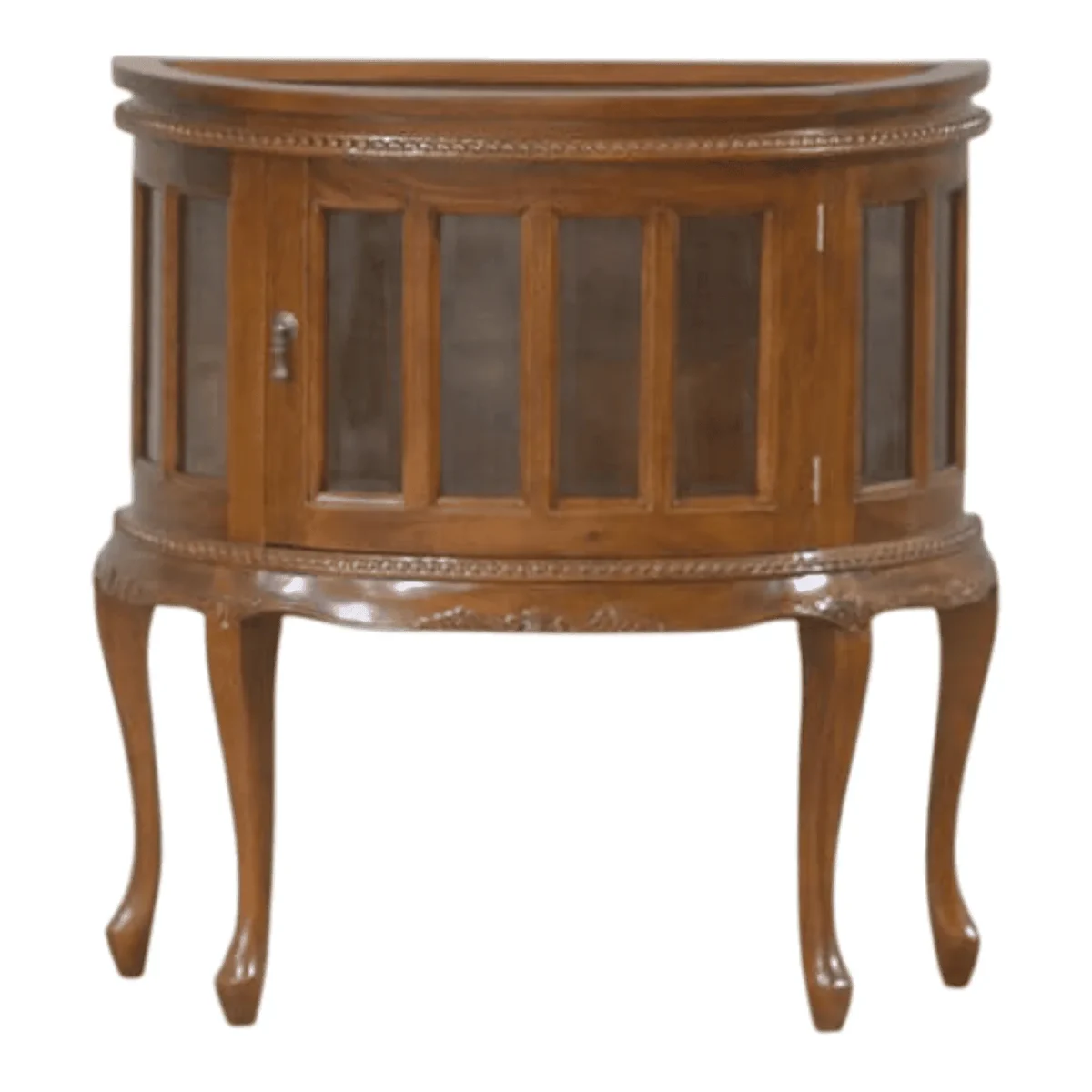 Showcase your most precious curiosities within the elegant curves of this boutique vitrine cabinet designed for the discerning collector Featuring a unique semi-circular profile and crystal-clear glass panels this piece offers a panoramic view of your treasures from every angle The slender cabriole legs provide a sense of weightless grace while the hand-rubbed wood finish adds warmth and depth to your interior decor Whether placed against a wall or used as a subtle room accent this vitrine combines the charm of antique French furniture with a clean silhouette suited for contemporary homes It serves as a sophisticated stage for heirlooms jewelry or fine china protecting them while ensuring they remain the center of attention in any room Experience the harmony of traditional joinery and architectural transparency in a piece built for lasting beauty and daily inspiration