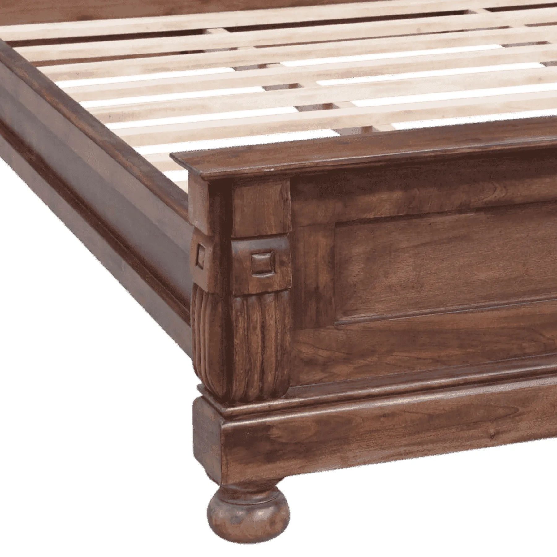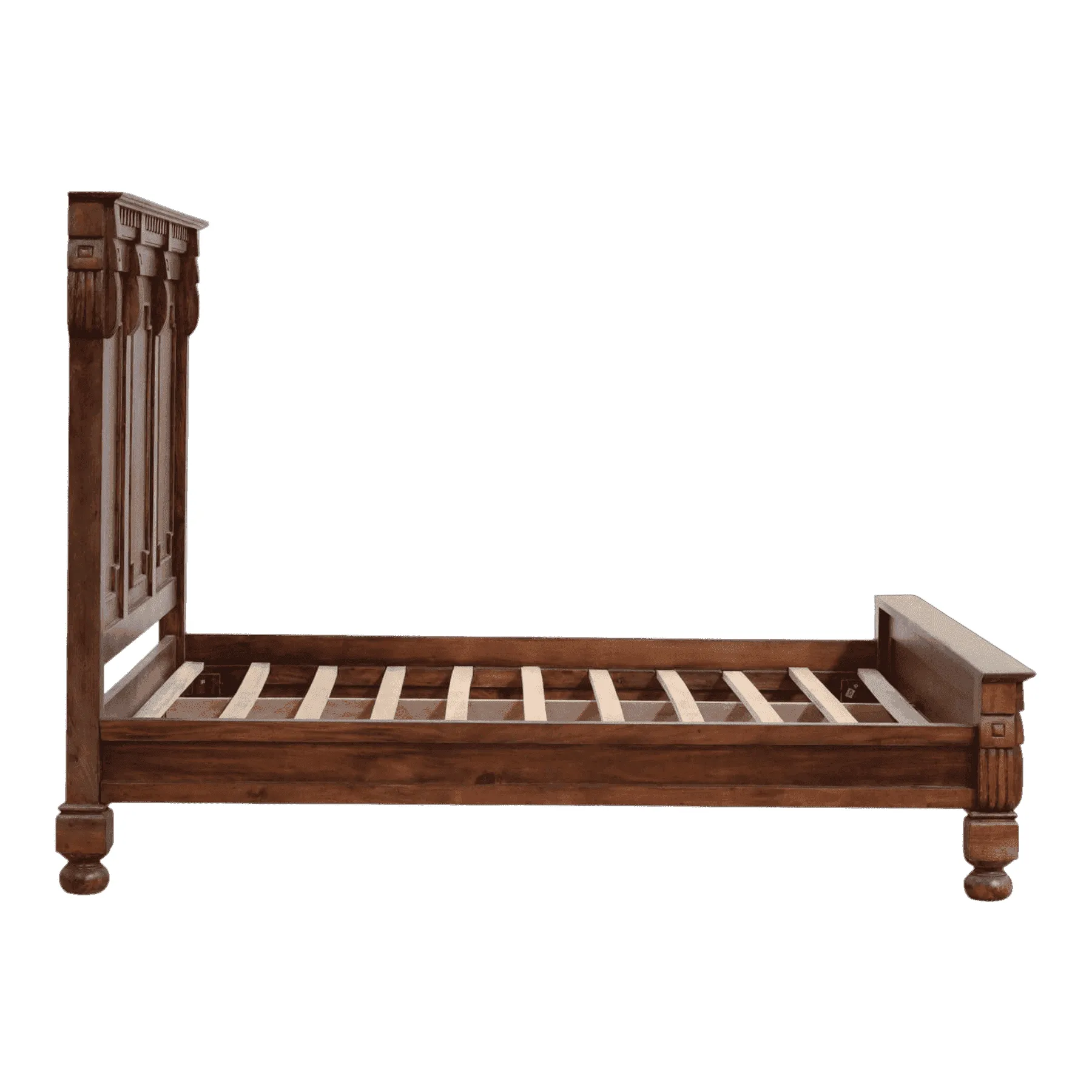 Anchor your bedroom with the architectural grandeur of this Empire-style bed The massive headboard features three recessed panels, framed by fluted, carved columns and decorative corbels The substantial footboard and bun feet echo this classic, powerful design Crafted from solid wood with a deep, dark finish, this is an heirloom-quality centerpiece