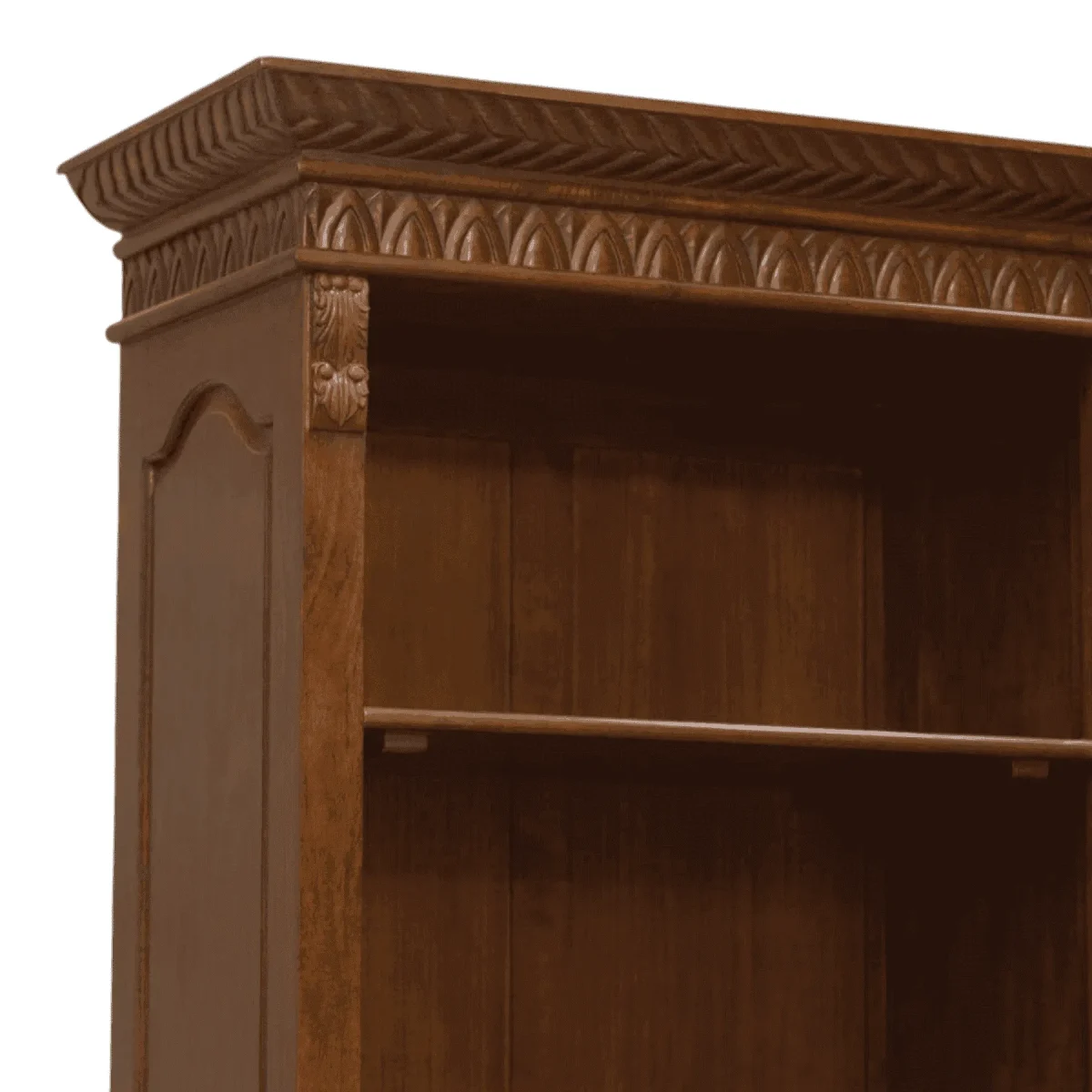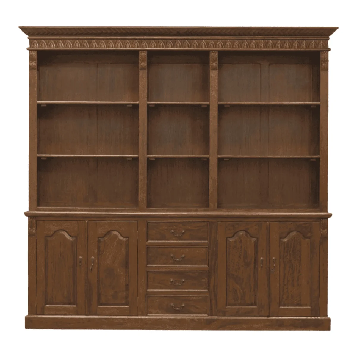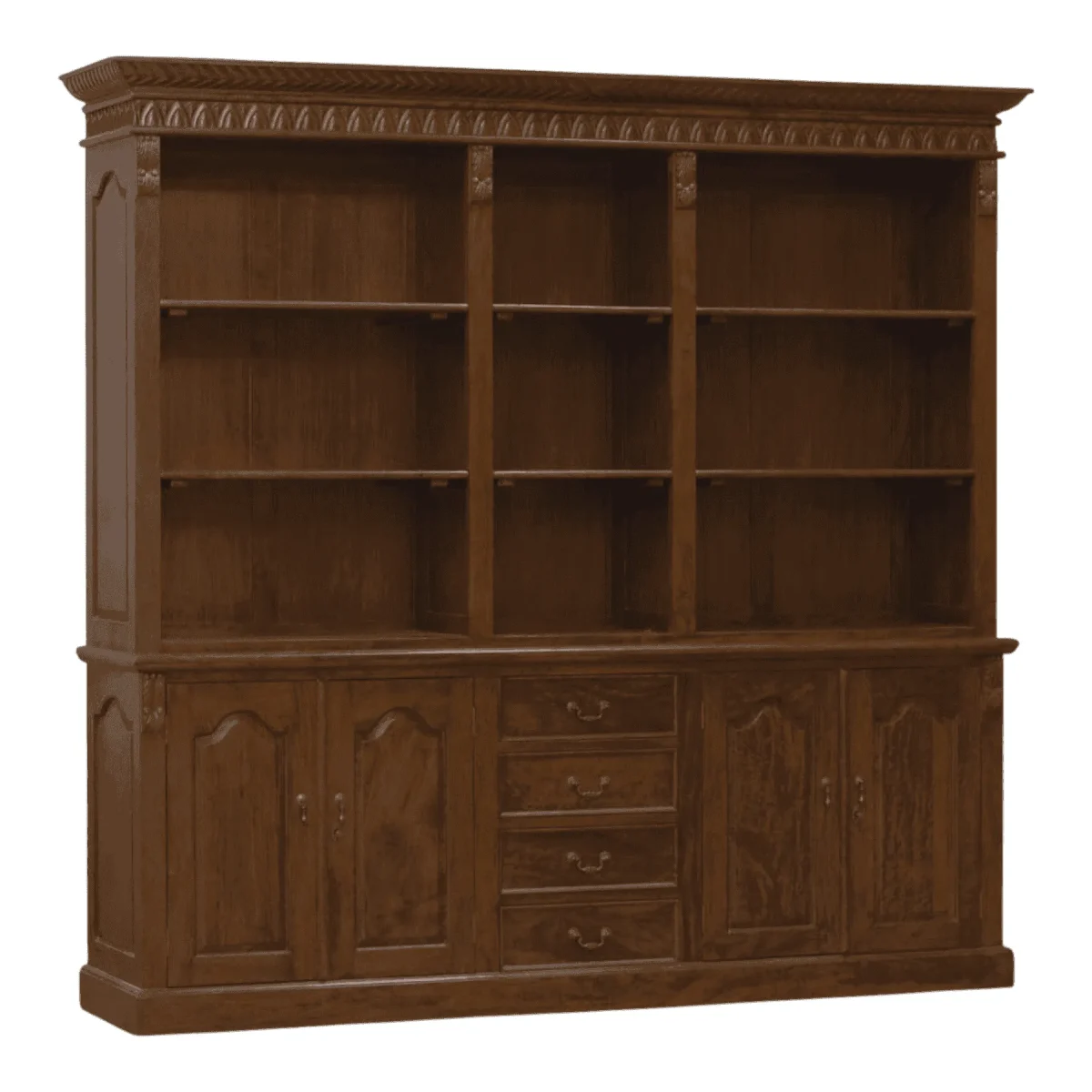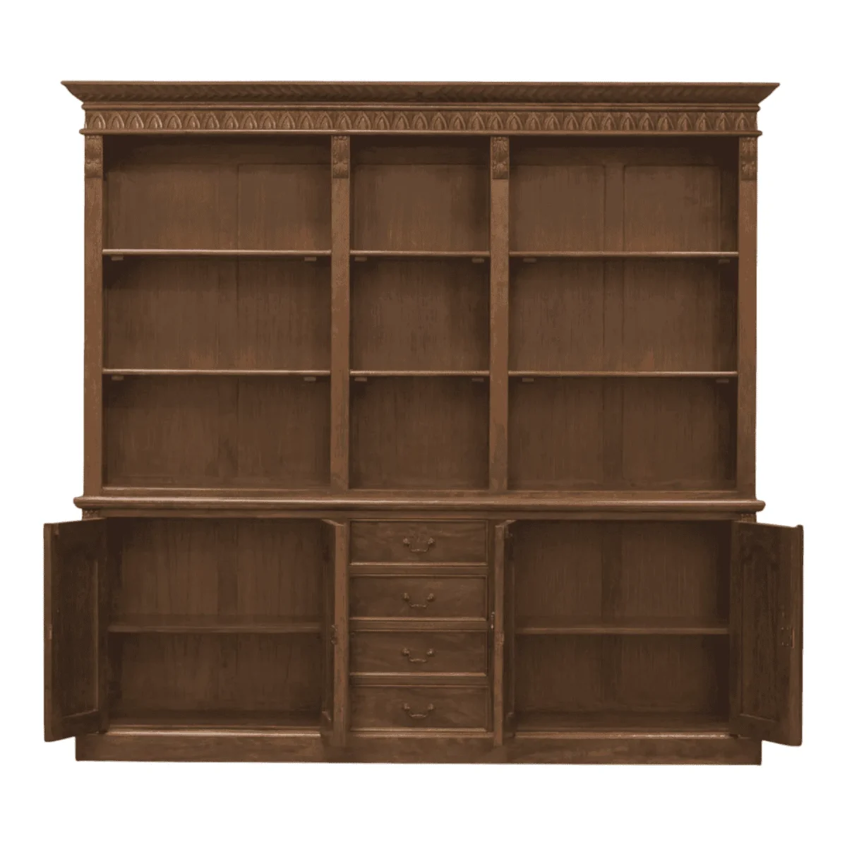 Command authority in your study or living area with this monumental library wall unit that exudes old-world charm The piece features a towering upper section with three open bays of adjustable shelving perfect for displaying an extensive book collection or treasured artifacts Below the unit offers substantial concealed storage through four paneled cabinet doors and a central bank of four graduated drawers ensuring clutter remains out of sight Detailed with a carved cornice and fluted pilasters this bookcase is a permanent architectural addition to any home