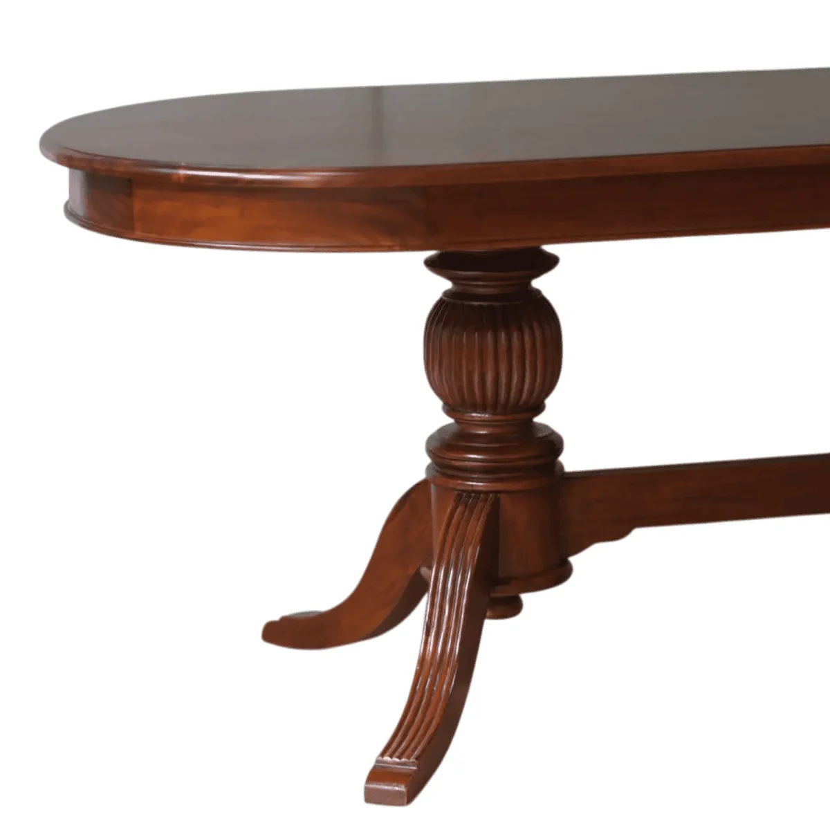 Create a focal point for family gatherings with this magnificent oval dining table defined by its robust twin pedestal base and elegant splayed legs Each pedestal is meticulously carved with vertical fluting and rounded bulbous accents providing both immense structural stability and a refined neoclassical aesthetic The expansive oval top offers a smooth seamless surface finished in a warm amber stain that celebrates the complex swirling grain patterns of premium teak wood This table is designed to facilitate intimate conversation and grand banquets alike accommodating larger groups without the interference of corner legs Crafted with traditional joinery techniques the piece ensures a wobble-free experience and enduring quality Whether placed in a sunlight-drenched breakfast nook or a formal candlelit dining hall this table exudes an aura of warmth and handcrafted luxury that defines a well-appointed home