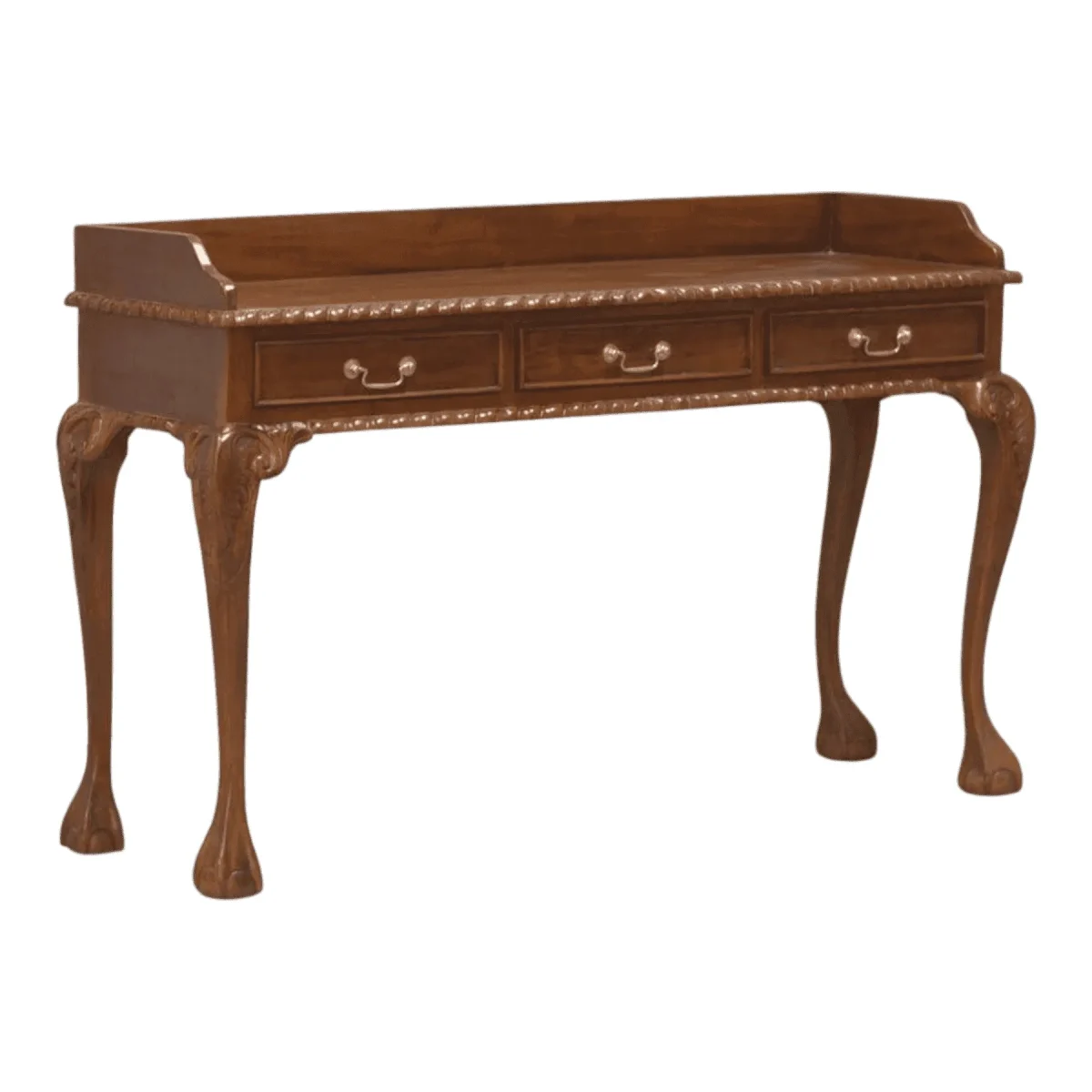Defined by its distinctive raised gallery rail this console table merges utility with decorative artistry preventing items from slipping while adding a sophisticated vertical profile The piece showcases three slim drawers adorned with brass swan-neck handles sitting atop elegantly carved cabriole legs with acanthus leaf detailing at the knees Ideal for entryways or as a refined writing station this table exudes a sense of old-world charm and artisanal precision