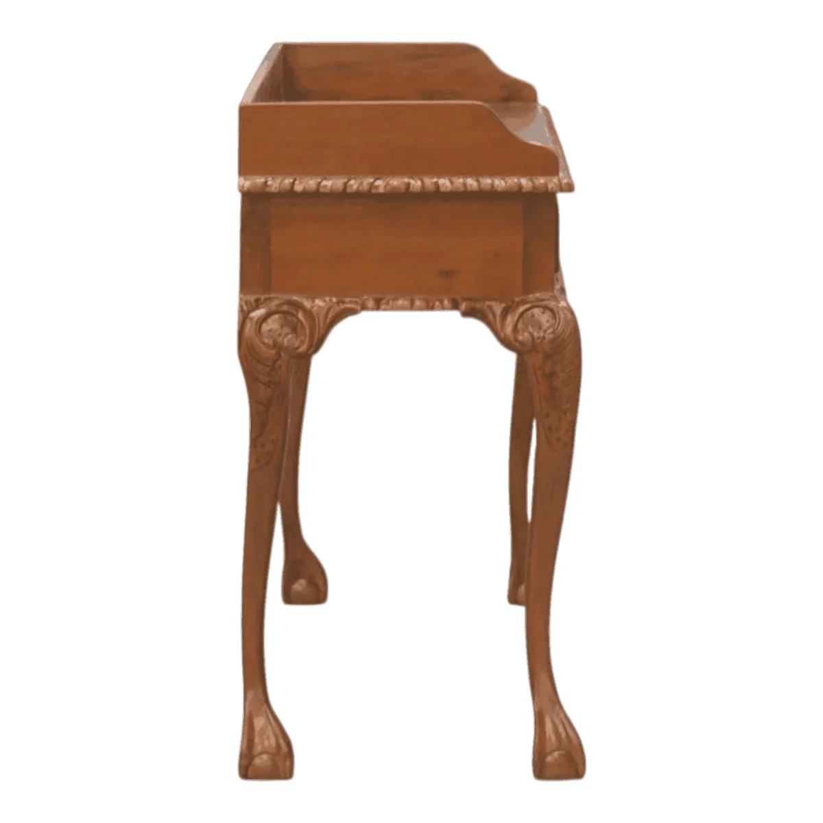 This design draws upon Queen Anne influences focusing on the S-curve leg line and the functional elegance of the gallery top It serves as a transitional piece that bridges the gap between heavy storage furniture and delicate display tables