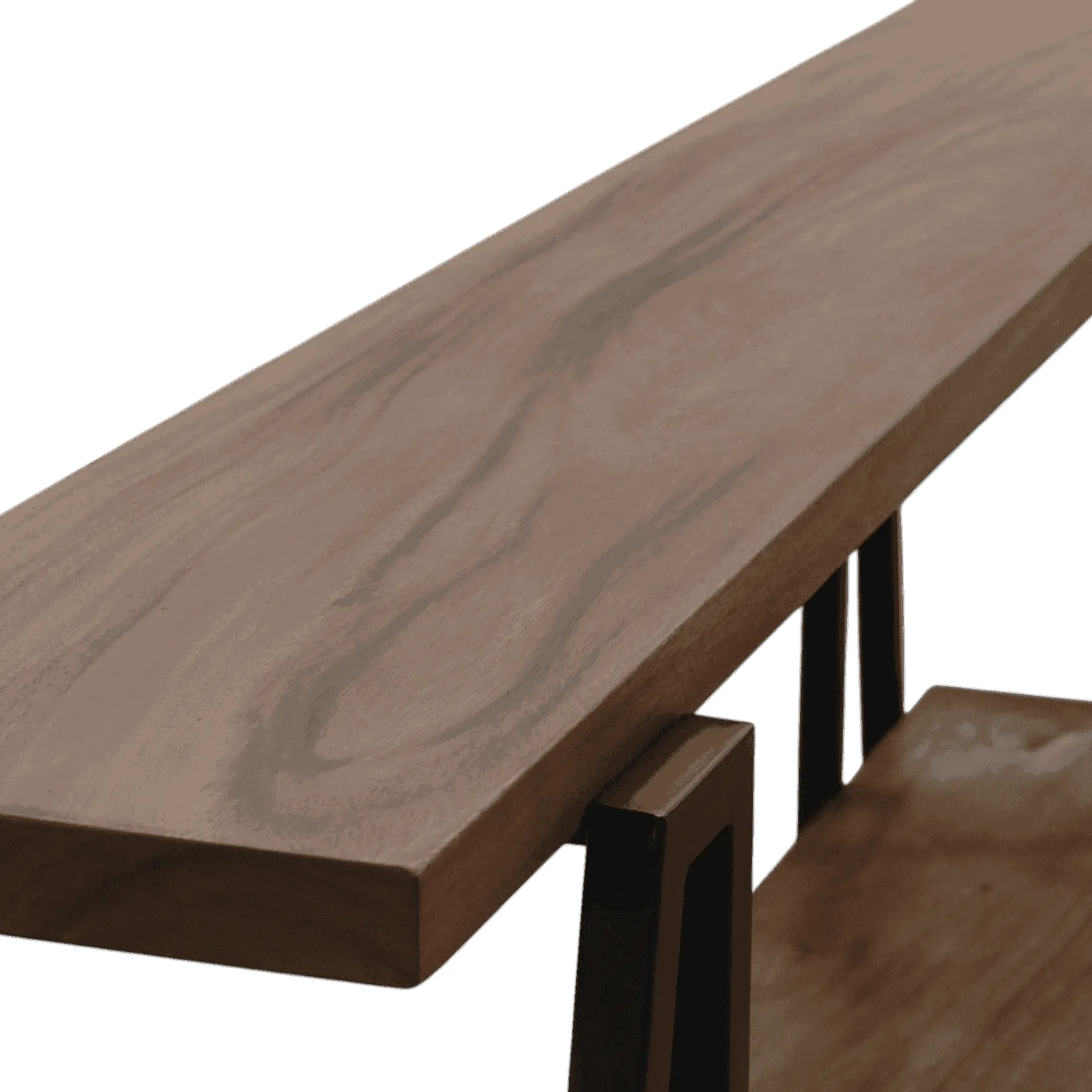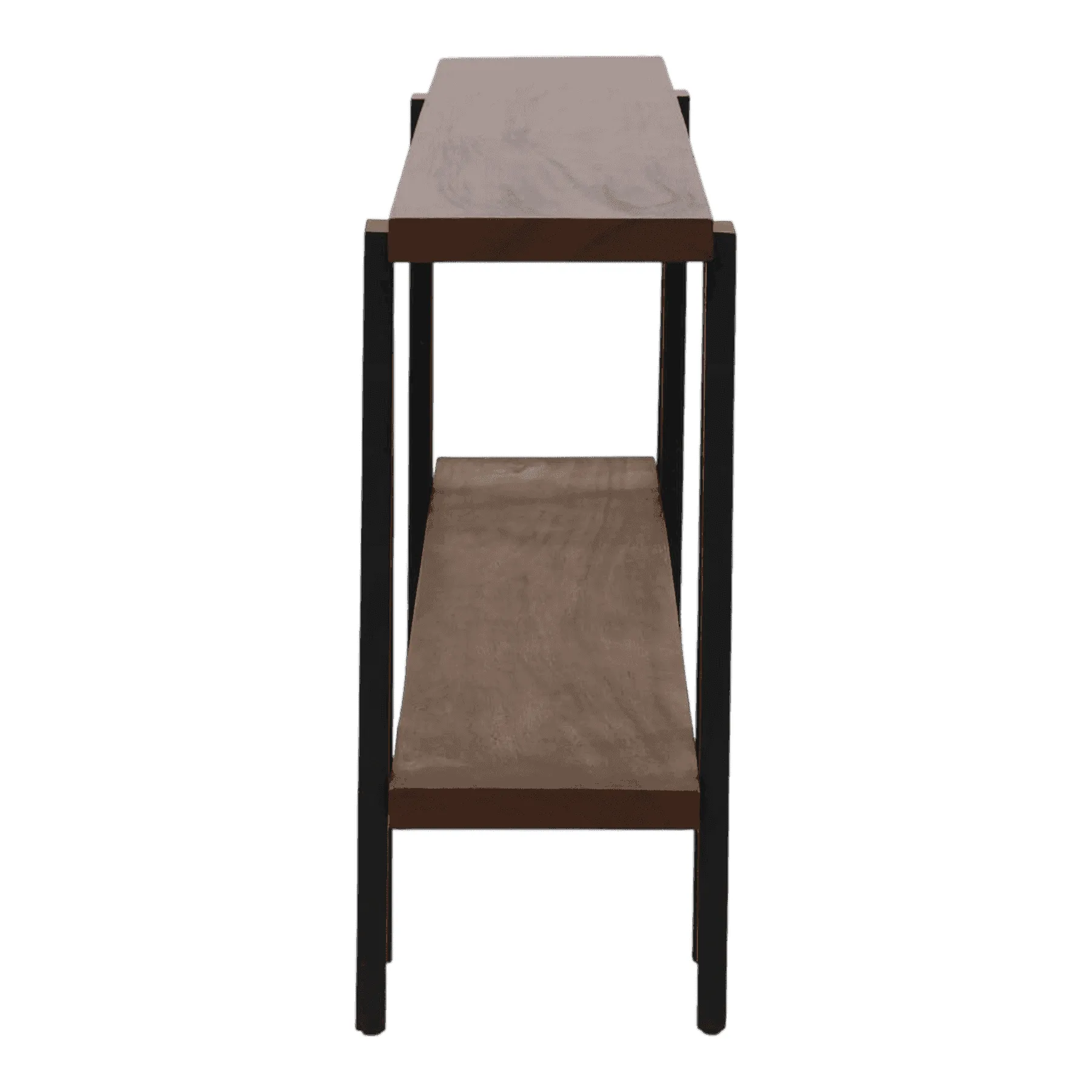 This console table is a perfect blend of rustic and industrial style Two thick wooden shelves, finished in a dark, warm tone, provide ample space for display and storage The shelves are supported by a strong, black metal frame with an “A-frame” or sawhorse design, giving it a sturdy, architectural look It’s a versatile piece for an entryway, living room, or as an industrial-chic sofa table