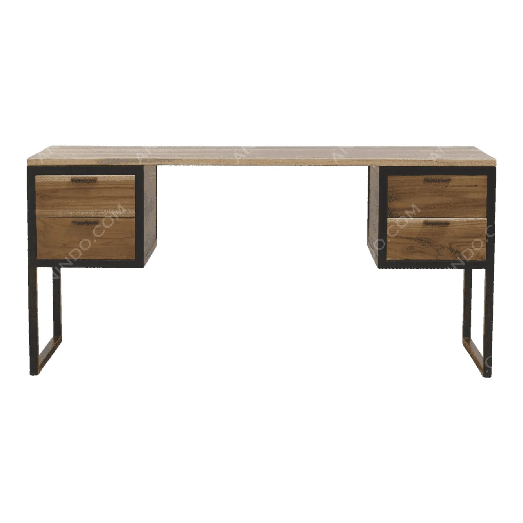 Maximize your productivity with this robust industrial-style desk It features a spacious floating wood top spanning two storage pedestals Each pedestal contains two deep drawers providing ample organization for office essentials The structure is framed in sturdy black metal with sled-style legs offering a striking contrast to the warm natural grain of the wood faces This desk balances heavy-duty utility with a sleek open aesthetic