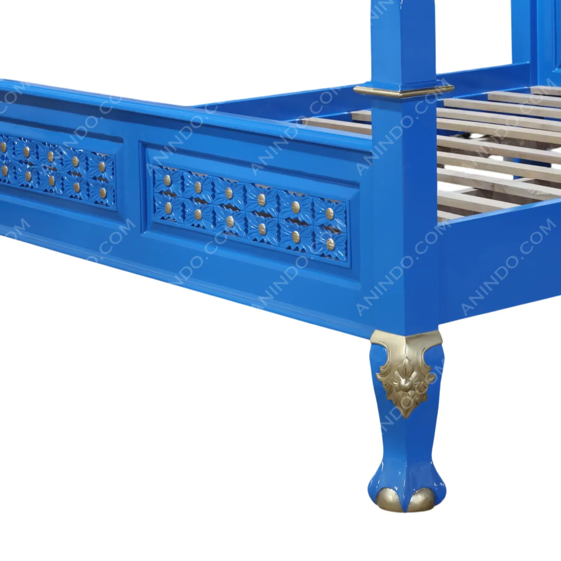 Primary Frame: Solid Mahogany Wood | Joinery: Four-poster construction, mortise and tenon | Finish: High-gloss cobalt blue lacquer with gold-gilt paint accents | Details: Carved/fretwork panels