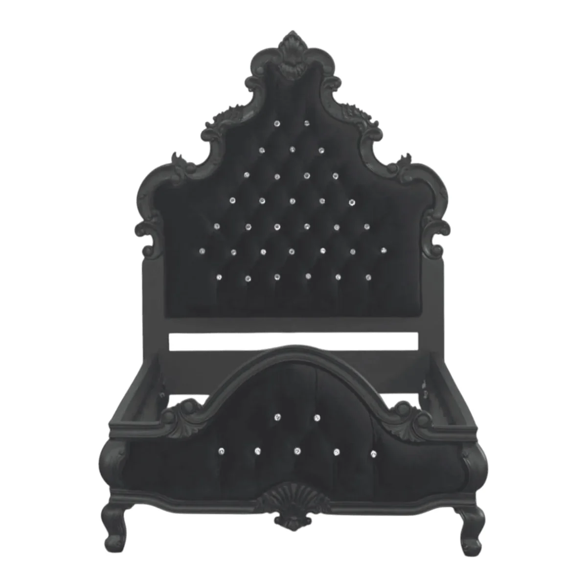 For those who appreciate the beauty of the dark side this shadow bedstead offers a monochromatic masterclass in texture and form The towering headboard is upholstered in deep black velvet and punctuated with silver studs that glisten like stars in a midnight sky Every inch of the mahogany frame is finished in a matching matte black allowing the intricate carvings and shapely silhouette to speak for themselves This bed provides a moody yet sophisticated atmosphere perfect for a modern gothic or industrial chic bedroom The high-quality materials and expert joinery ensure that this statement piece is as durable as it is visually arresting offering a secure and stylish foundation for your sleep